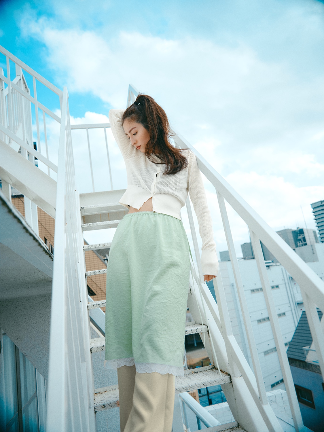 今回のコラボで一番最初に作りたいと思ったのが“あぐらをかけるスカート”でした。スカートを穿きたい日だって、ソファや椅子に足を乗せたいときもありますよね…(笑)。これはあぐらがかけるほどストレッチが効いていて、とにかくラク。それでいてシルエットが綺麗で、立ち姿の佇まいはスマート。パンツと同じく、ウエストは細いベルト、深めのポケットを採用しました。