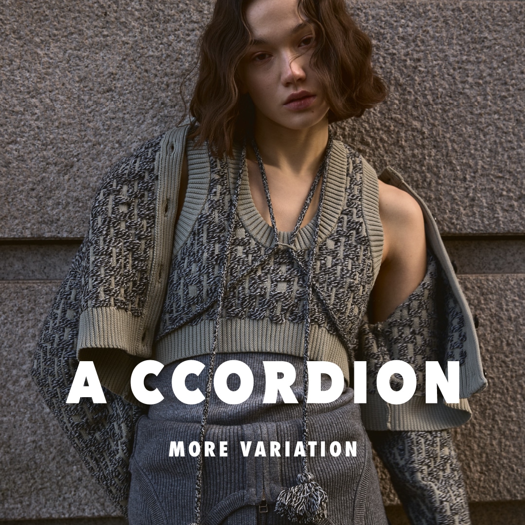 ニットの持つ繊細さ、強さ、しなやかさを様々な表情で魅せる〈A CCORDION〉。