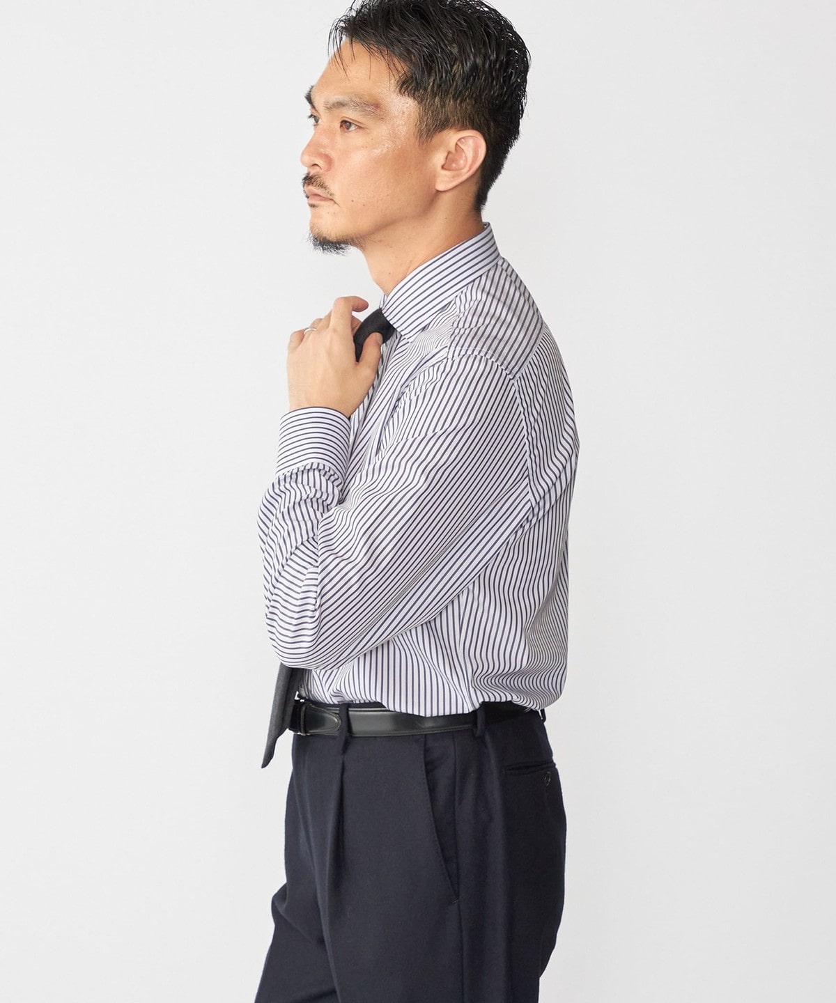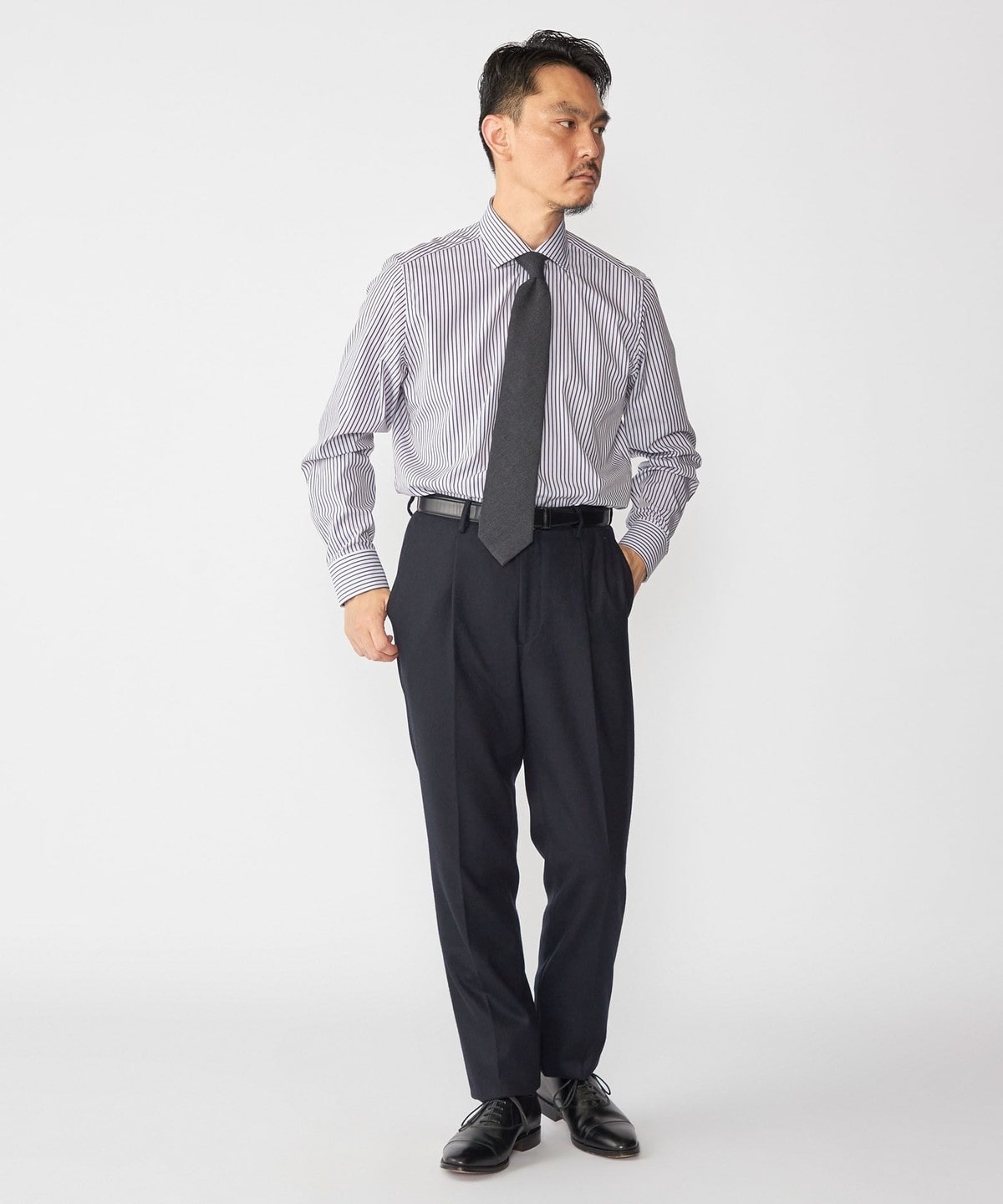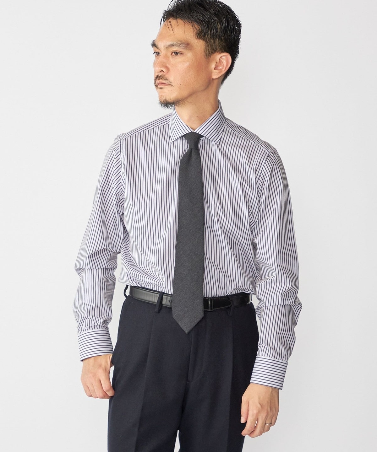 万能なワイドカラーシャツなので様々なスタイリングにマッチします。