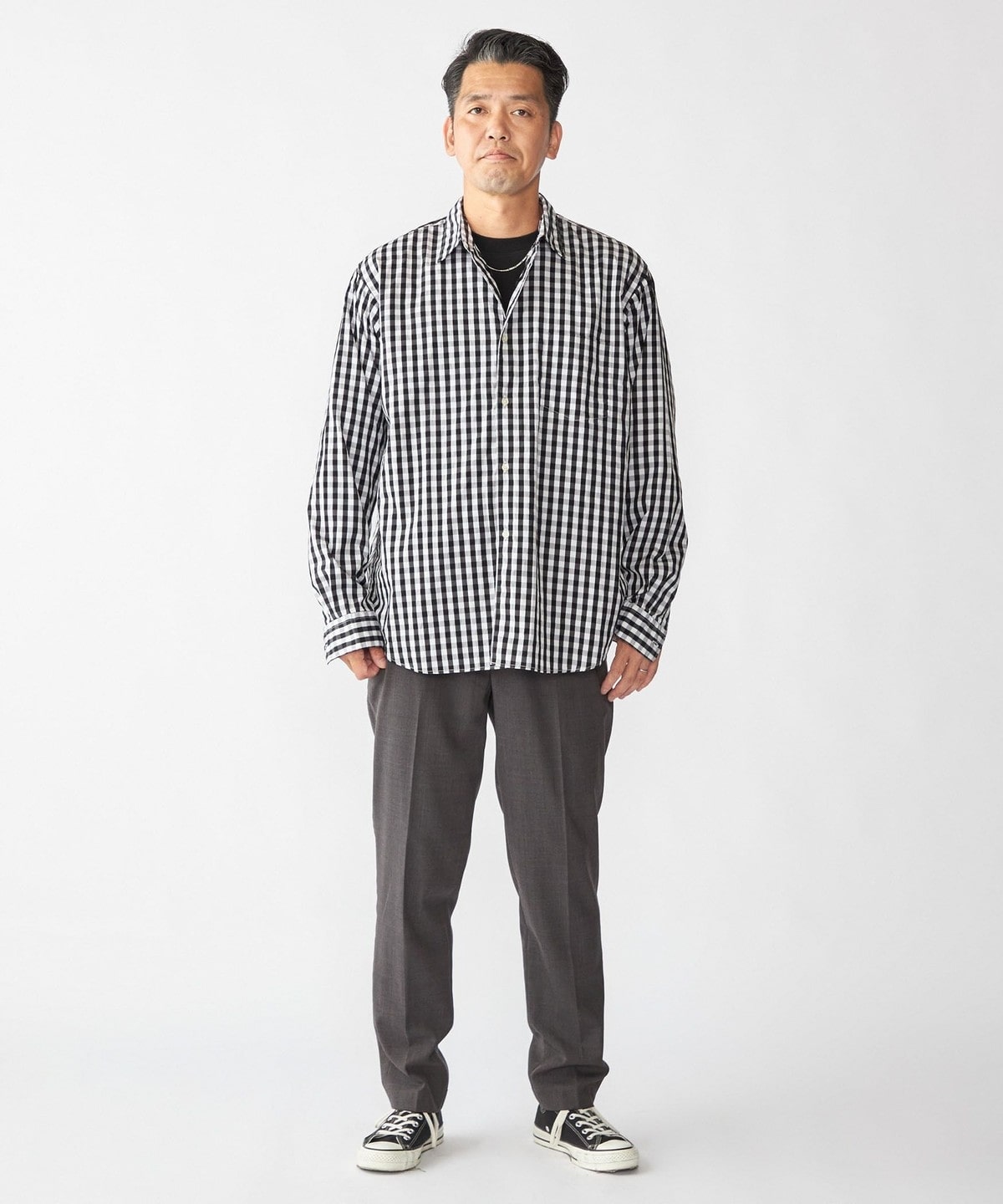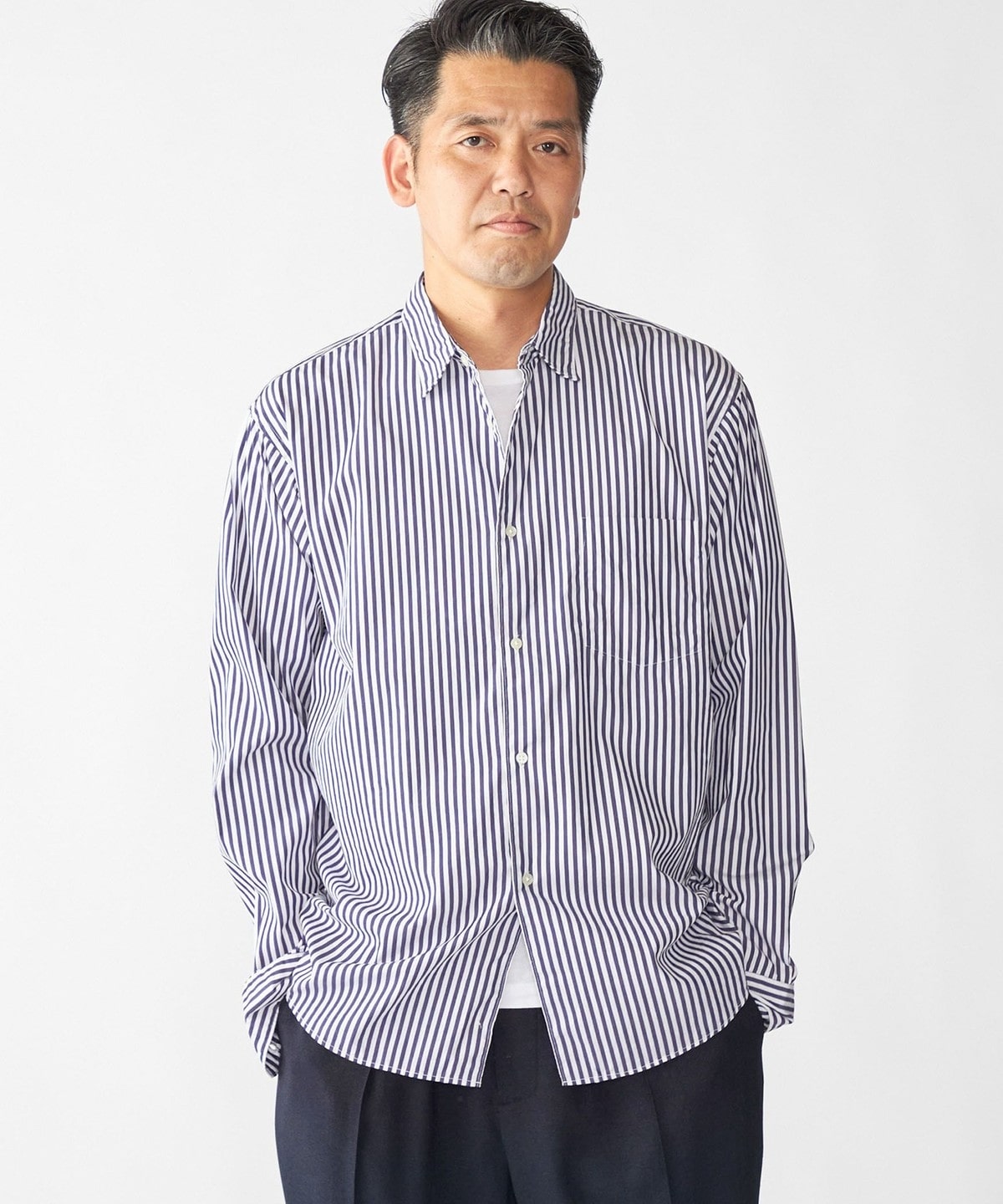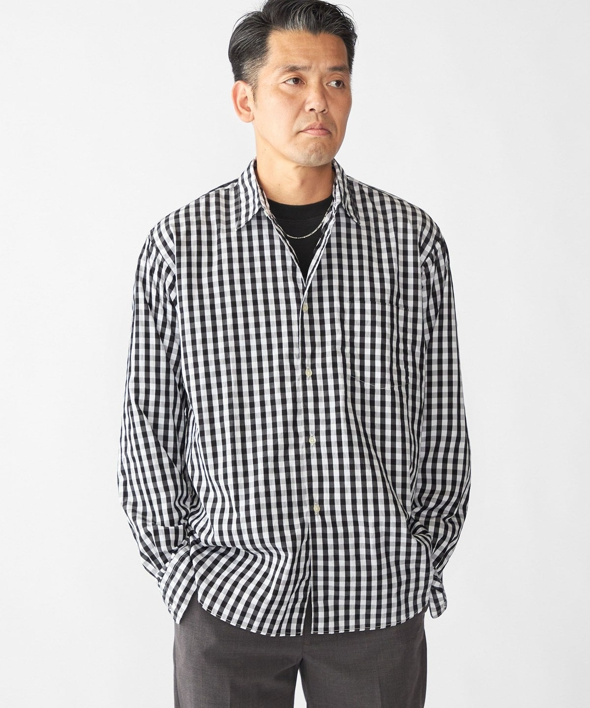 ドレスとカジュアルの中間的な立ち位置で仕上げたレギュラーカラーシャツ。