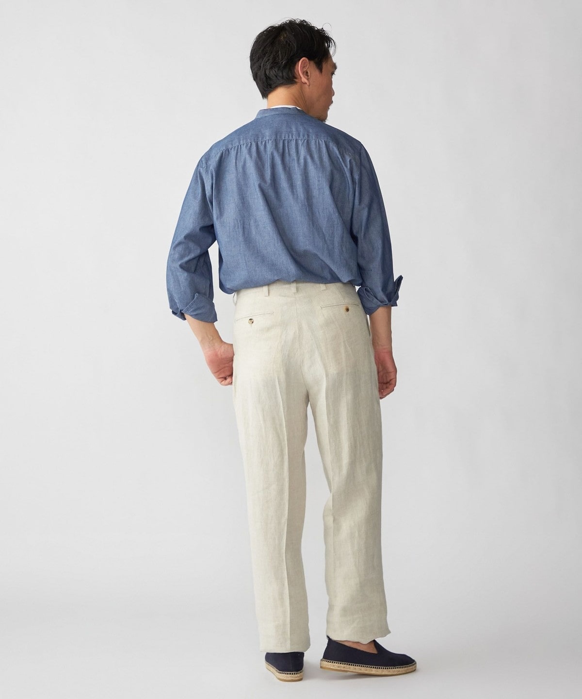 タックアウトをする場合はシャツのゆったりとしたシルエットに合わせて、ワイドシルエットのパンツをお選びいただくのがおすすめ。
