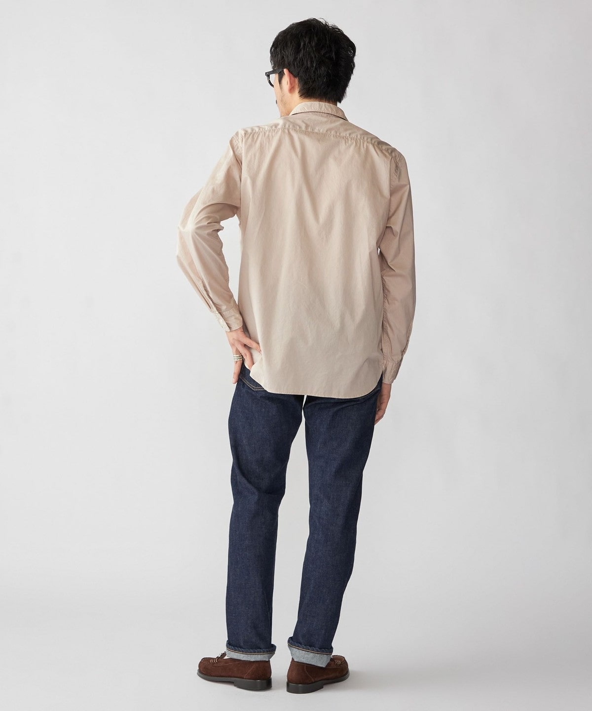 製品で全体に洗いを強くかけて、縫い目のパッカリングが強く出るようにして、気取らず着られるシャツに仕上げました。