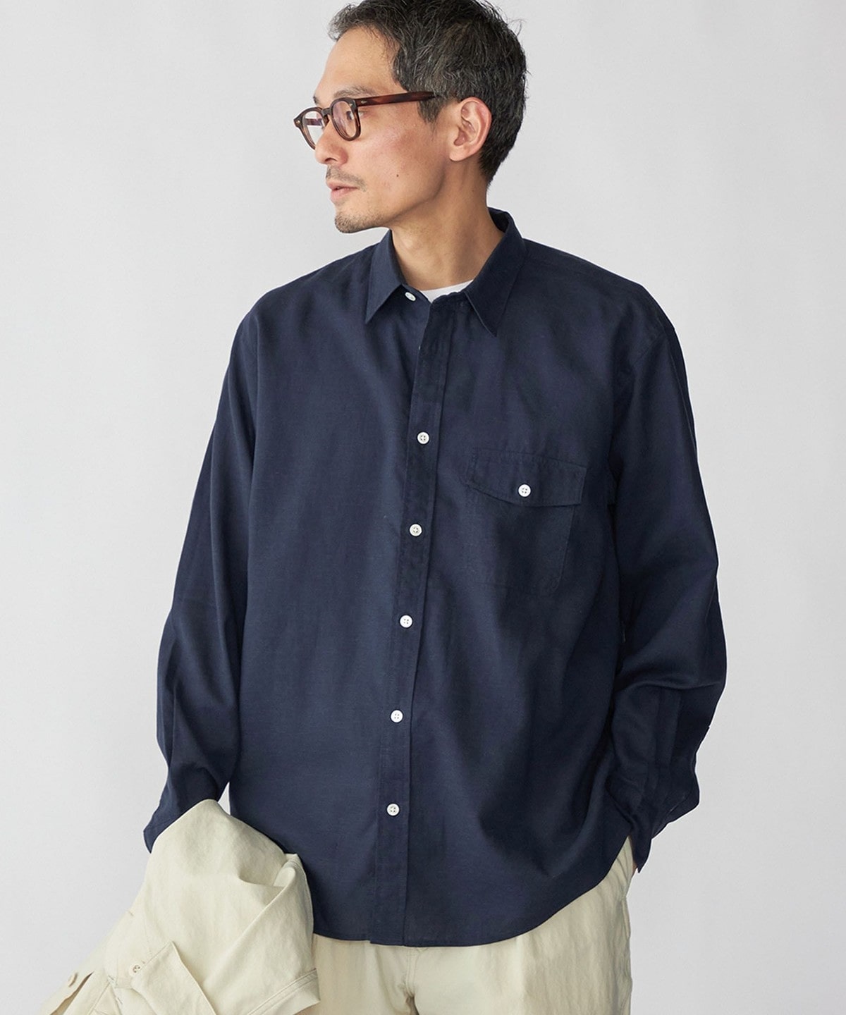5. SHIPS: リネン オーバー レギュラーカラー シャツ ネイビー