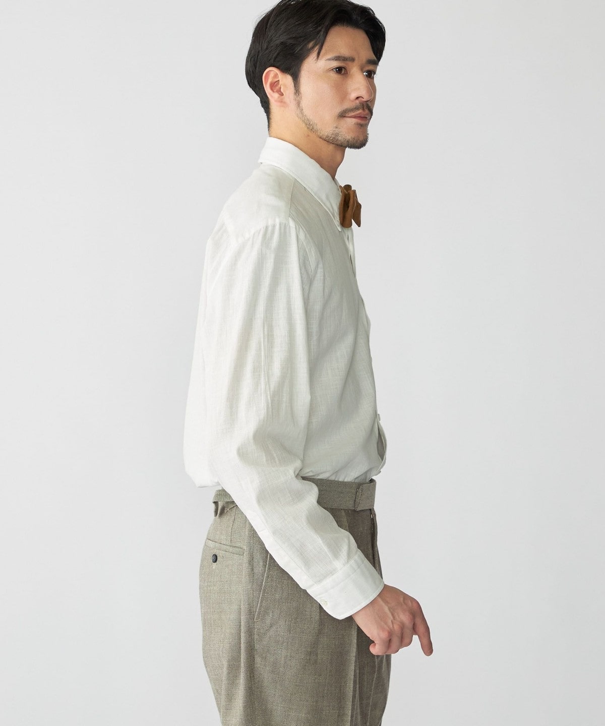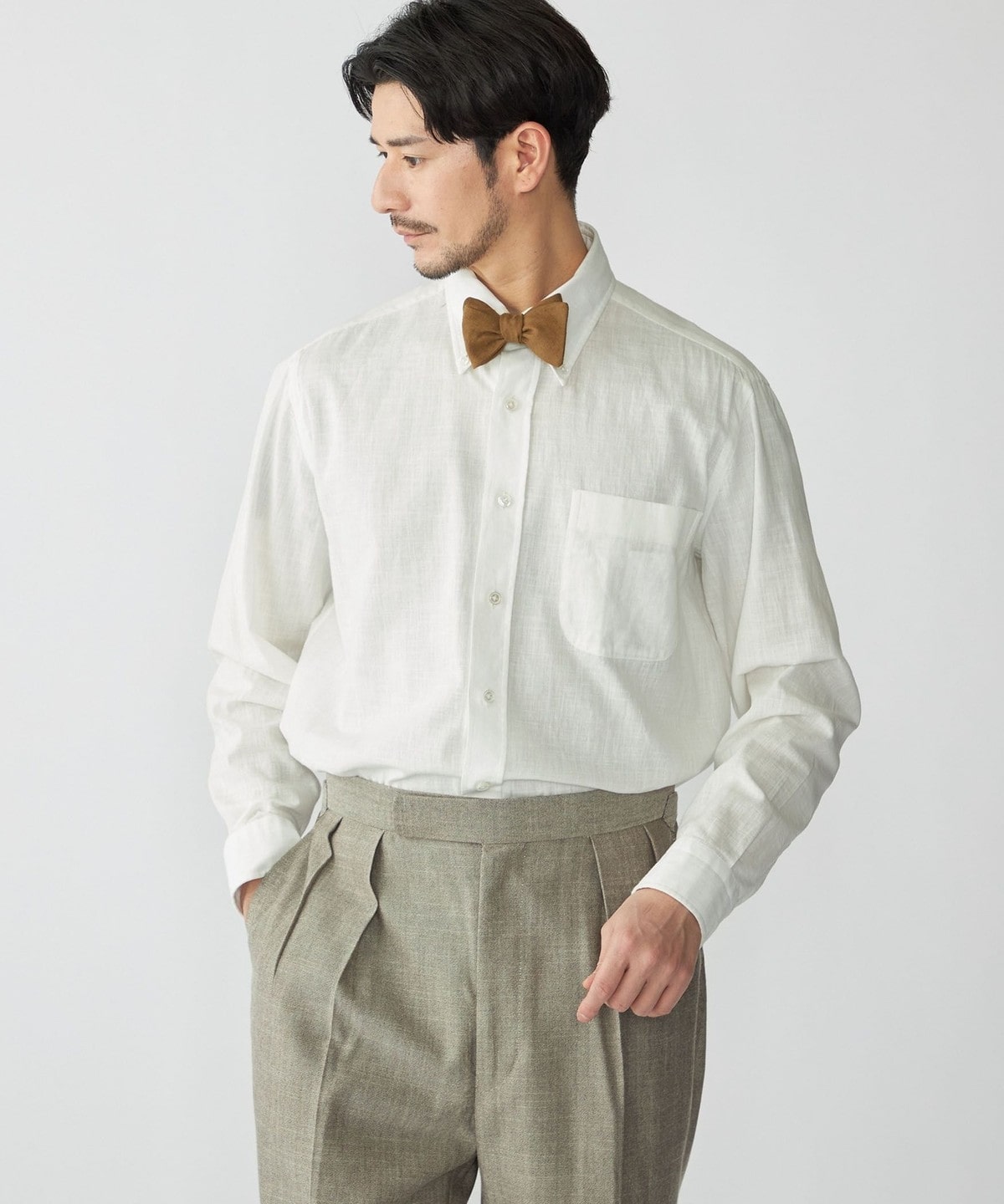 リネンの蝶ネクタイを合わせればややカジュアルな雰囲気のあるサマーフォーマルスタイルを作ることもできます。