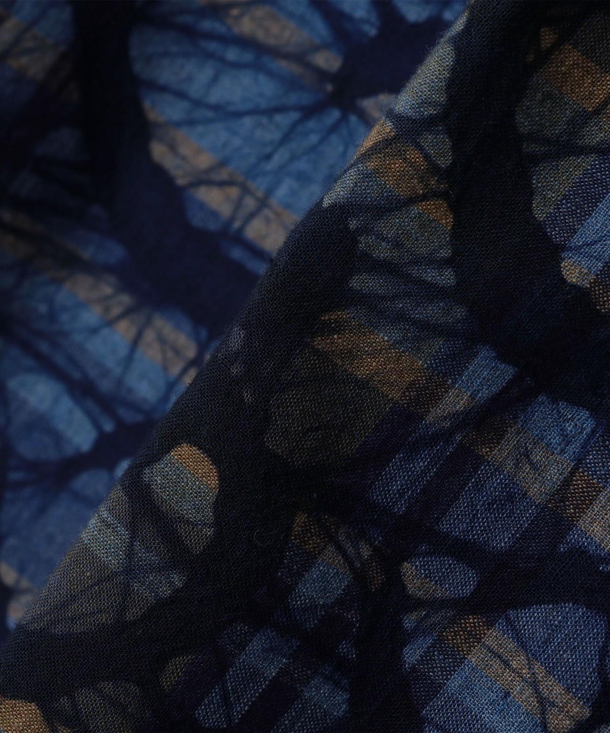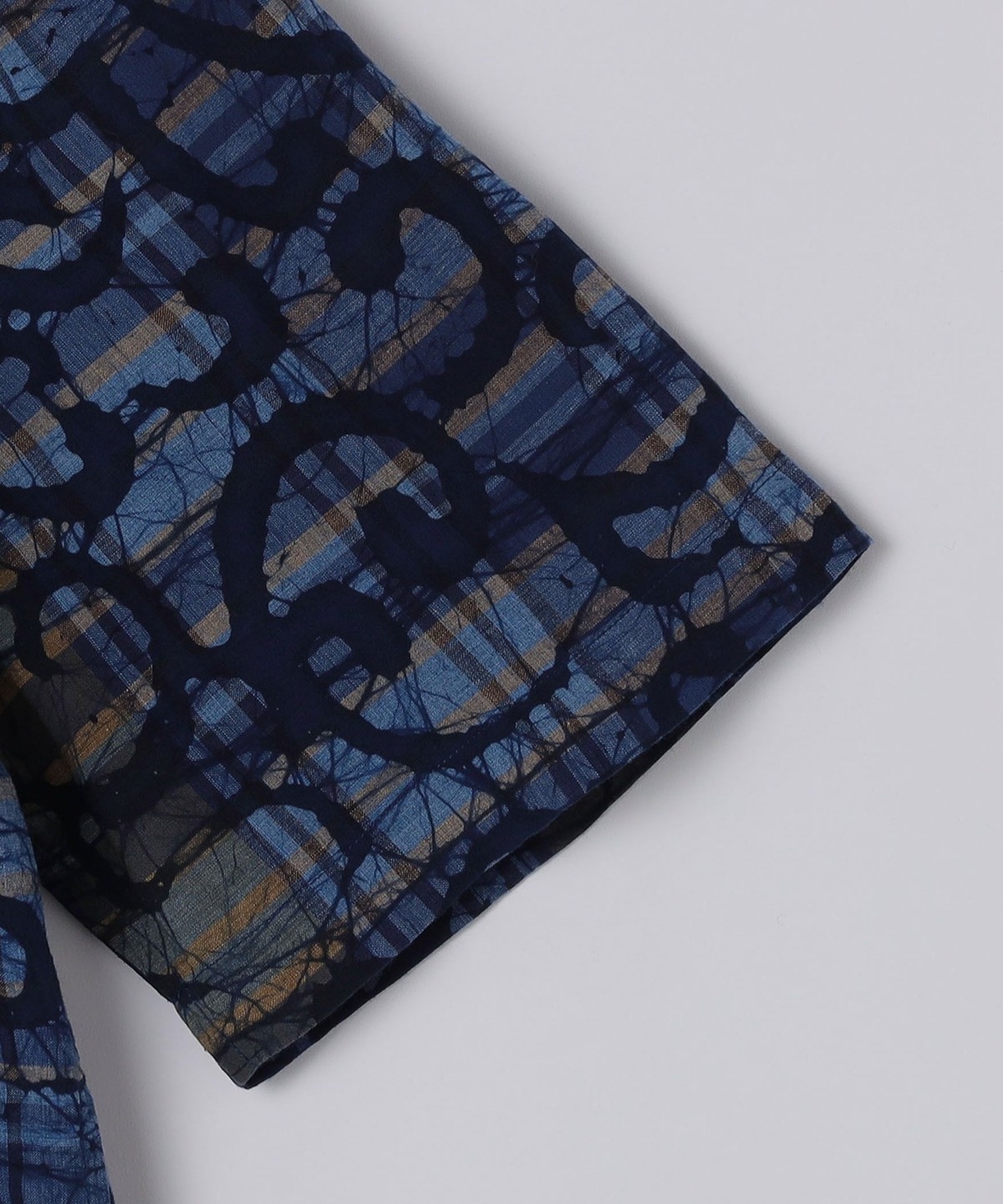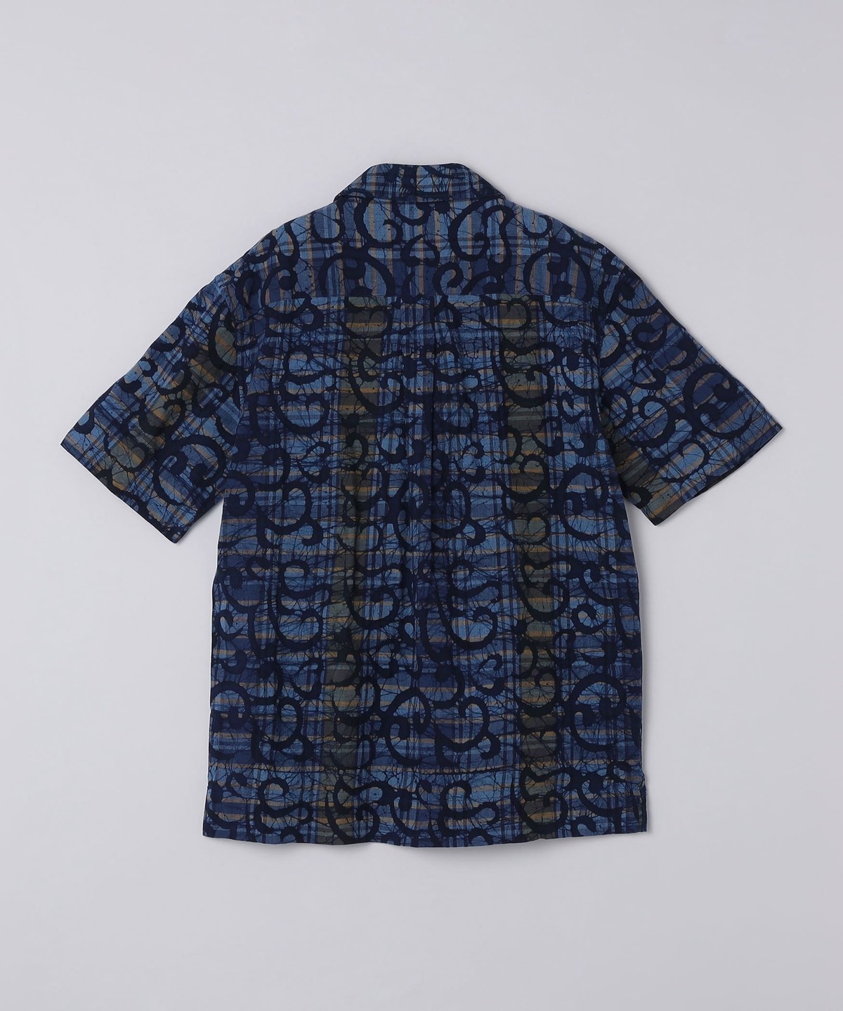 バティックプリントを重ねたデザインのオープンカラーシャツ。