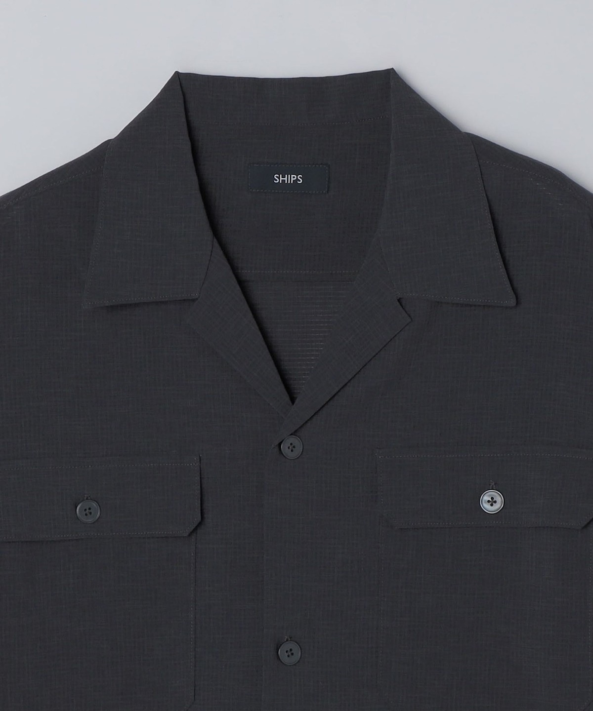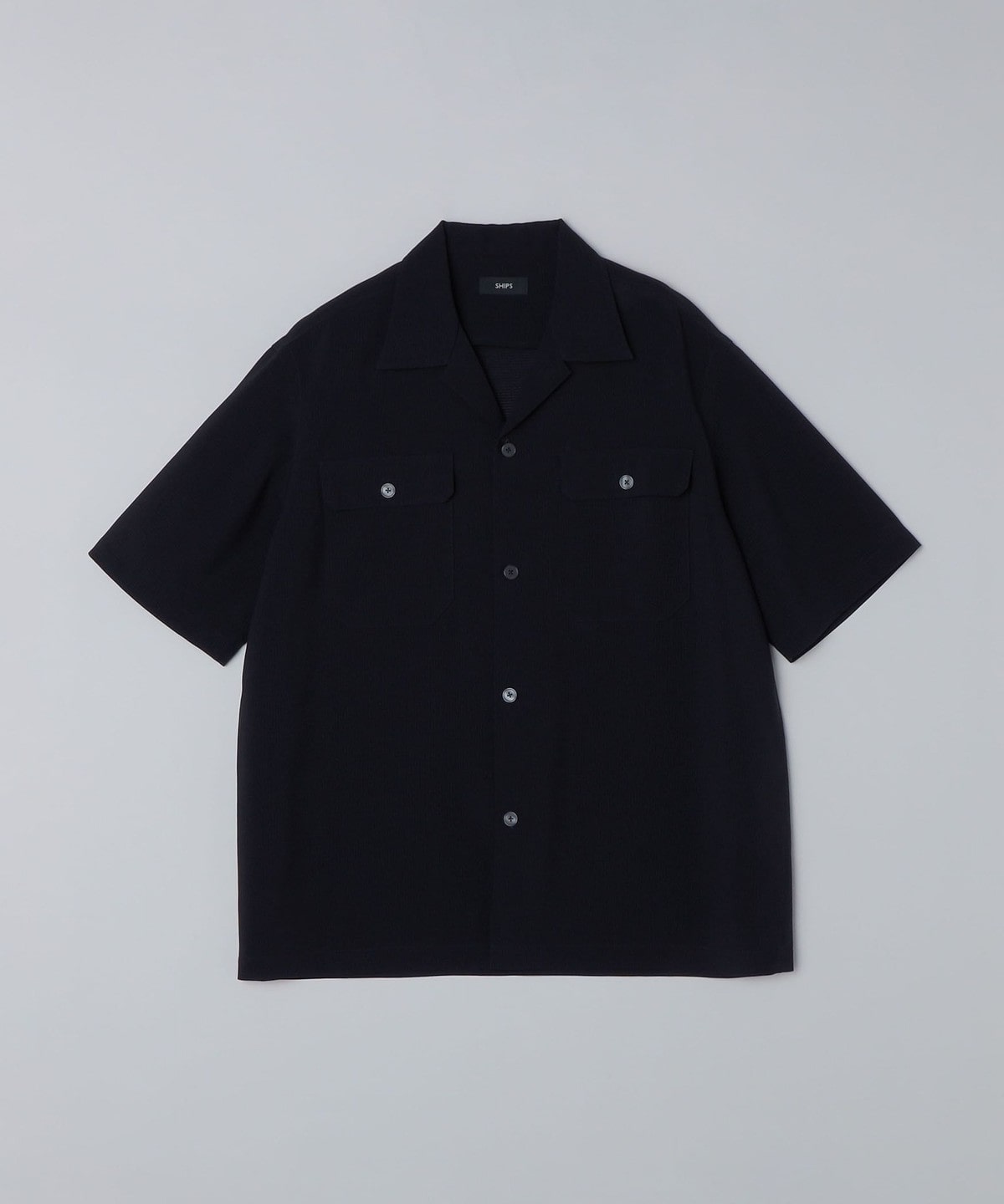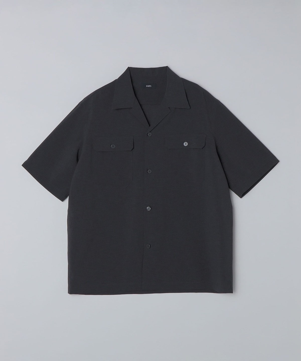 リラックス感のある襟デザインとゆったりとしたフィッティングが特徴のダブルポケットオープンカラーシャツです。