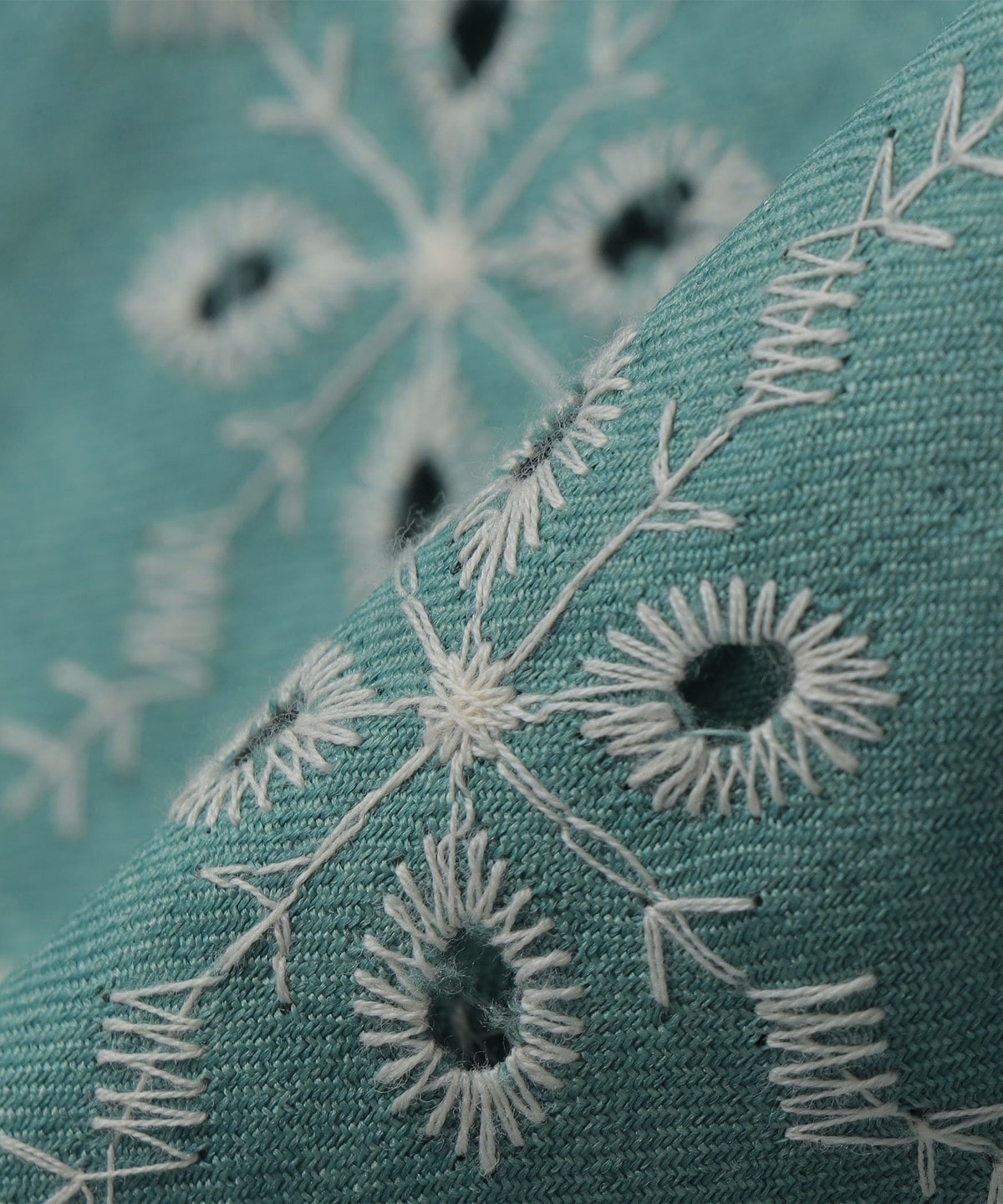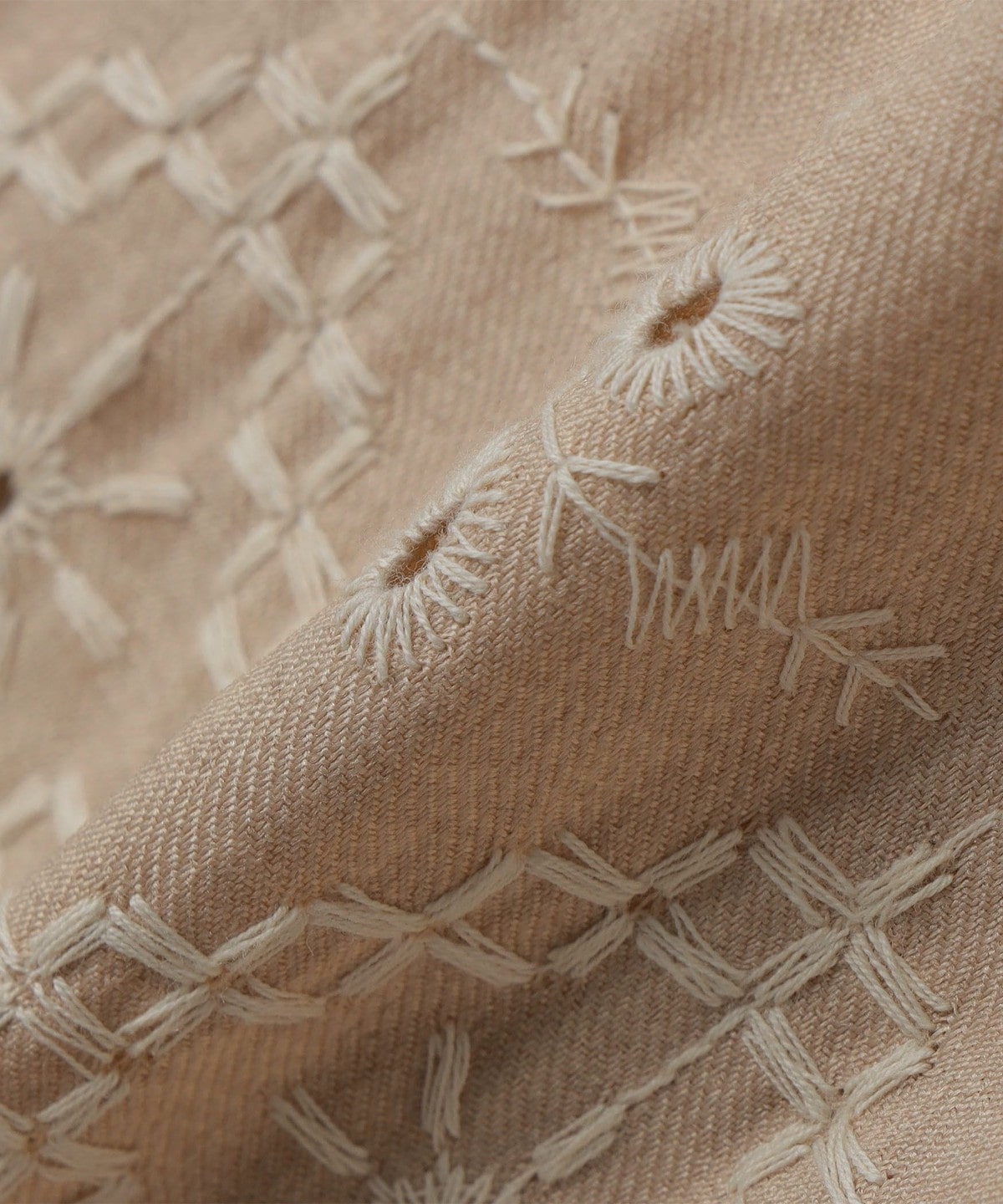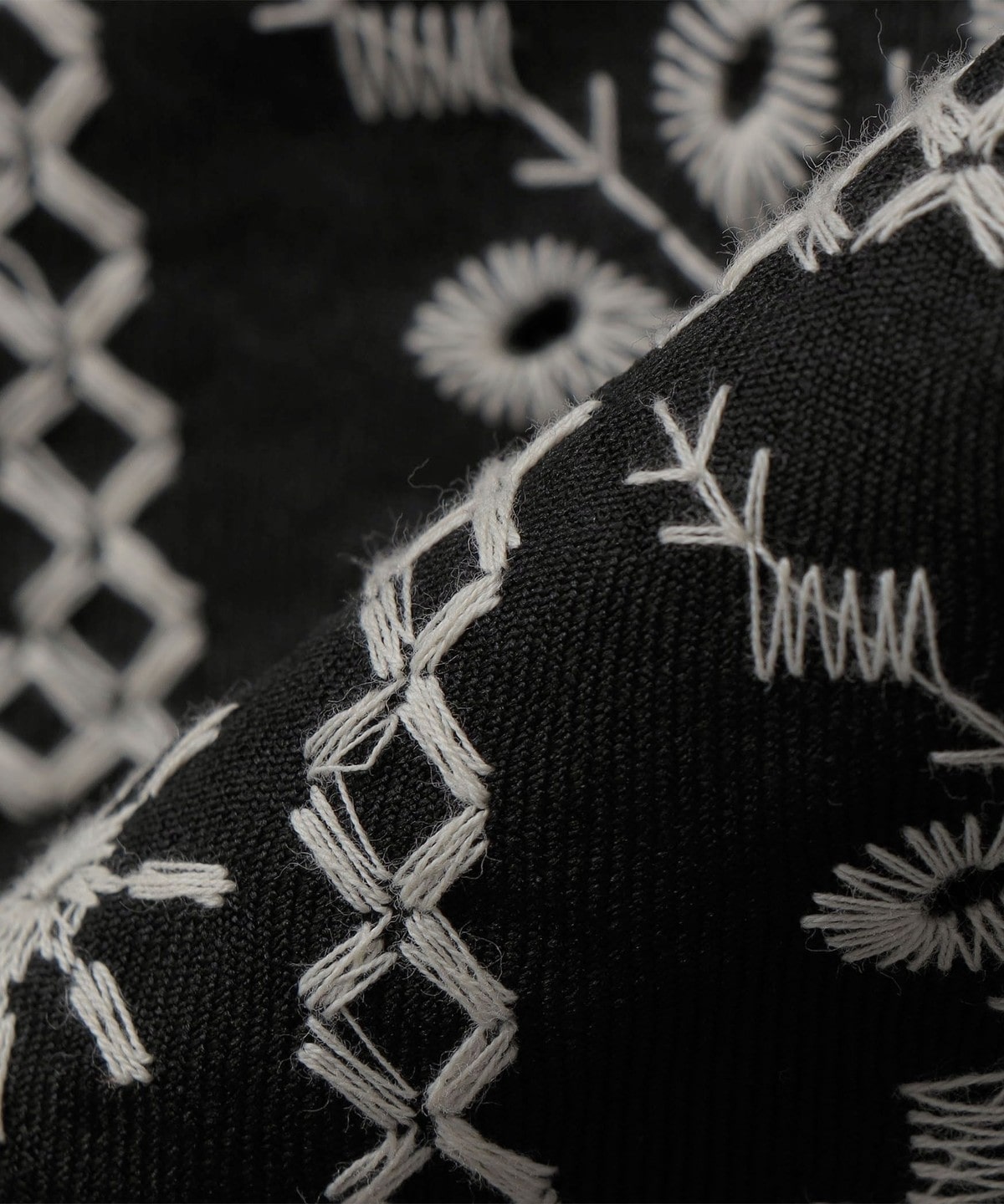 ミニマムな刺繍で描かれた花々が連なる様子が特徴です。