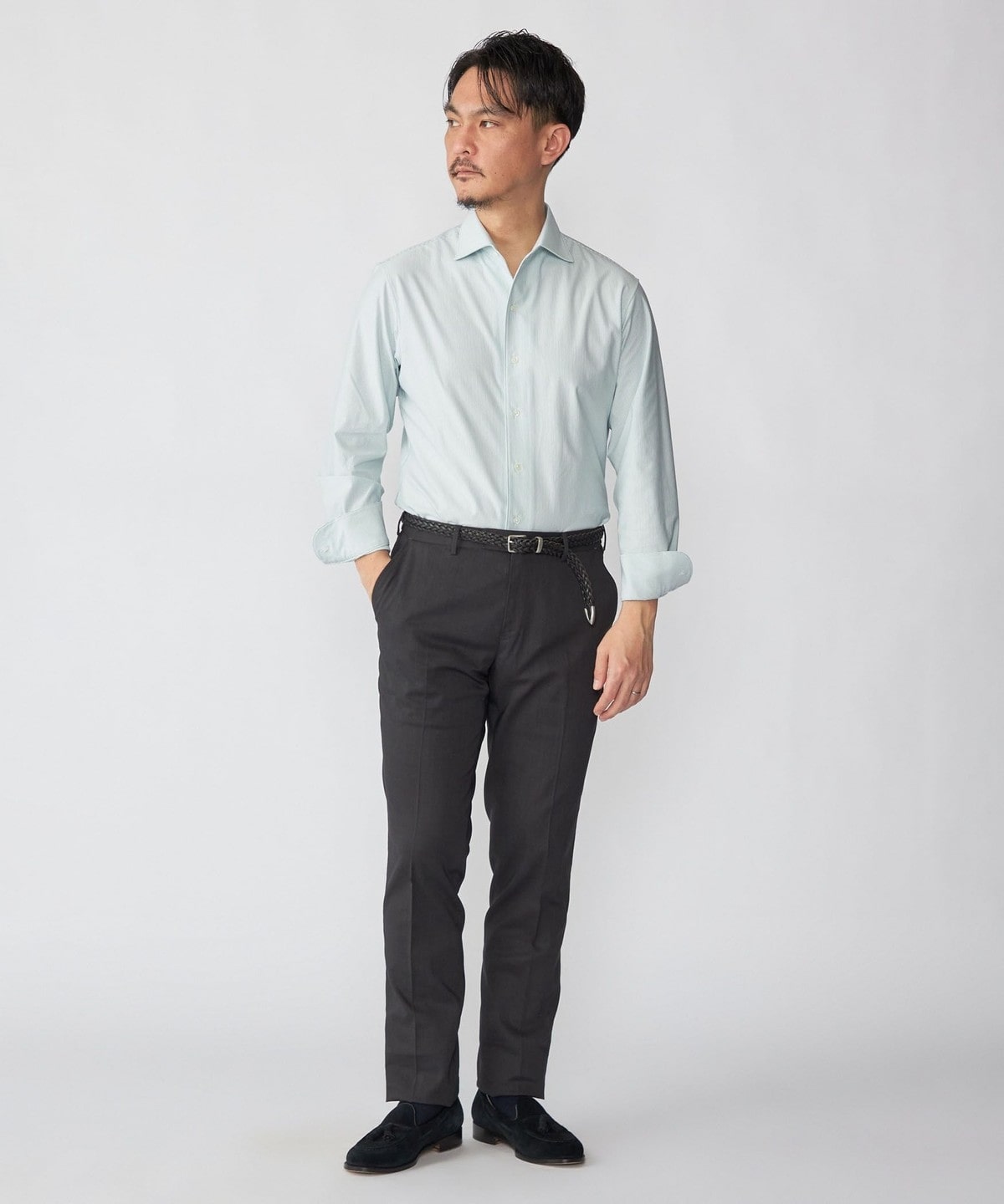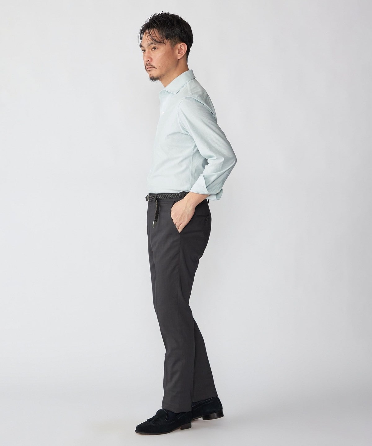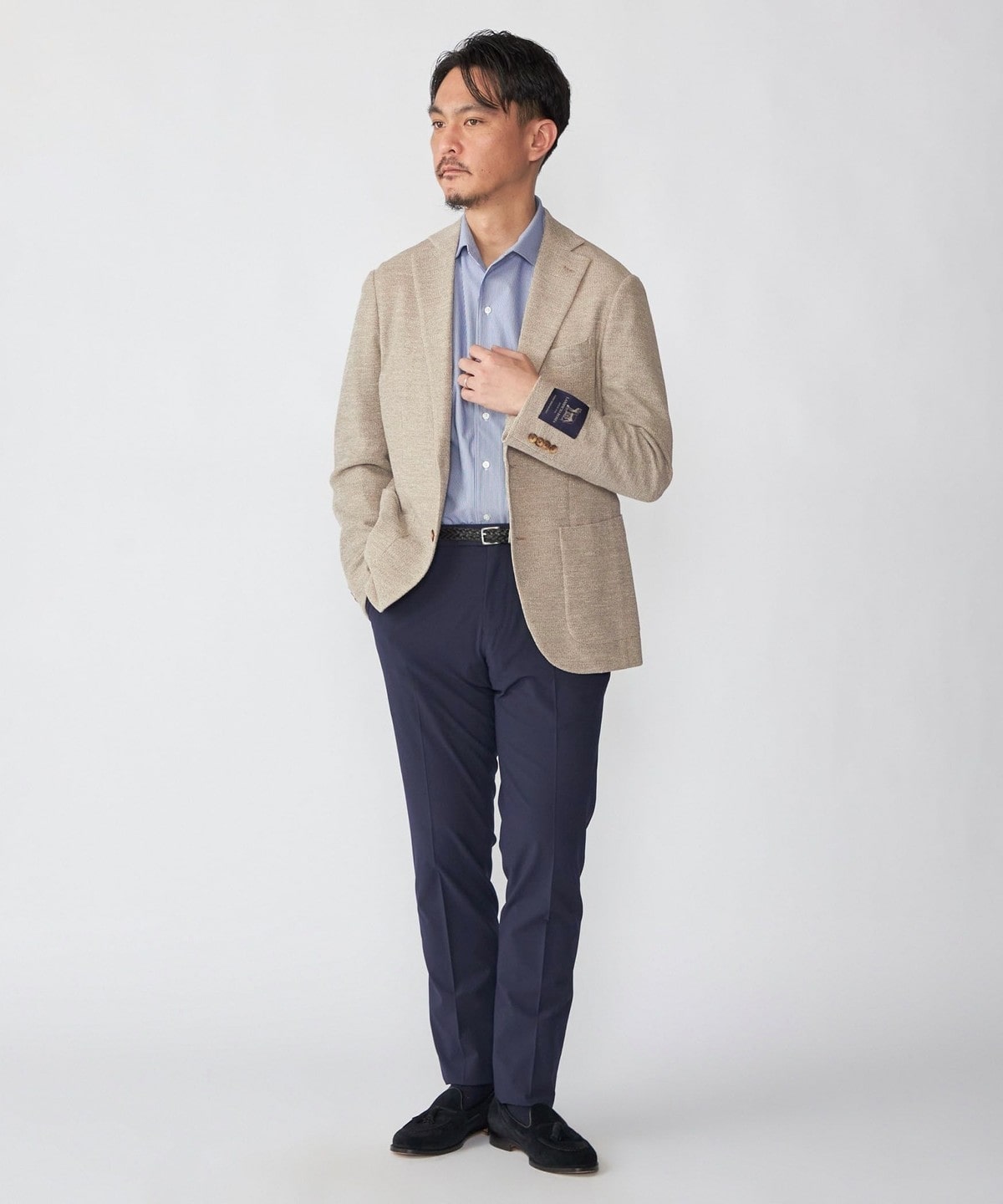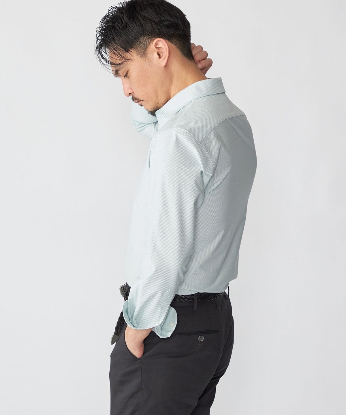 ジャケットのインナーに入れると、ジャージーシャツとは思えないほどの上質な印象を与えます。