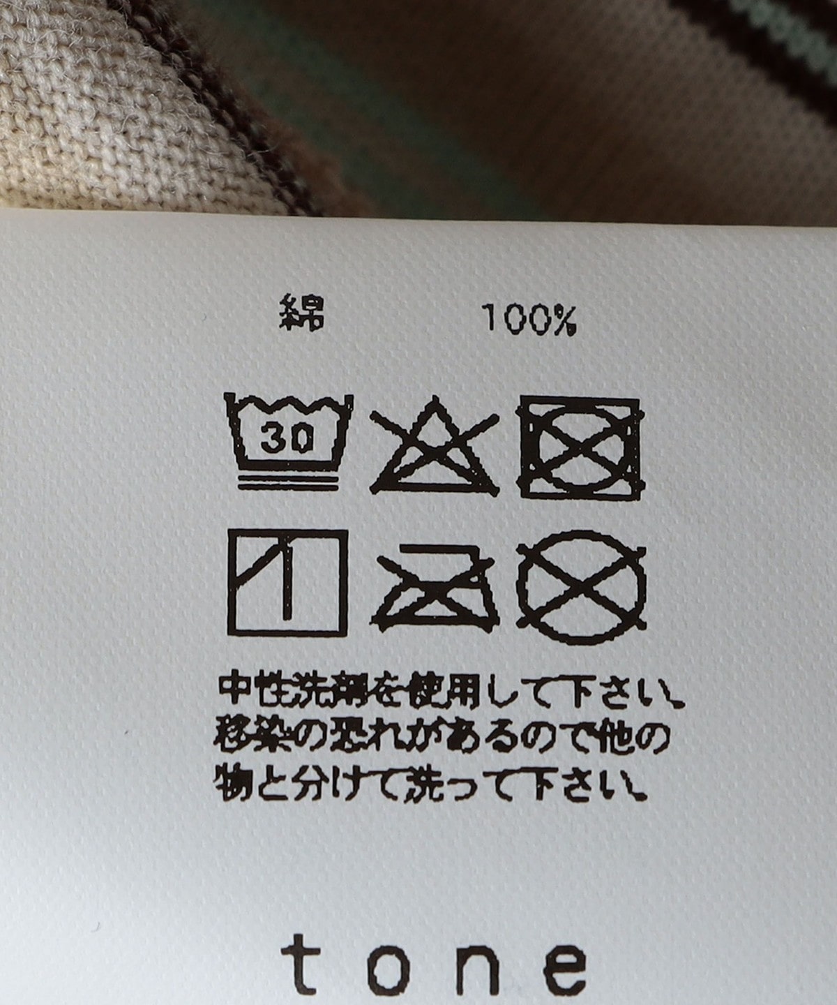 程よい柔らかさと光沢が特徴の素材で、ボーダーの配色とダブルステッチで縫製されたステッチが印象的な一枚です。
