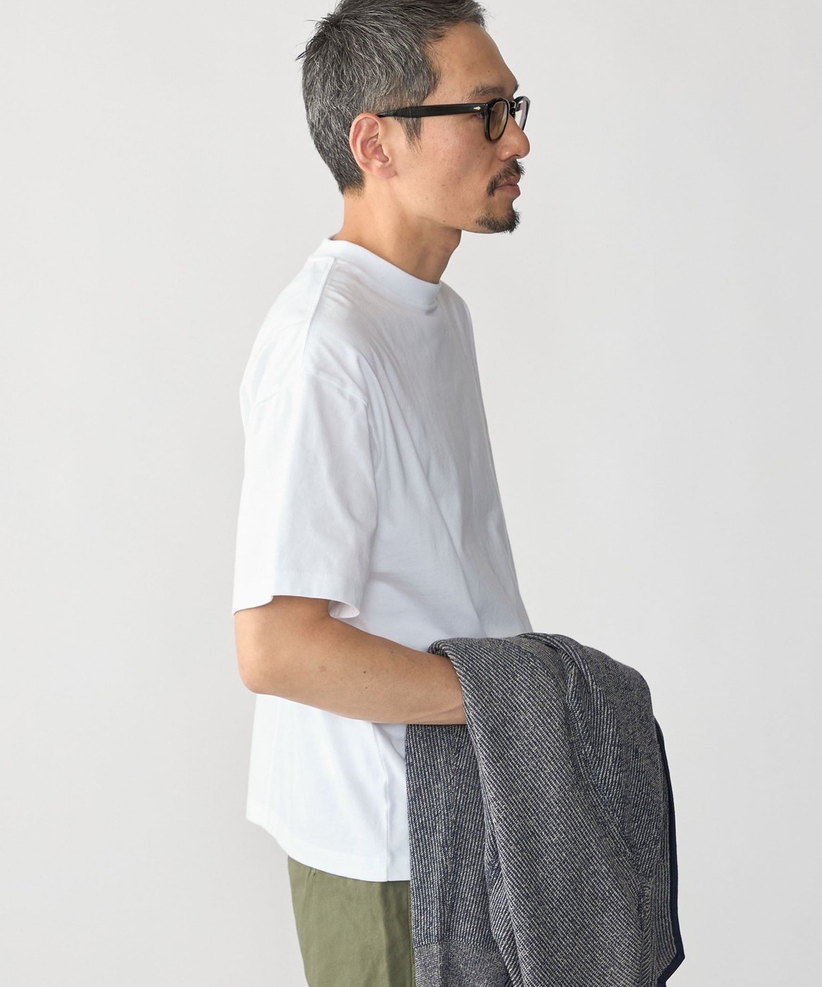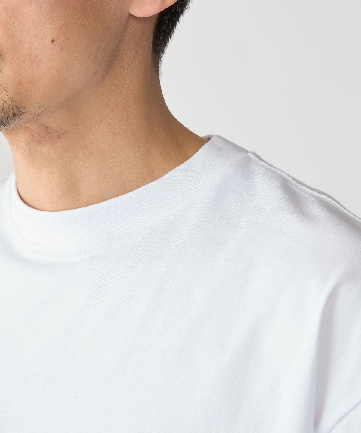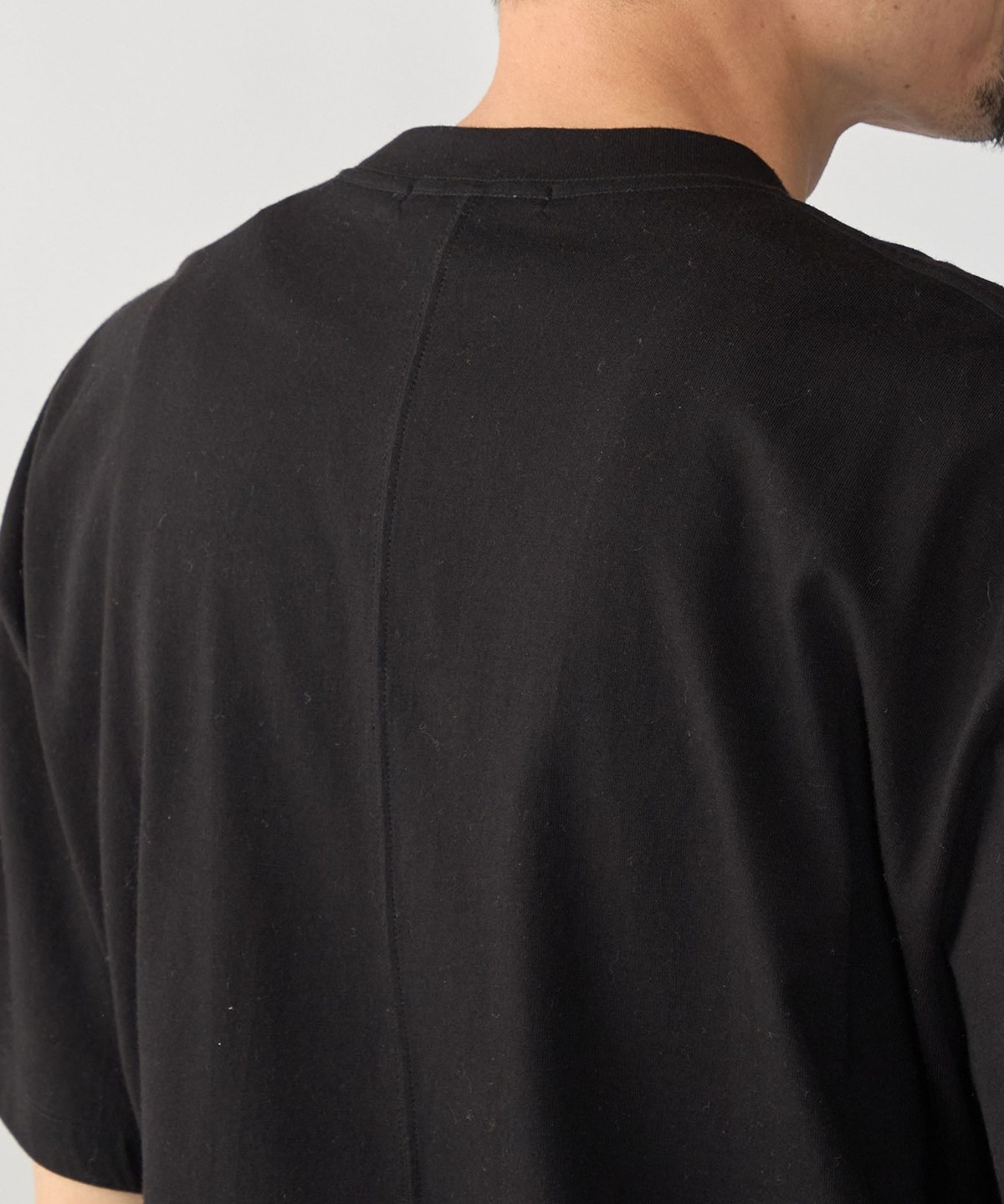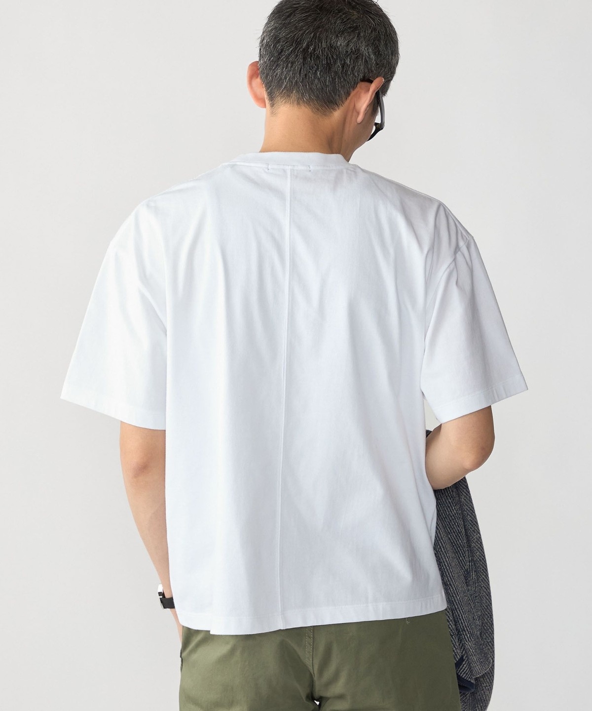 ややコンパクト目に設定した着丈と、首元はフライスでしっかりと詰まっているので、スッキリとした印象で着用頂けます。