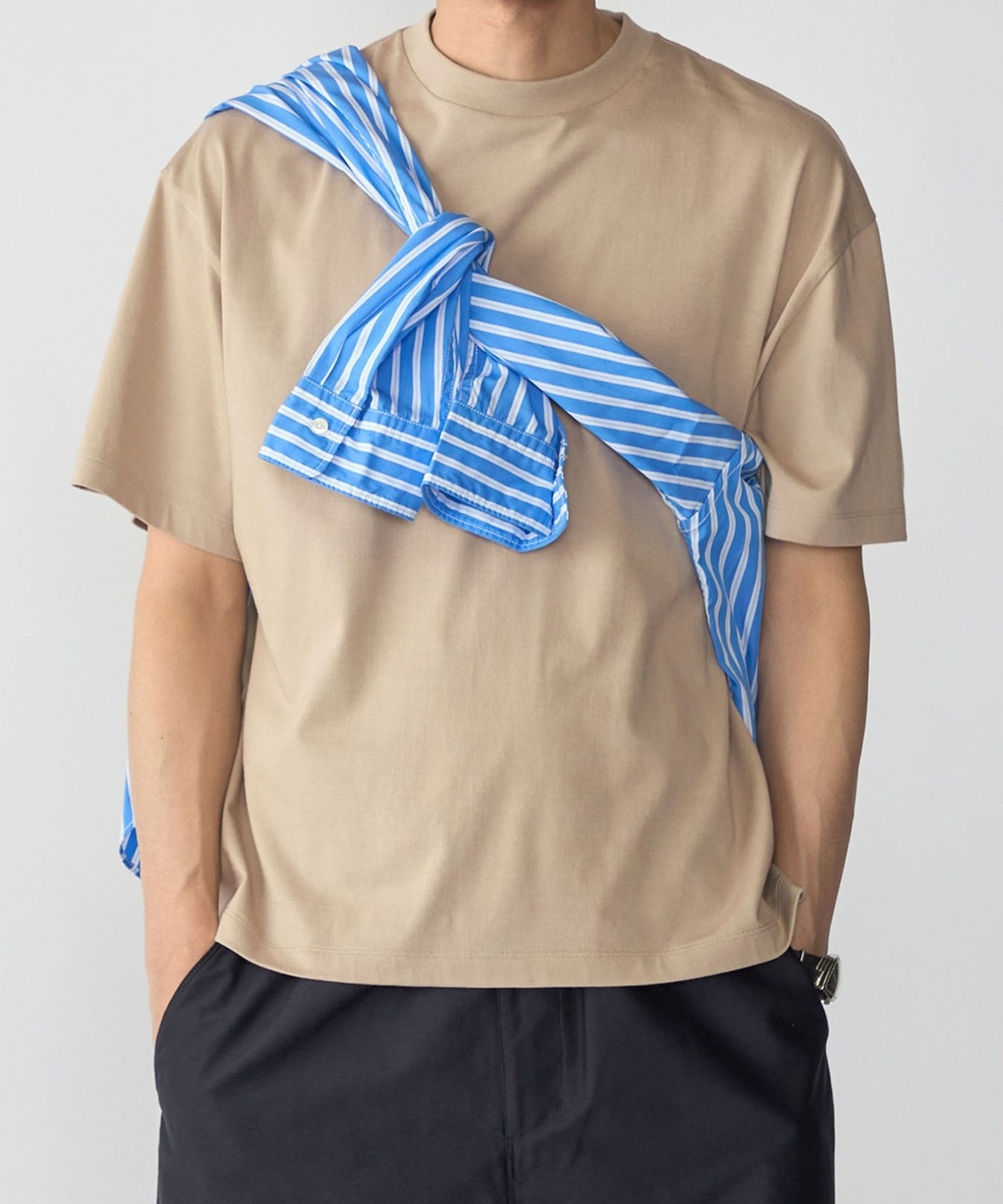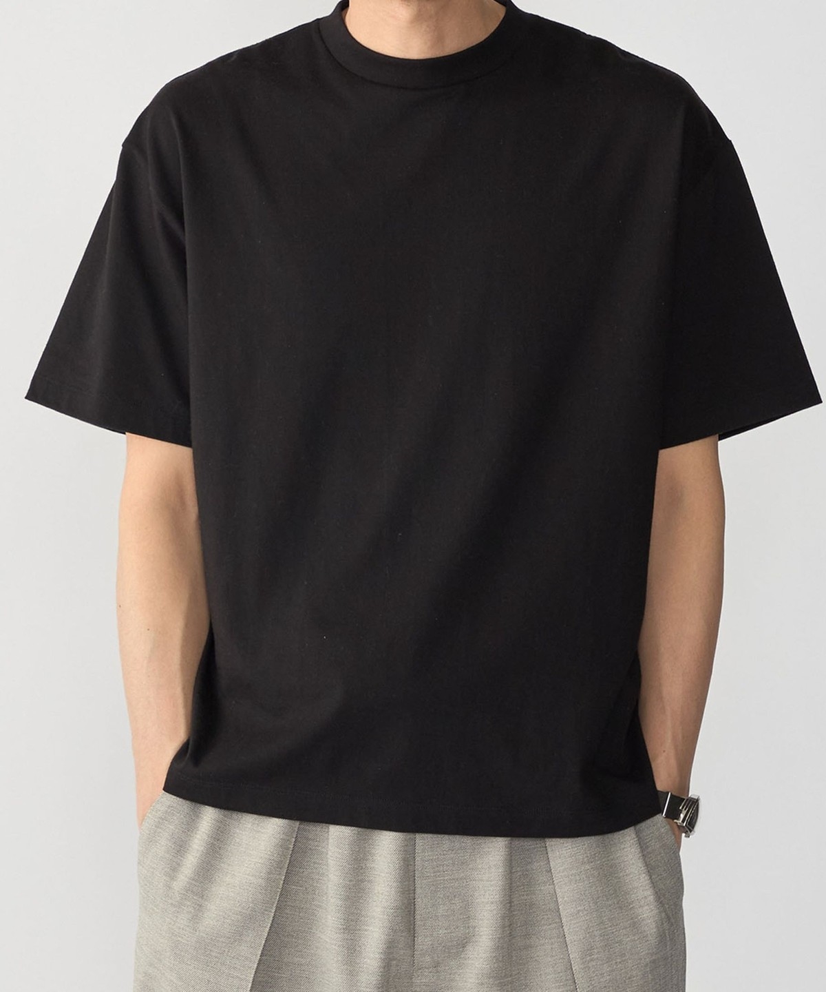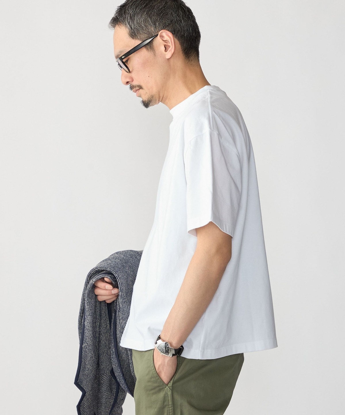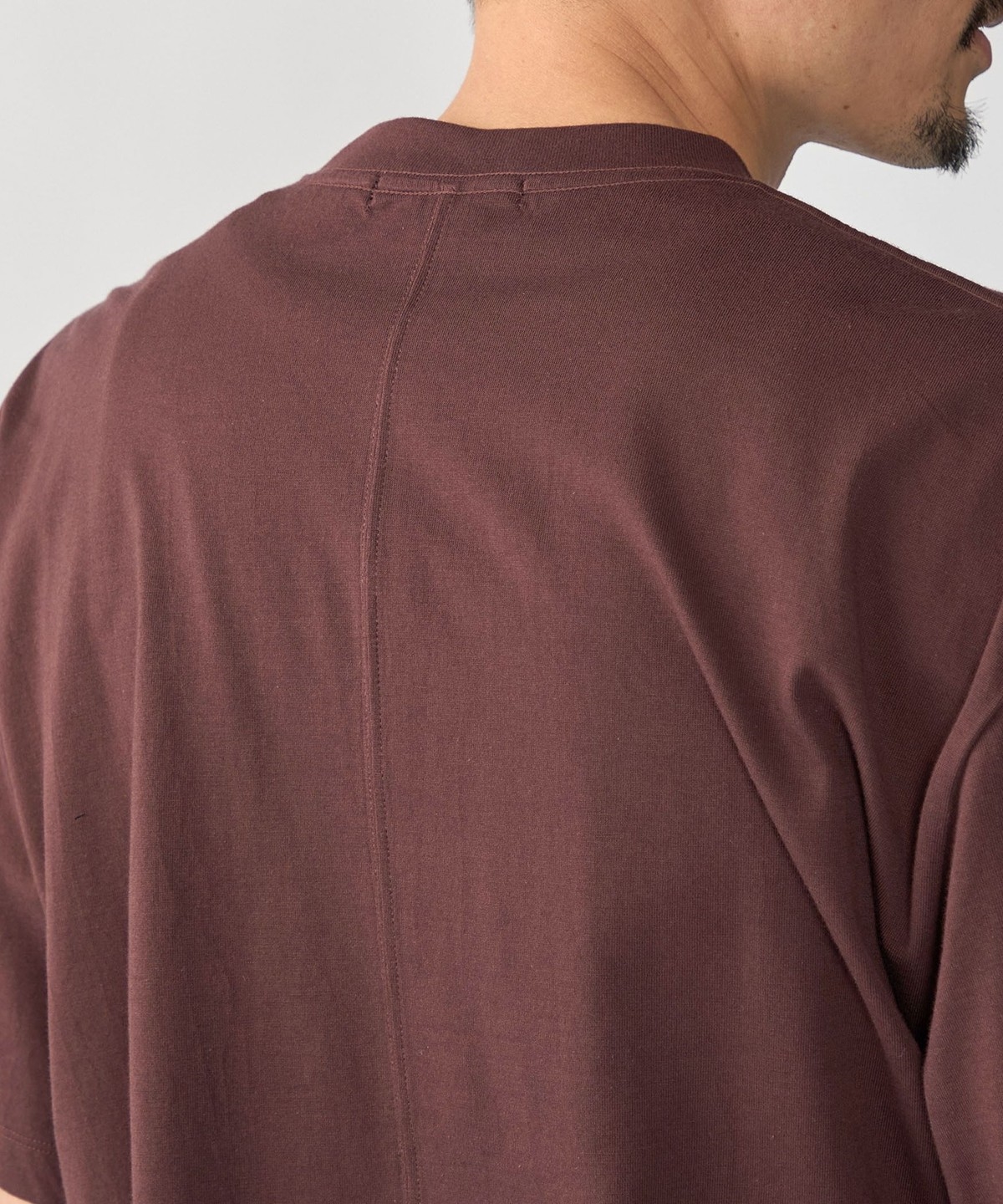 ややコンパクト目に設定した着丈と、首元はフライスでしっかりと詰まっているので、スッキリとした印象で着用頂けます。