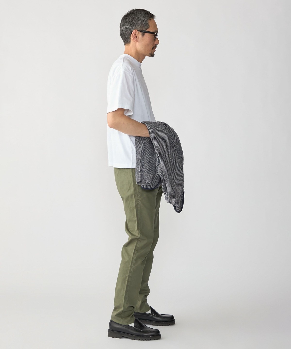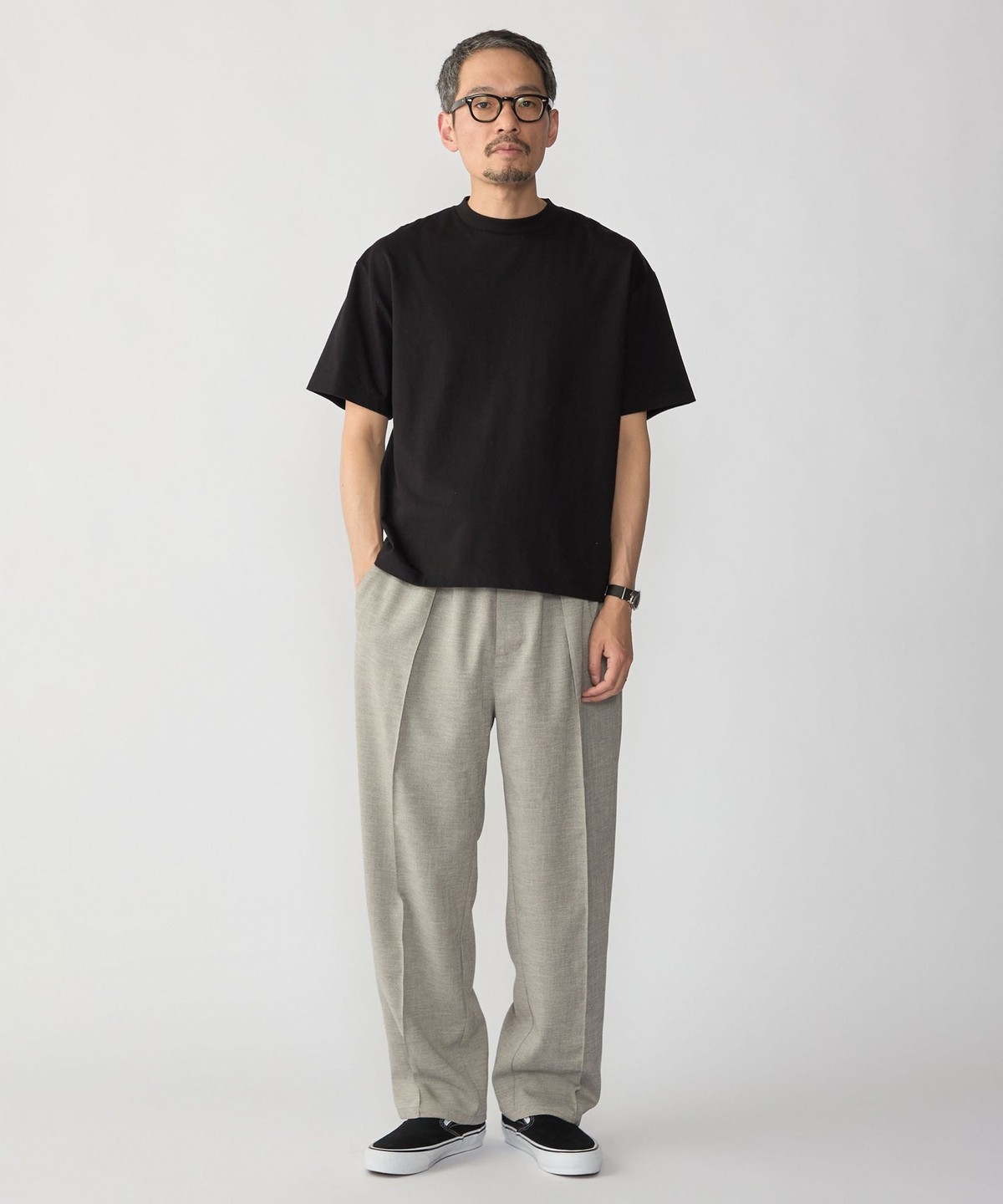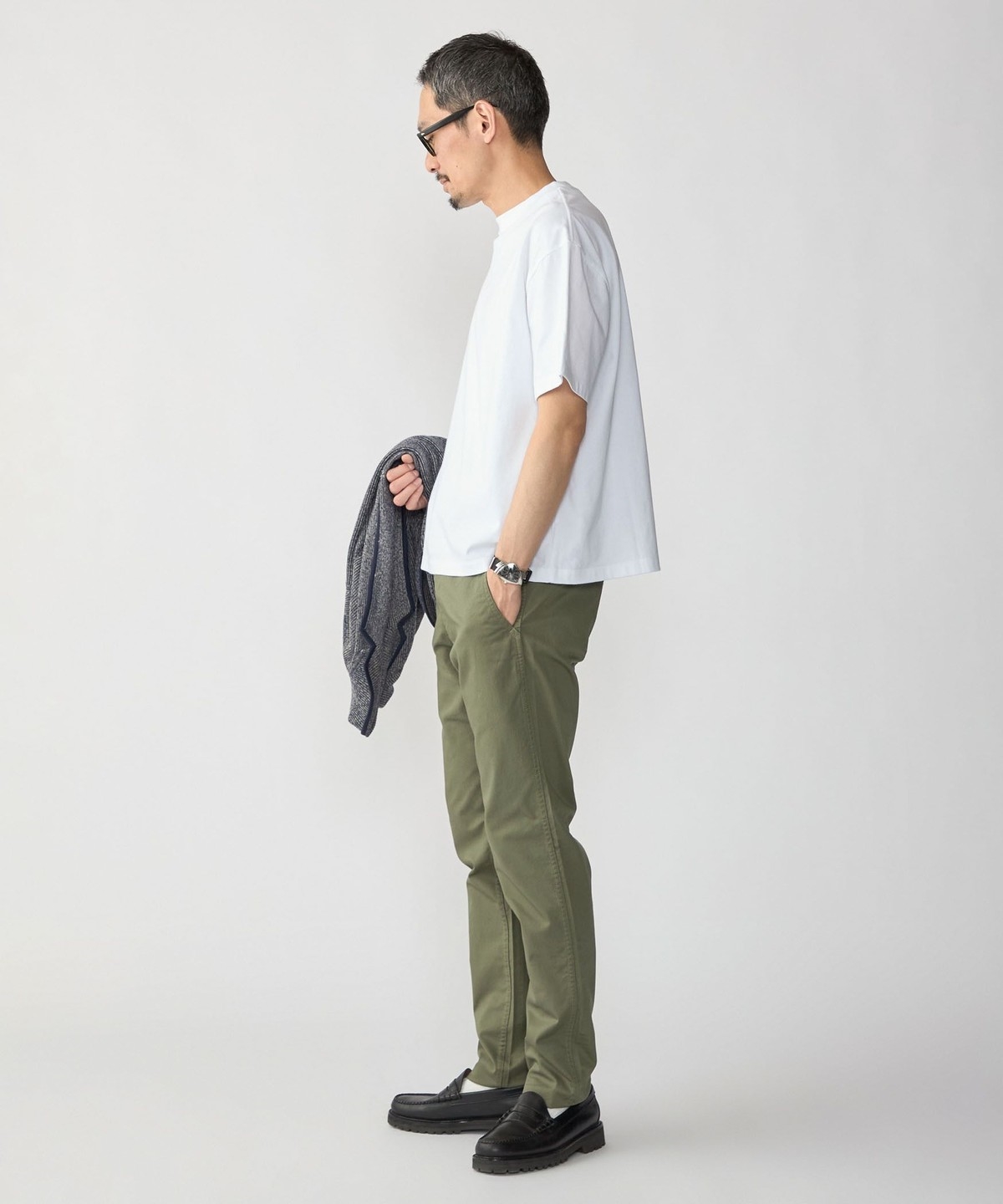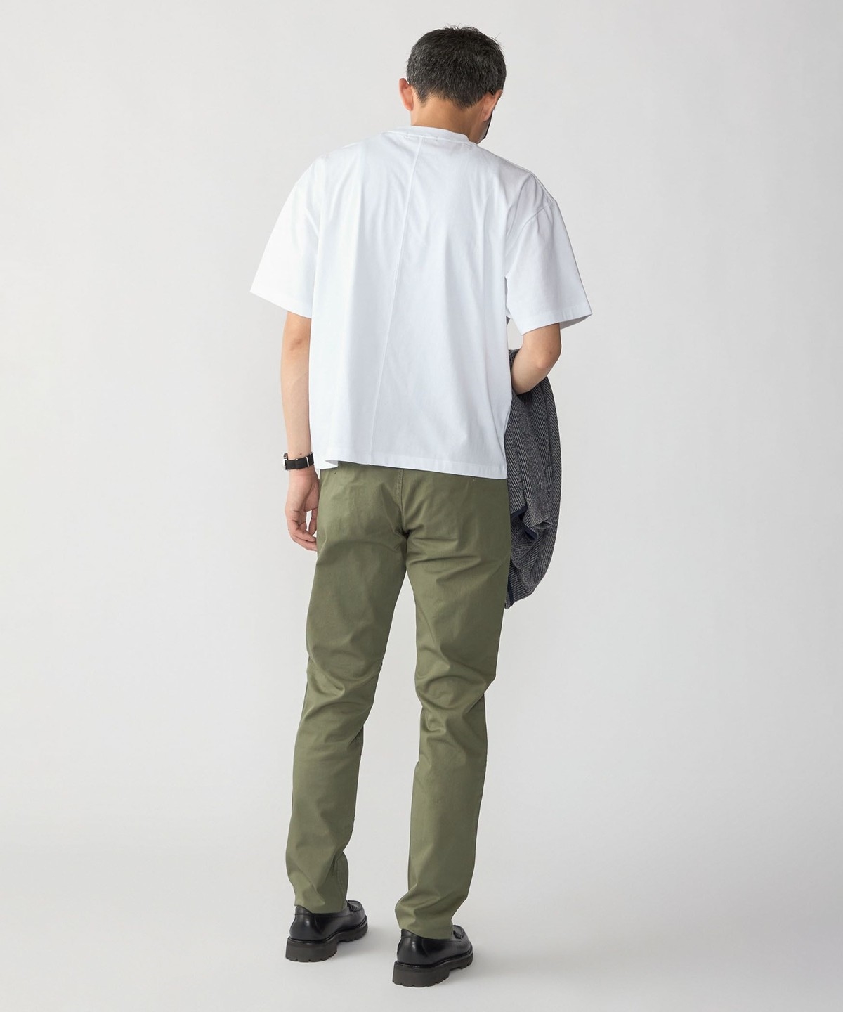 スッキリとした仕上がりなのでパンツはテーパードからワイドまで幅広く対応可能です。