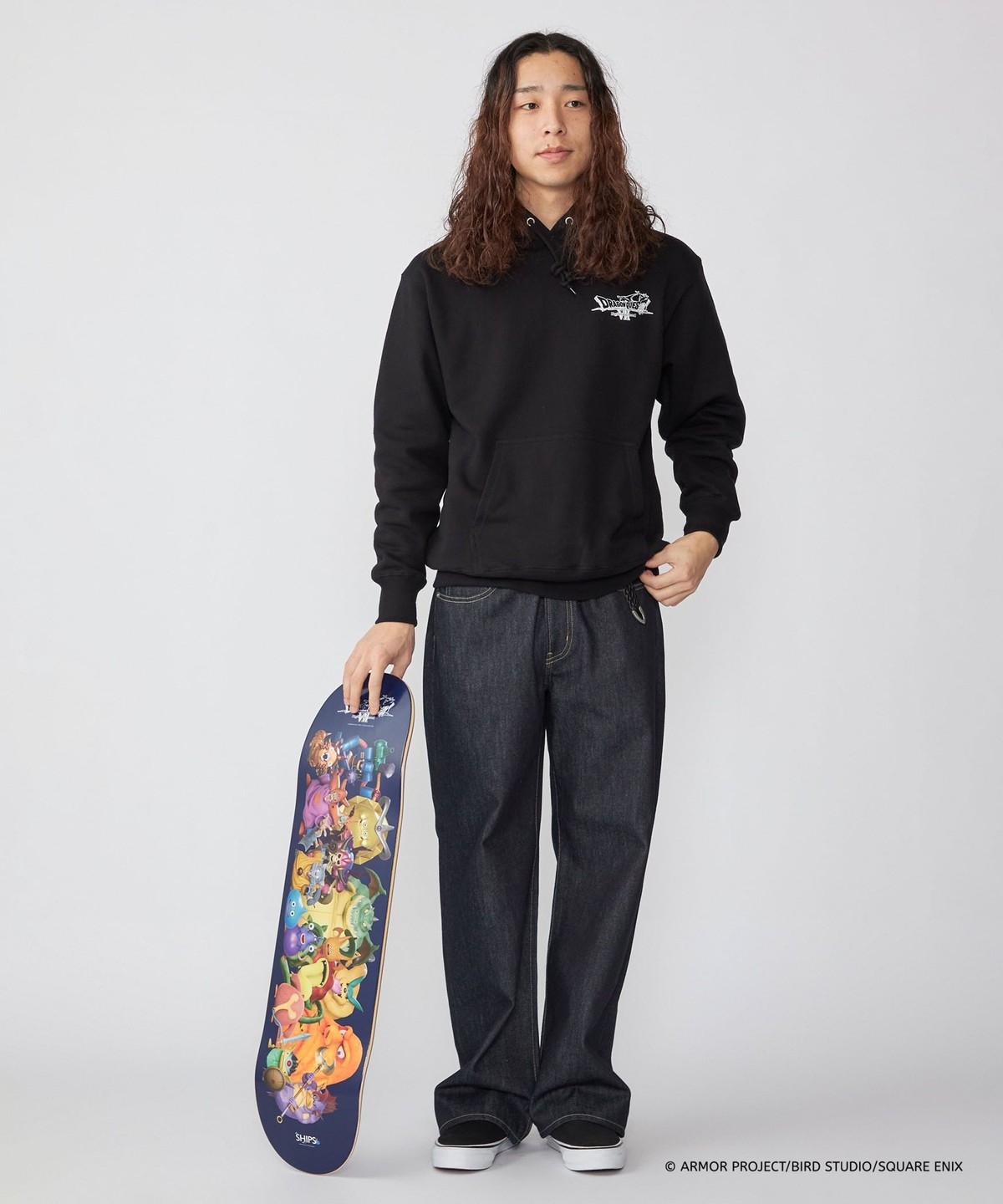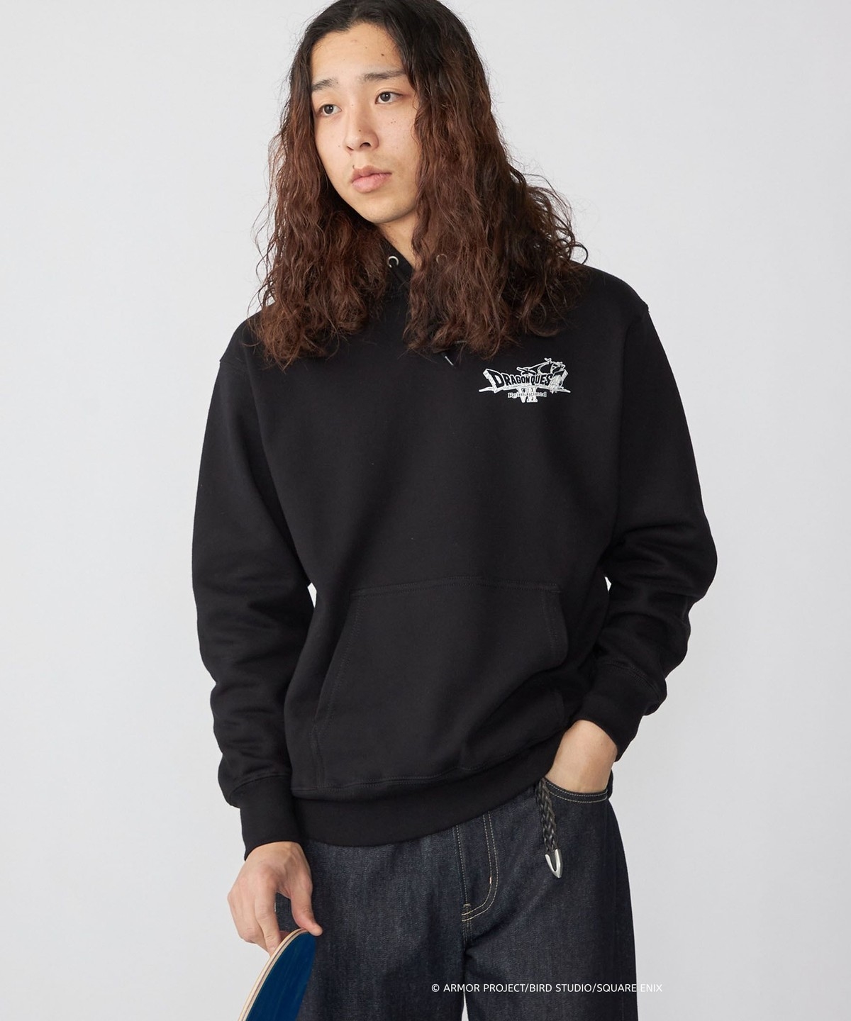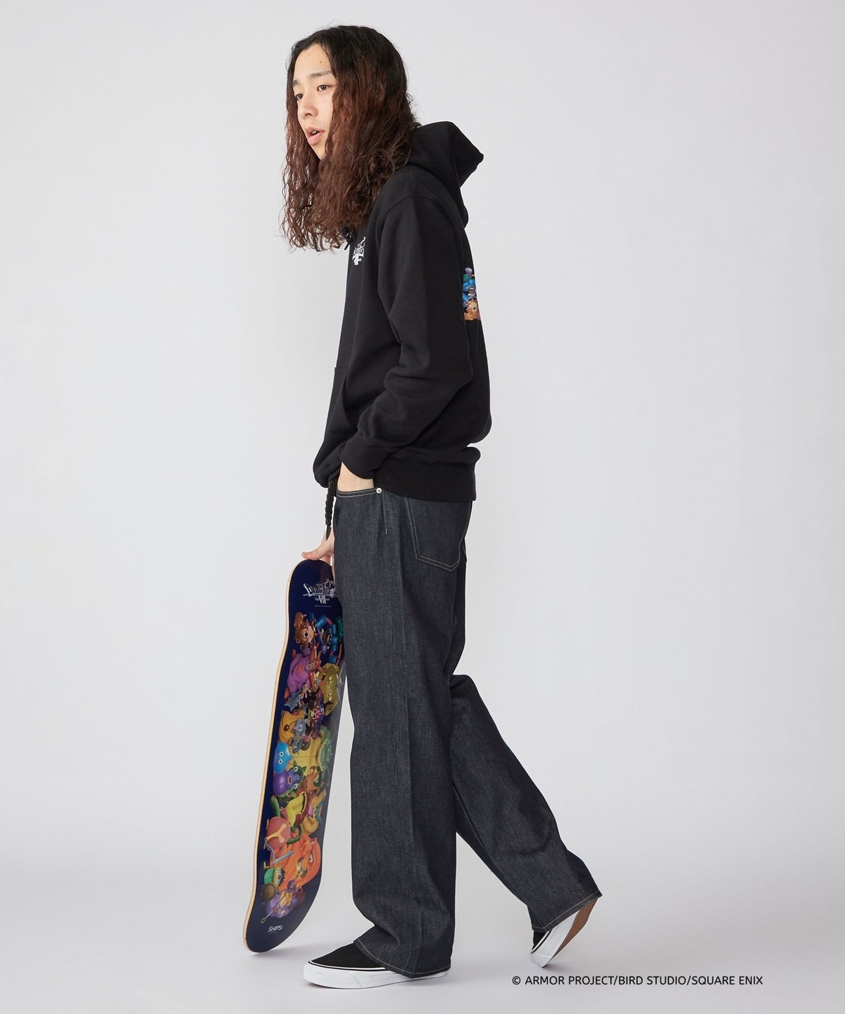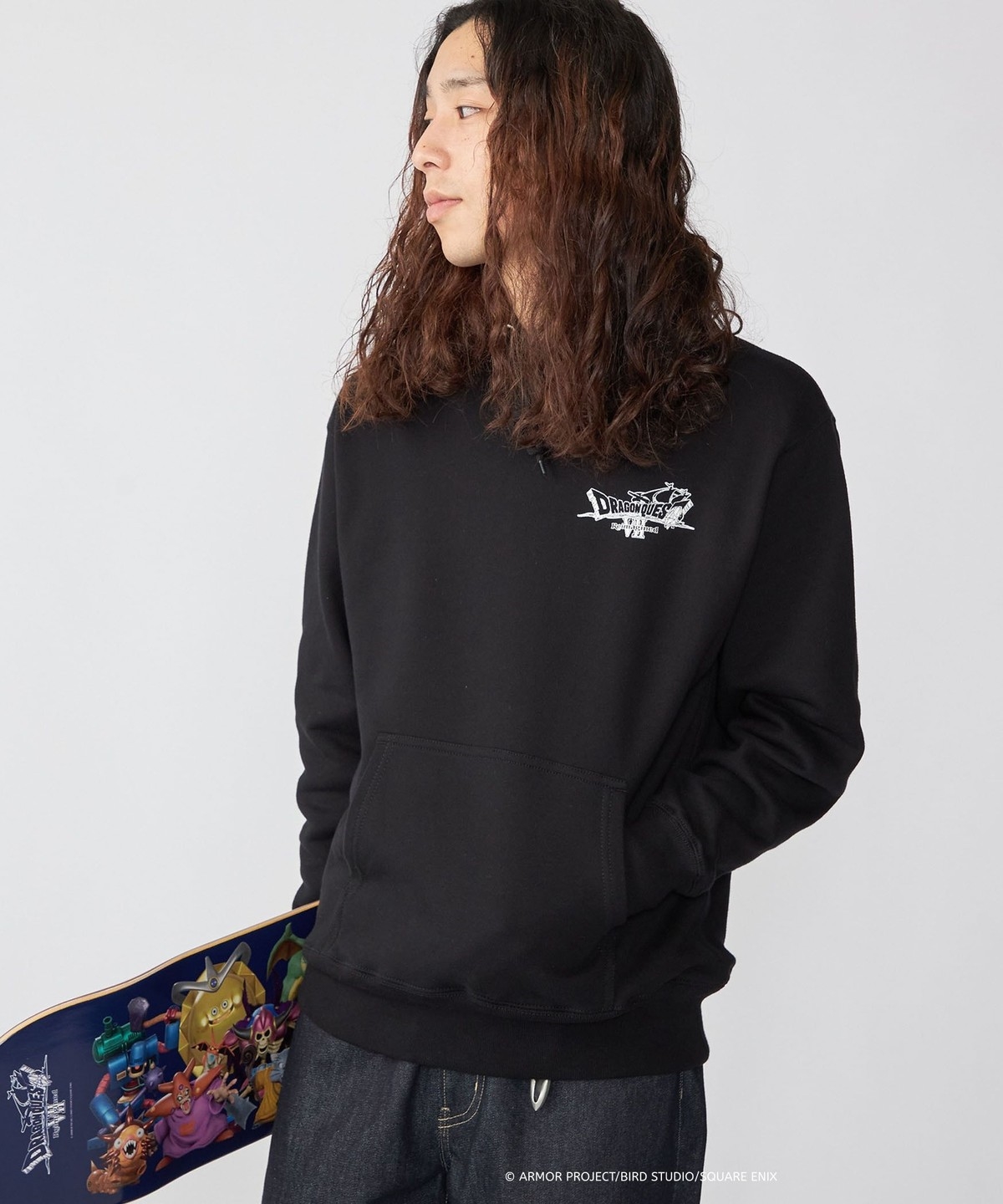 ブラックボディの背面には、スケートデッキにも採用されたモンスター大集合の3Dグラフィックを大胆にプリント。『ドラゴンクエストZ Reimagined』の世界観を凝縮し、遊び心とコラボらしさを強く印象づける一着となっています。程よいオーバーサイズフィットなので、ルーズな着こなしもオススメです。