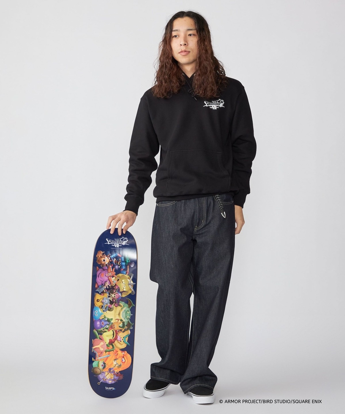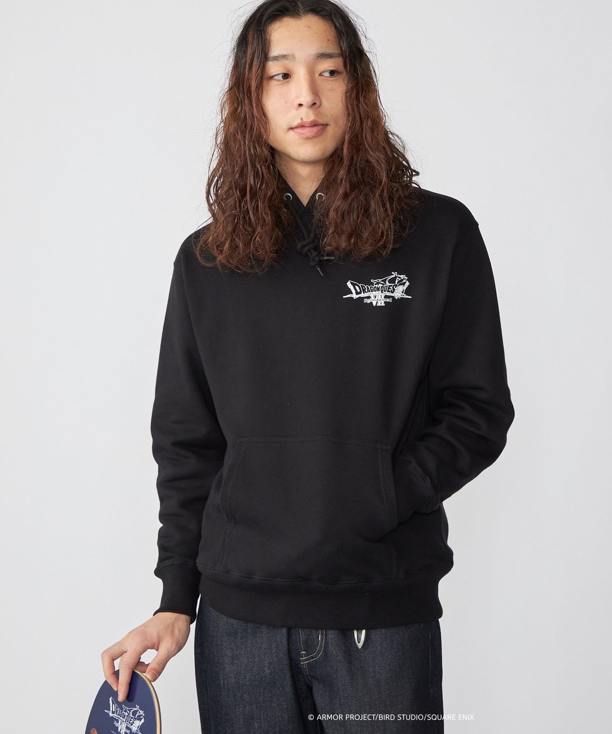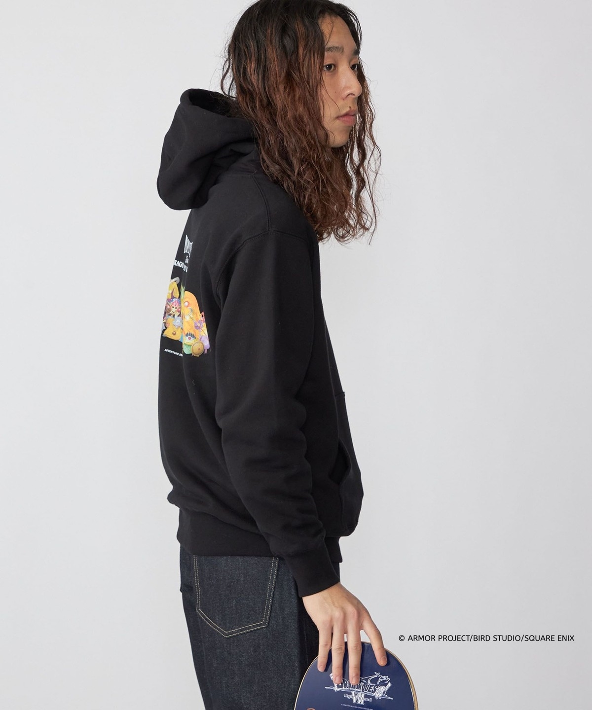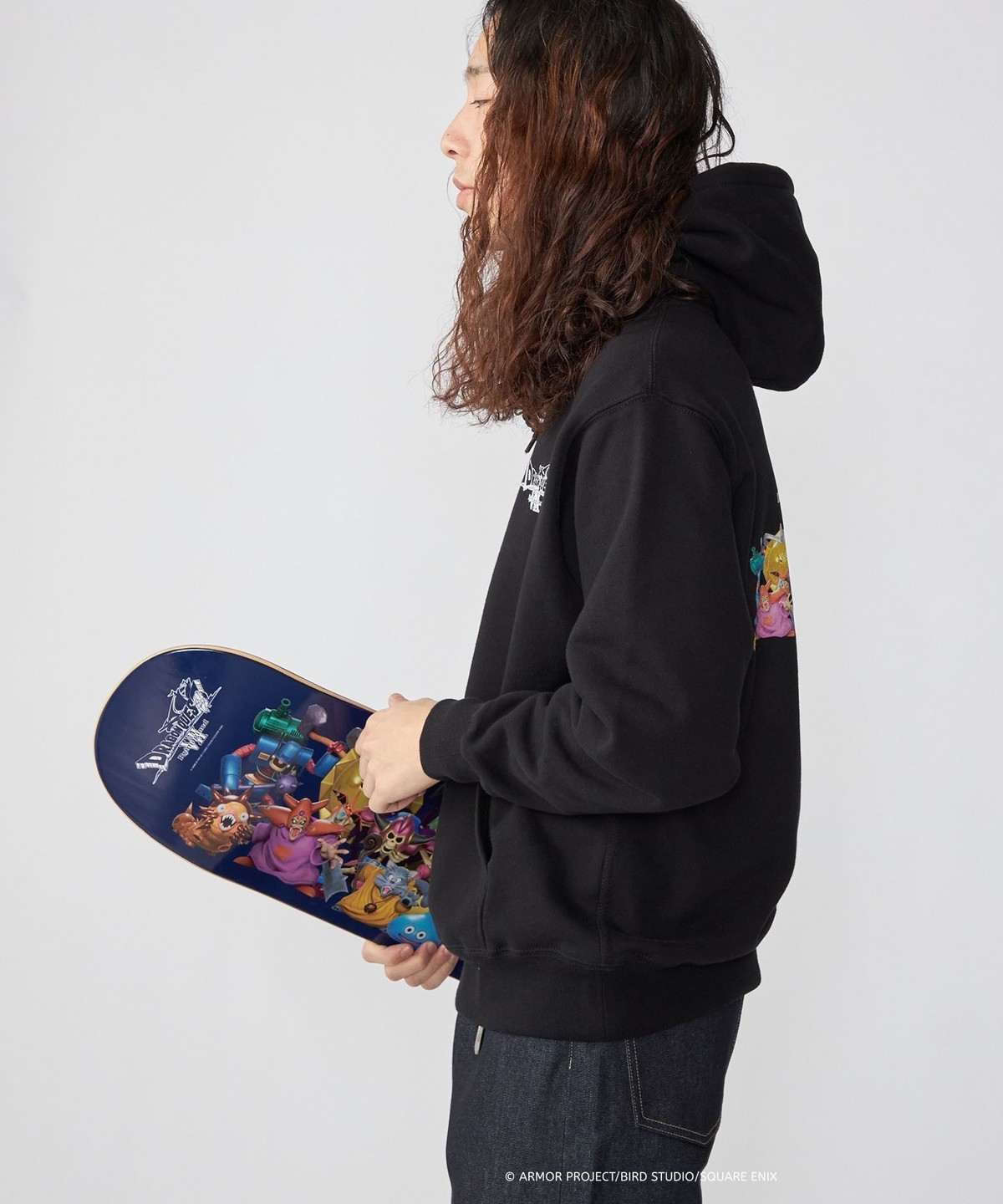ブラックボディの背面には、スケートデッキにも採用されたモンスター大集合の3Dグラフィックを大胆にプリント。『ドラゴンクエストZ Reimagined』の世界観を凝縮し、遊び心とコラボらしさを強く印象づける一着となっています。程よいオーバーサイズフィットなので、ルーズな着こなしもオススメです。