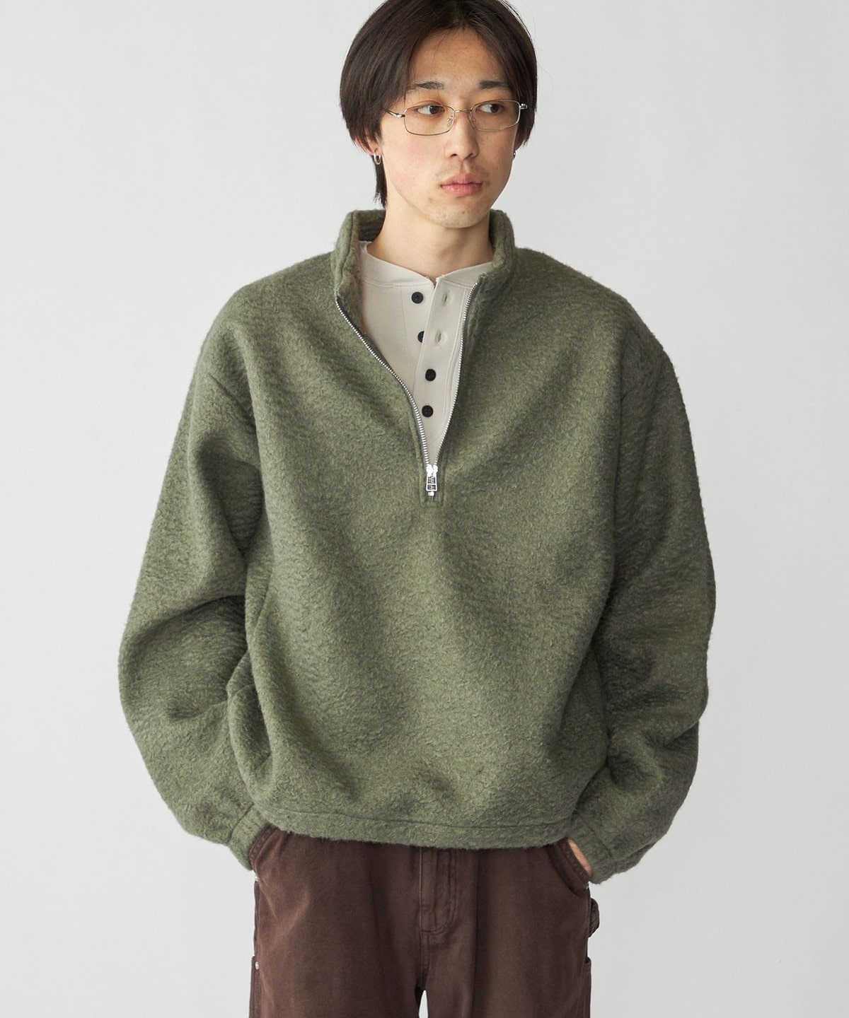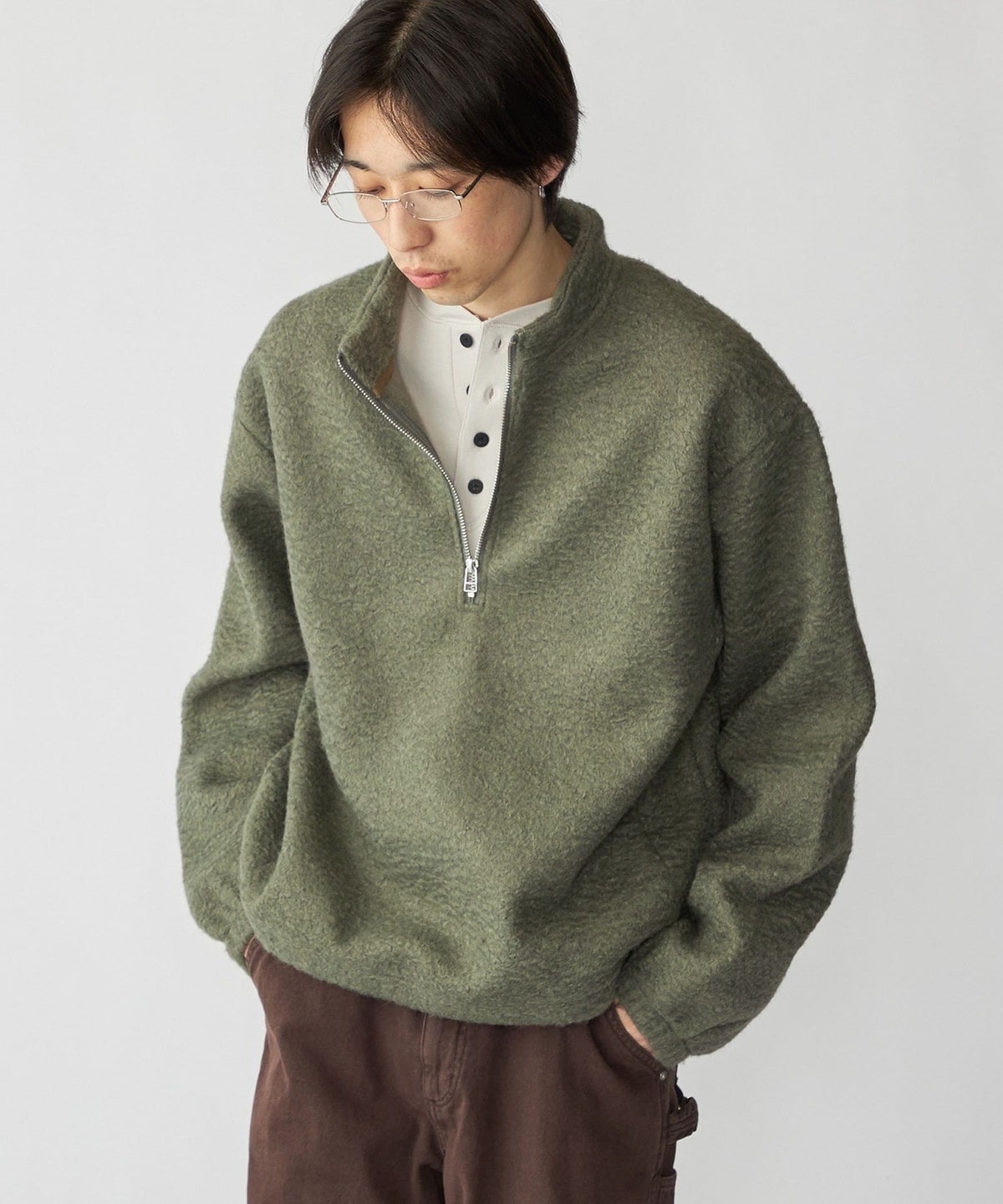 毛足のある上品な生地を使用することで、ハーフジップでもカジュアルな雰囲気になりすぎず、幅広いシーンで着用いただけます。