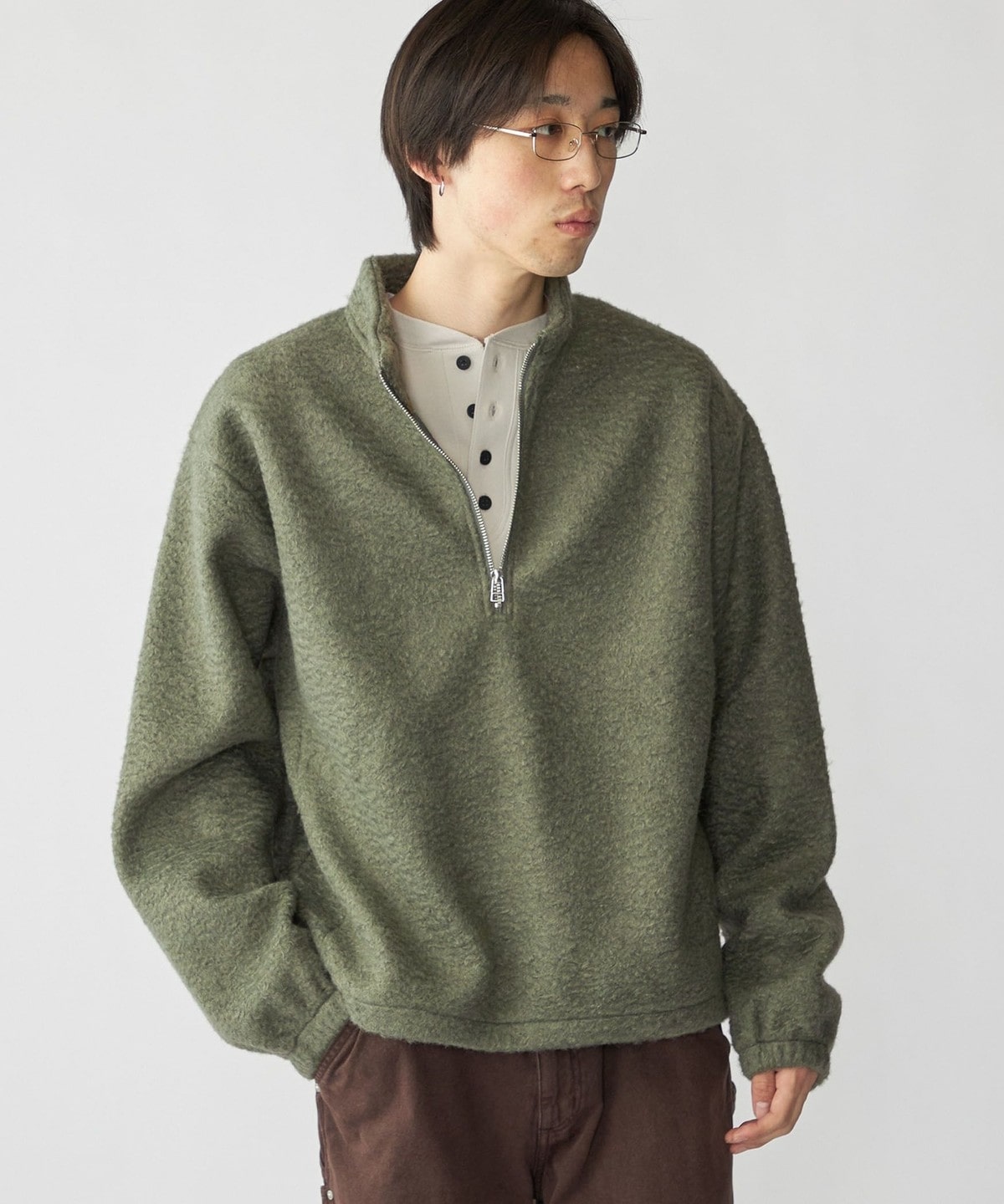 シャギーフリース生地を使用したハーフジッププルオーバー。