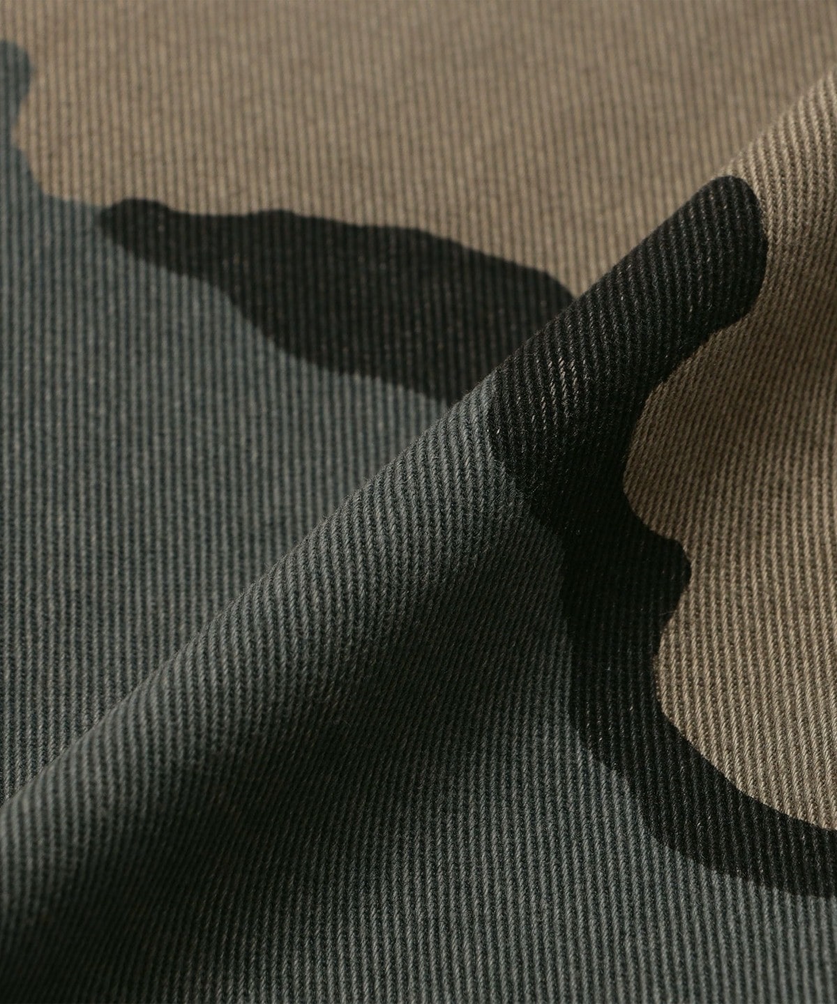 強撚糸を綾織で高密度に織り上げたツイル地にオーバープリントした生地を使用。