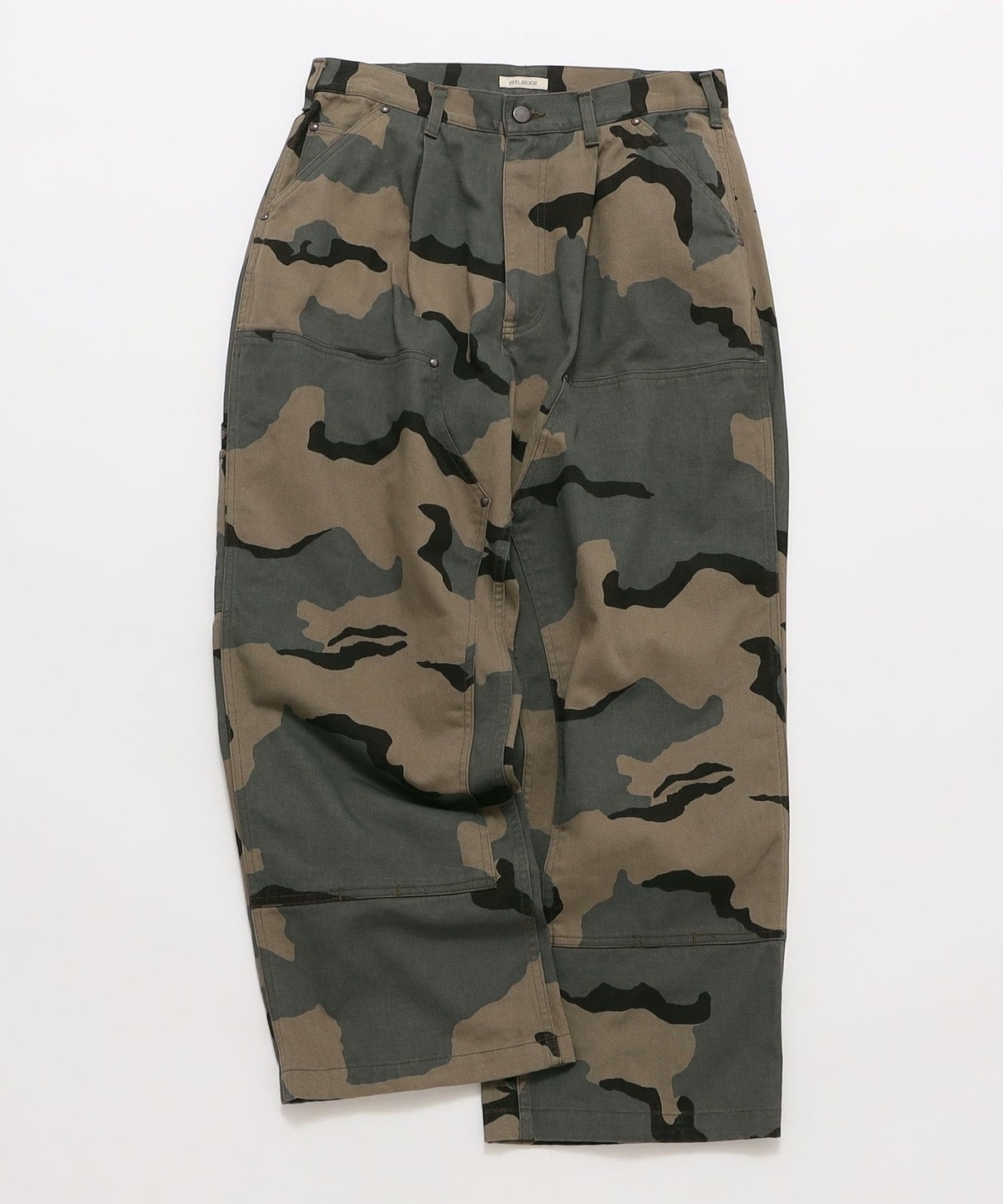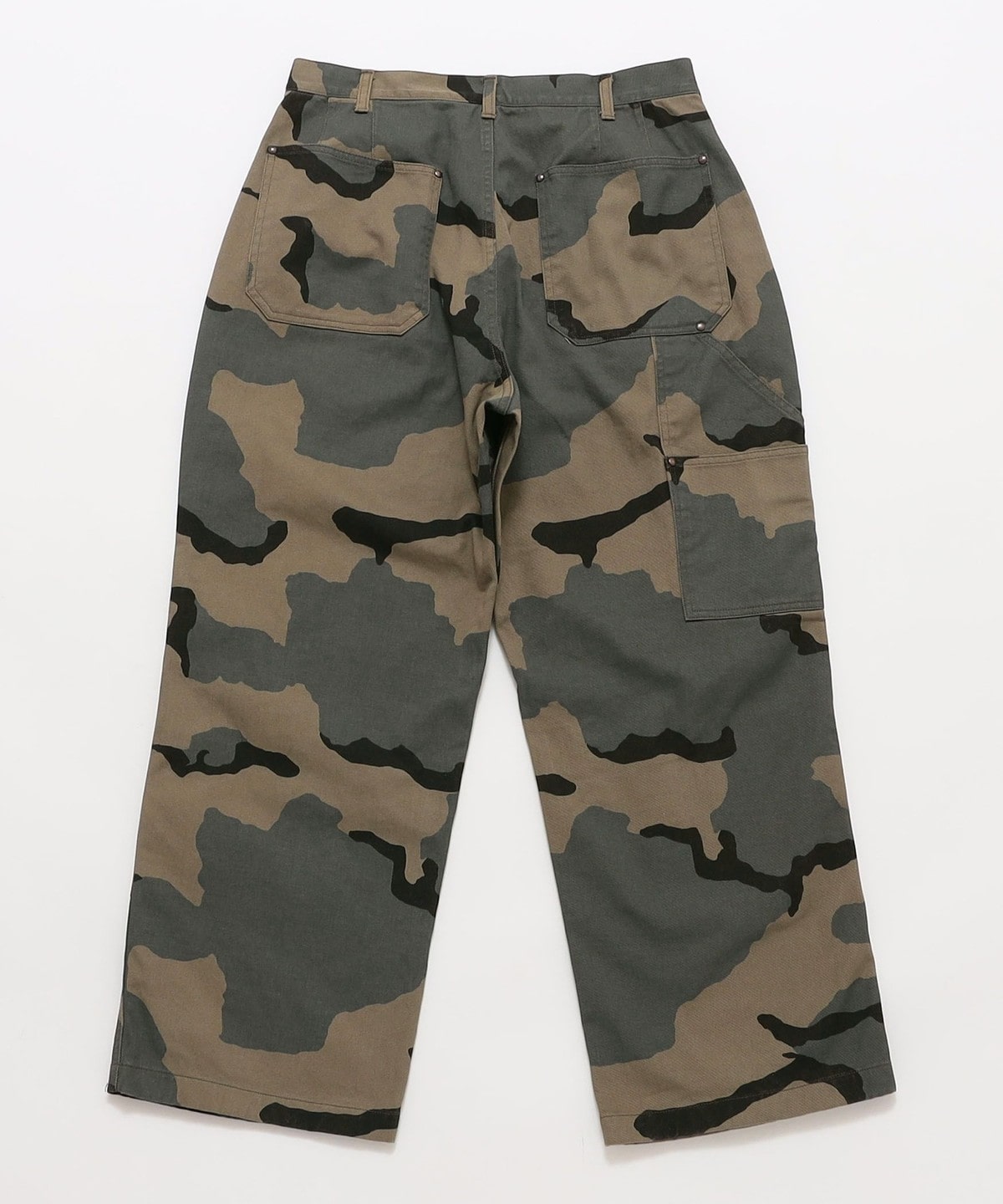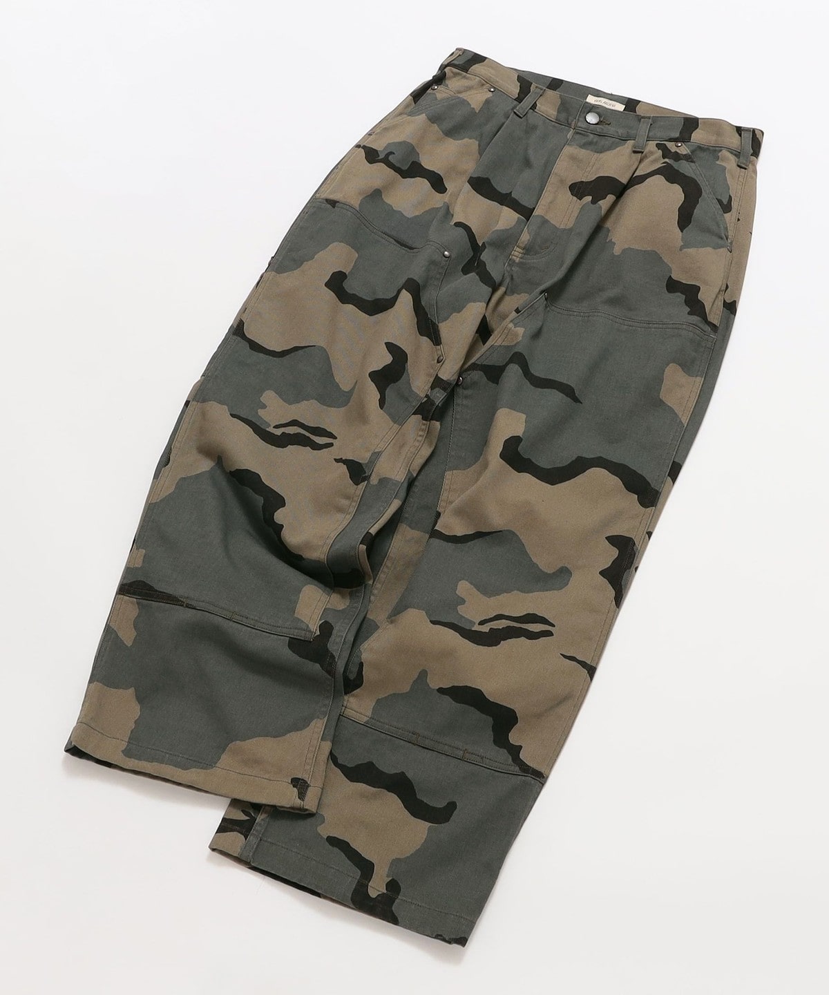 ワイドストレートシルエットのダブルニー仕様を施したペインターパンツ。