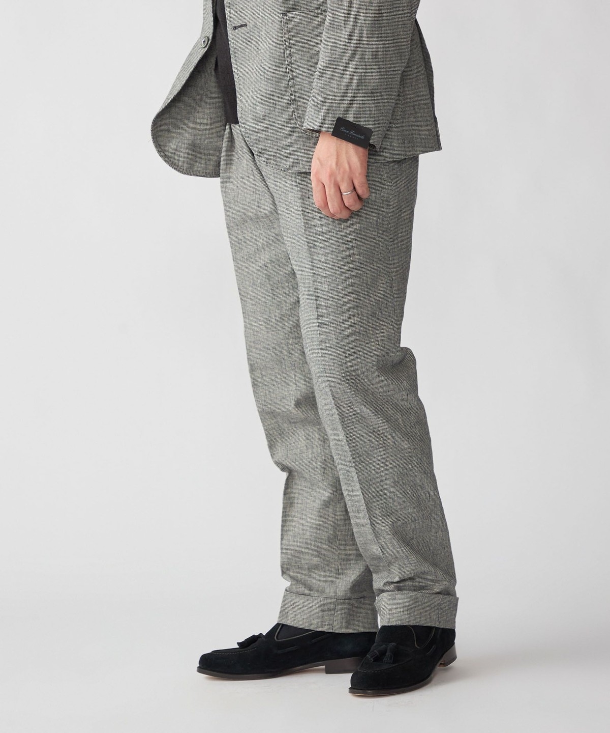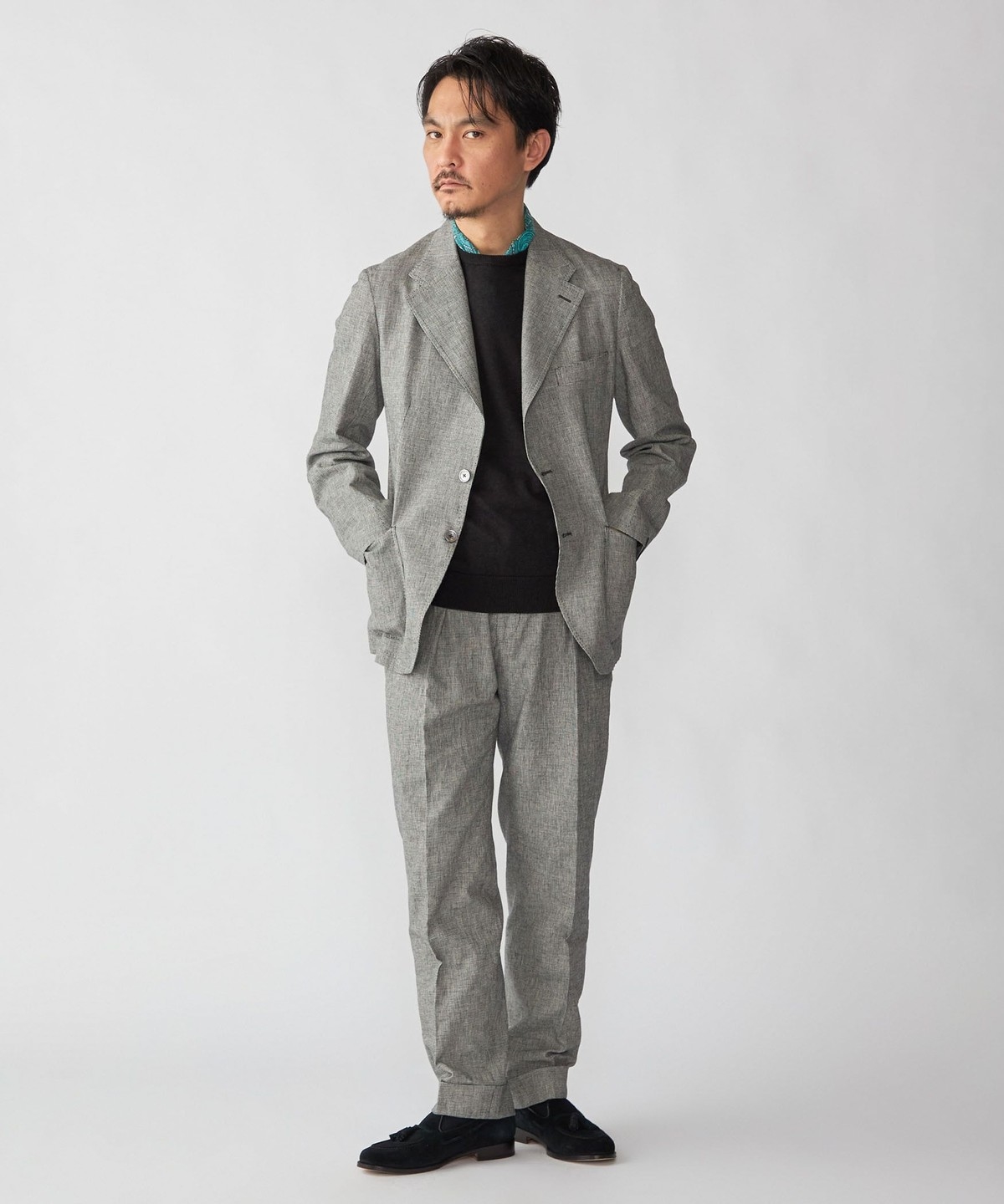 スラックス単品使いもしやすく、ネイビーのリネンジャケットなどと合わせていただくと上品かつ春夏らしいジャケパンスタイルをお楽しみいただけます。
