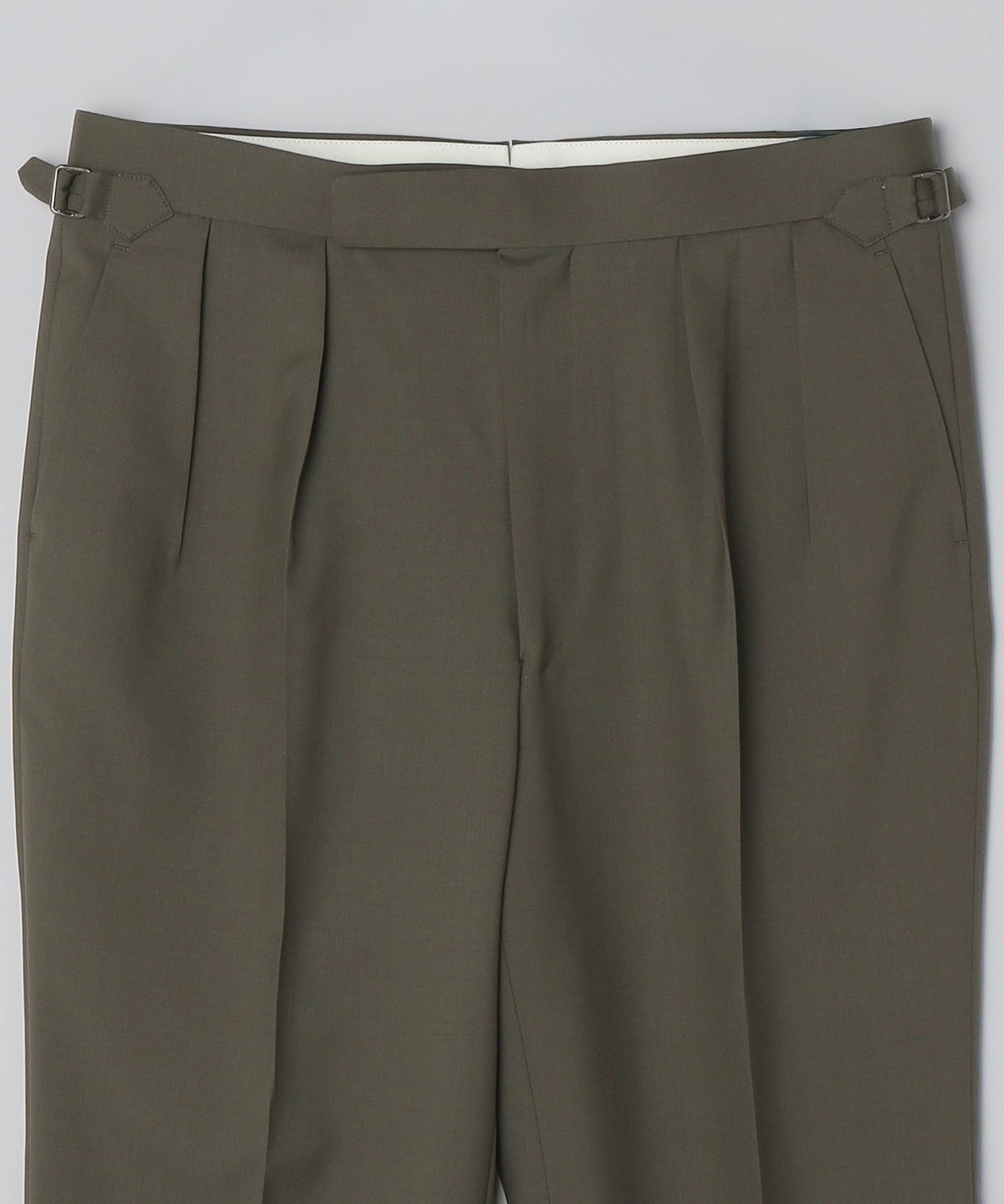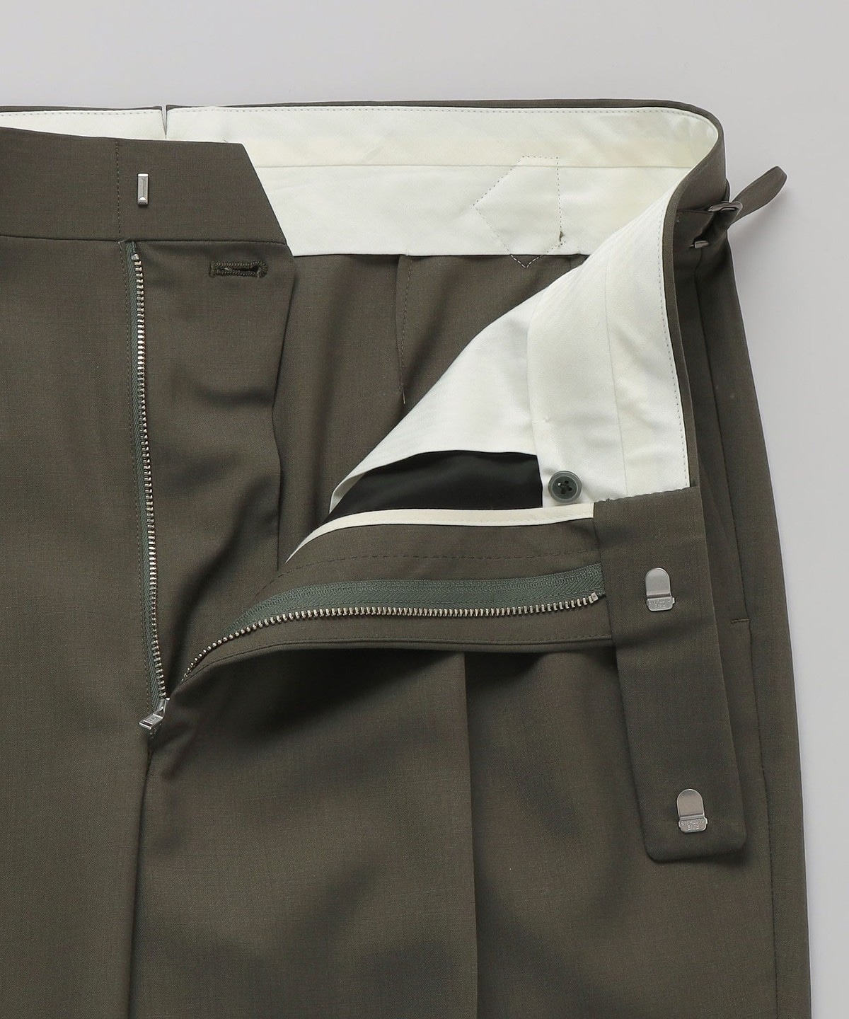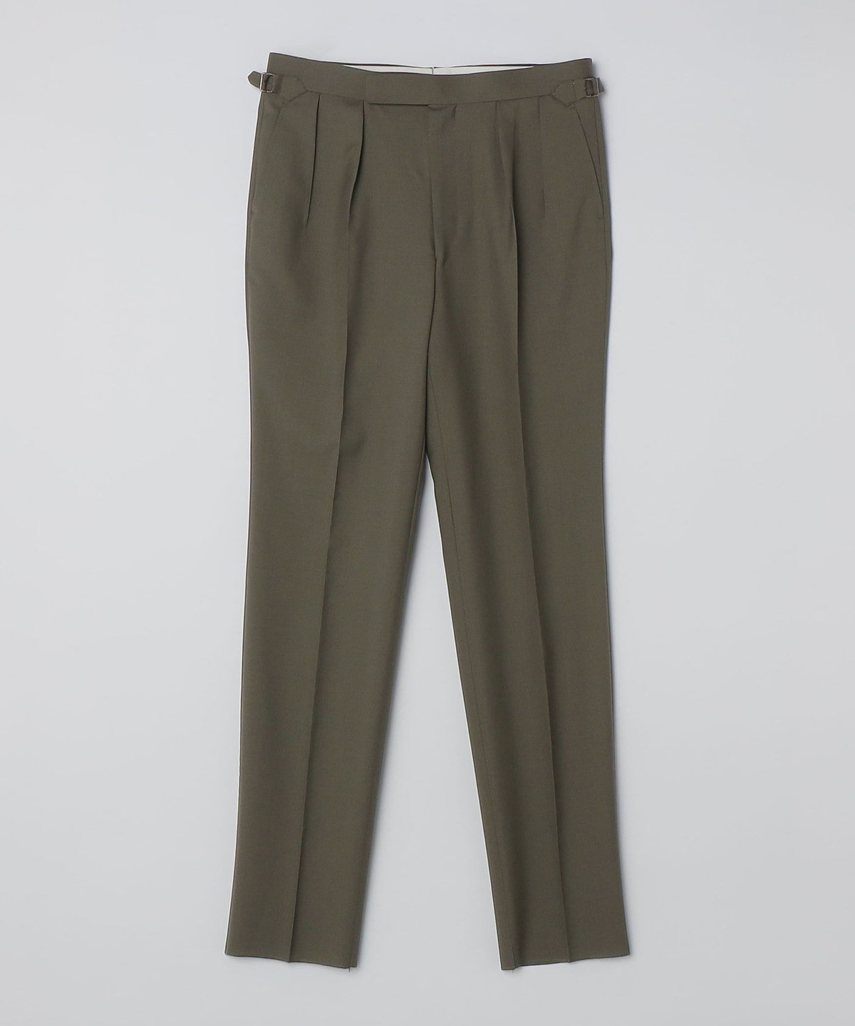 インプリーツに深めの股上、サイドストラップを施した仕様です。