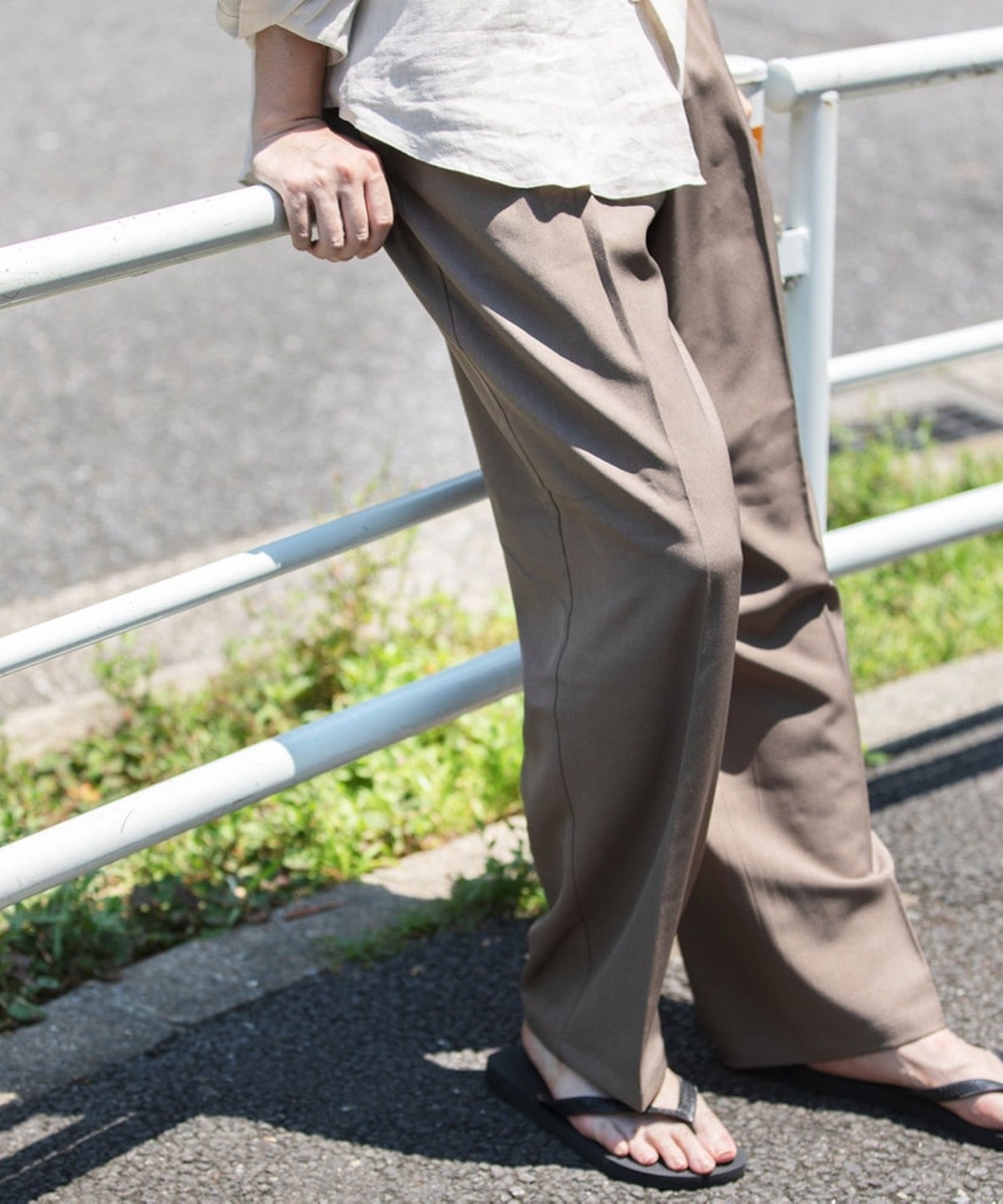 トップスを選ばないスラックスですが、短丈のTシャツやポロシャツなどのタイトなものと合わせるとメリハリのある今っぽいスタイリングに仕上がります。