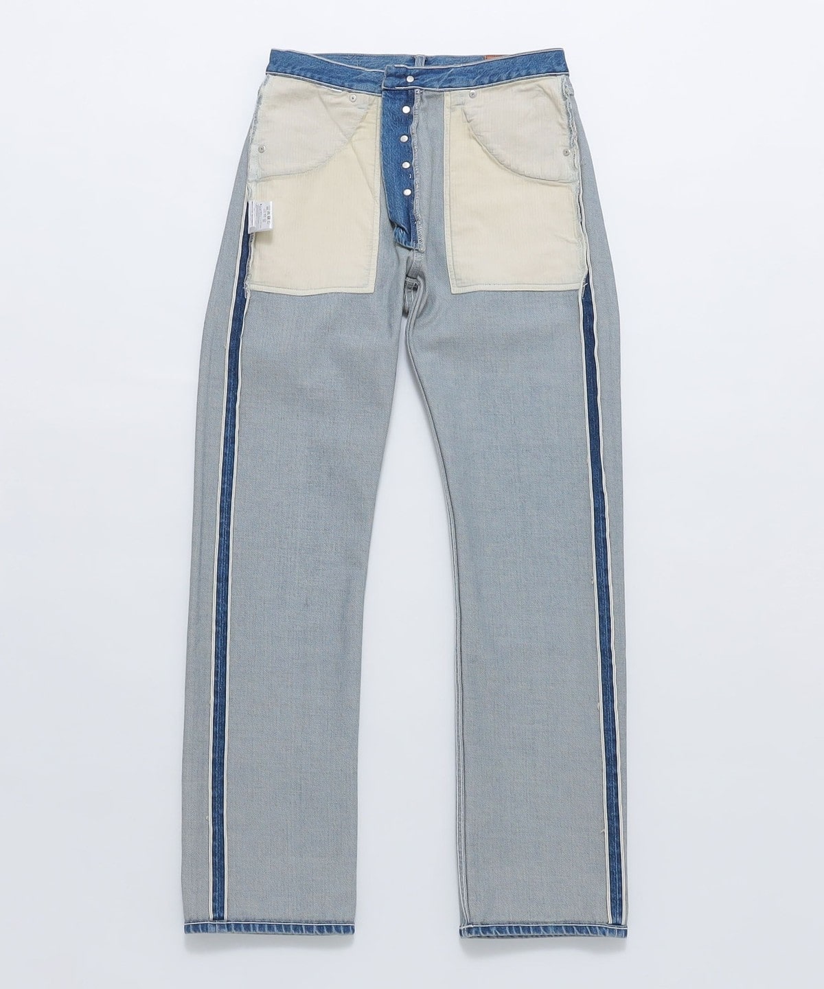 ユニセックスのユーティリティ・ジーンズは、ストレートレッグ、ミッドライズ、ステッチ入りのフロントユーティリティポケット、補強されたリアポケット、ボタンフライのファスナーが特徴です。