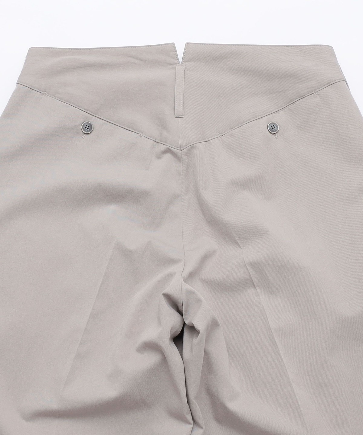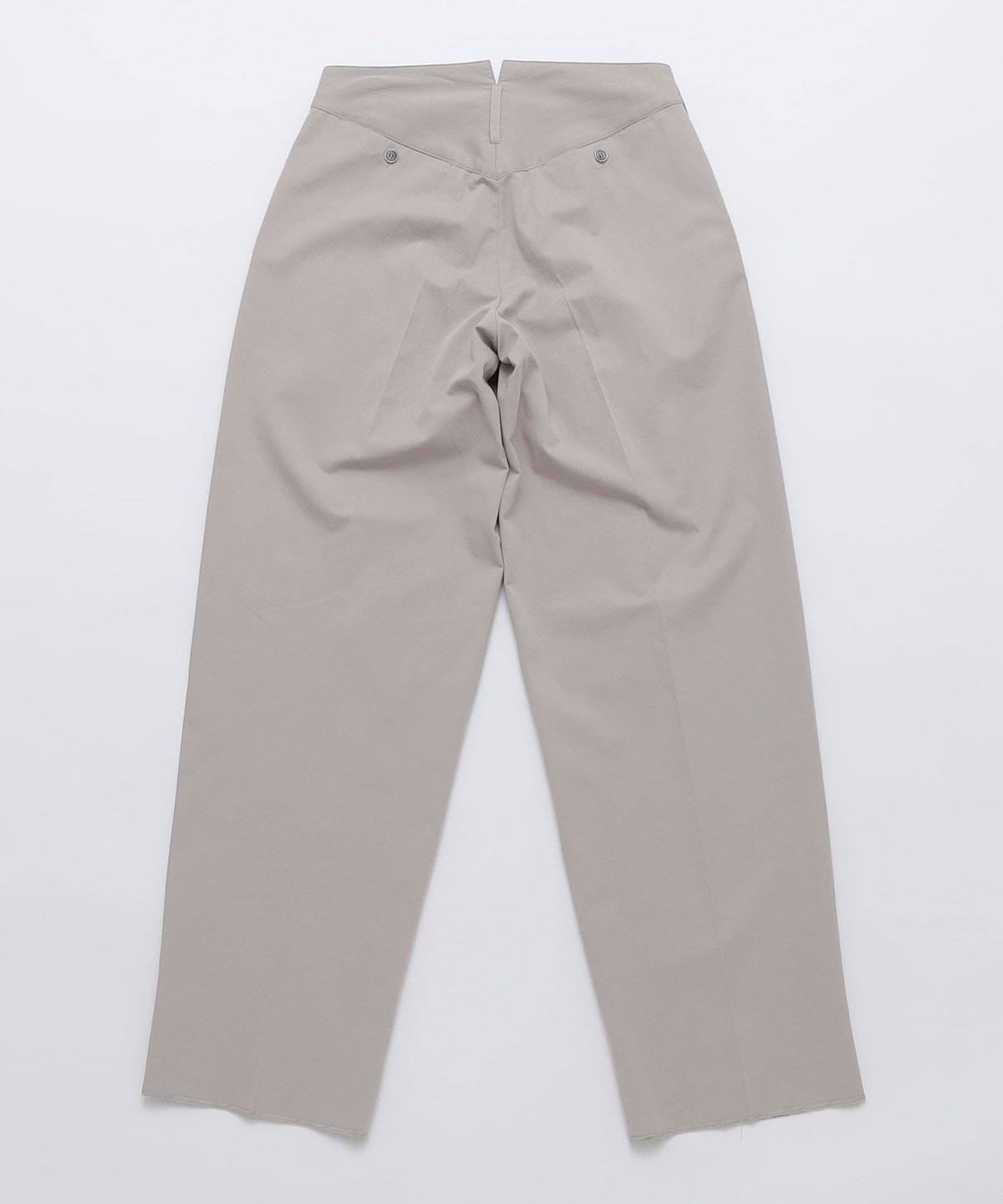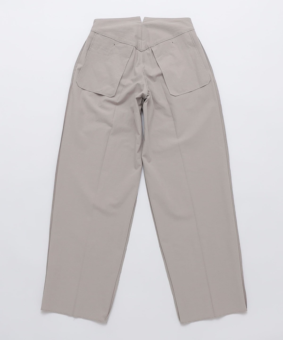 その抑揚のないシルエットを後ろ帯を高めに設定。ウエストに張り付かせ、裾にかけて大きくテーパードさせることでメンズらしい抑揚をつけました。