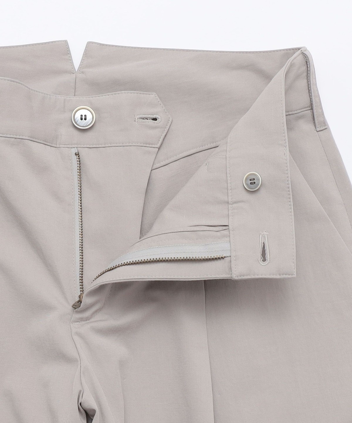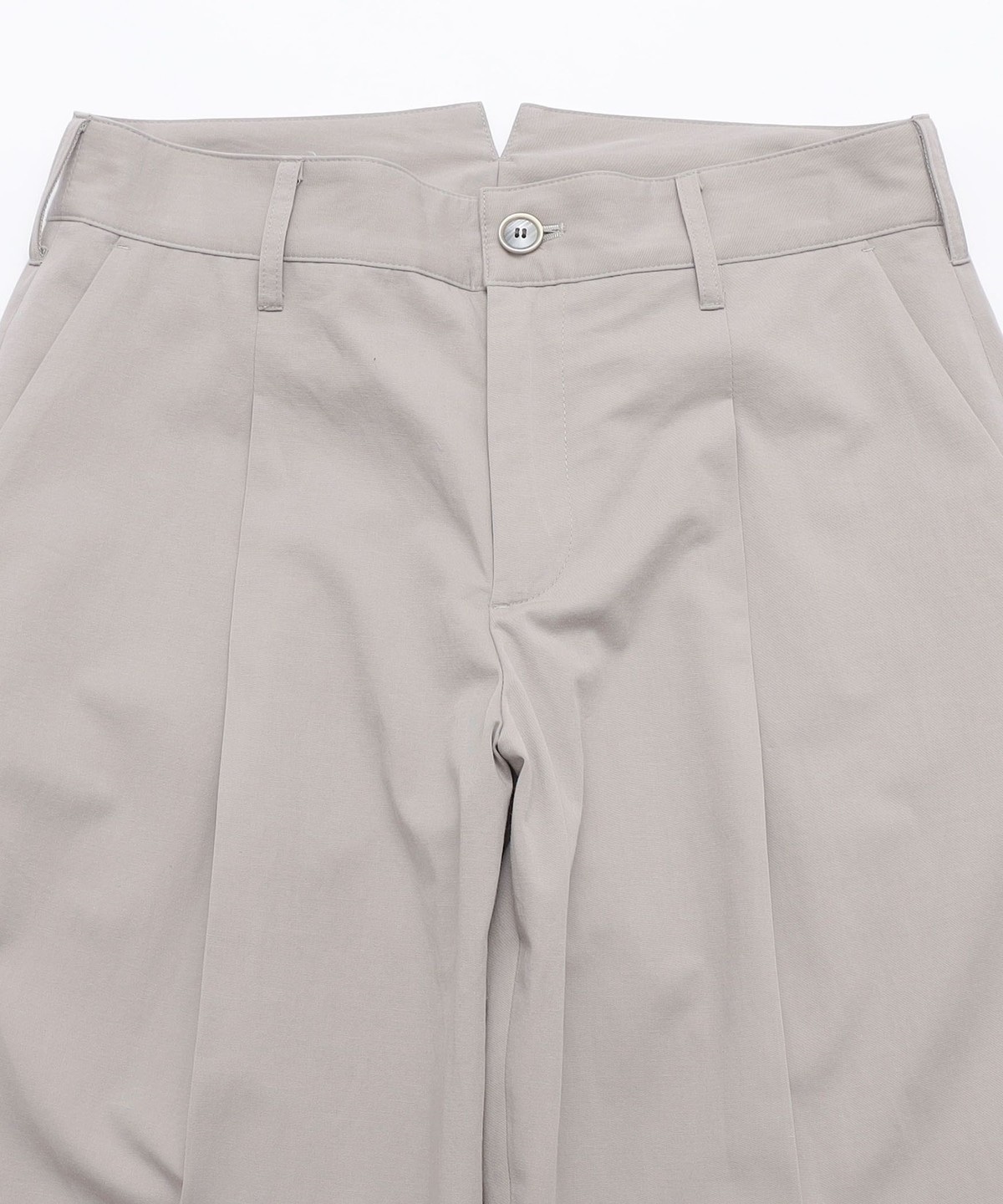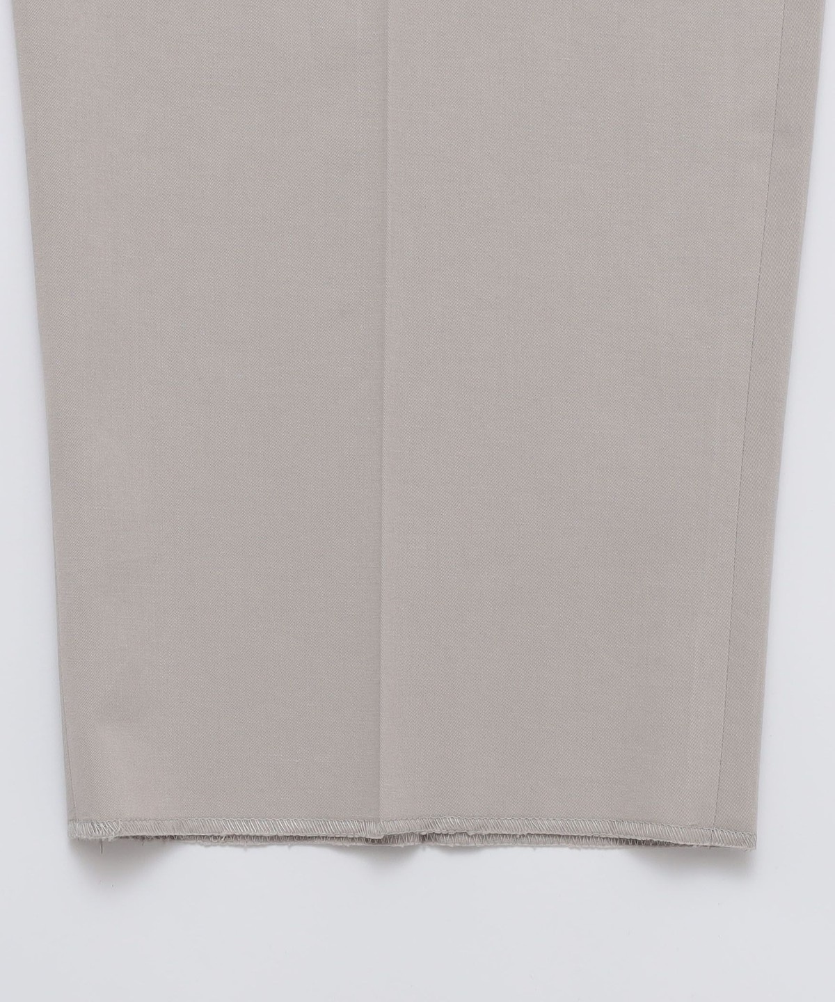 その抑揚のないシルエットを後ろ帯を高めに設定。ウエストに張り付かせ、裾にかけて大きくテーパードさせることでメンズらしい抑揚をつけました。