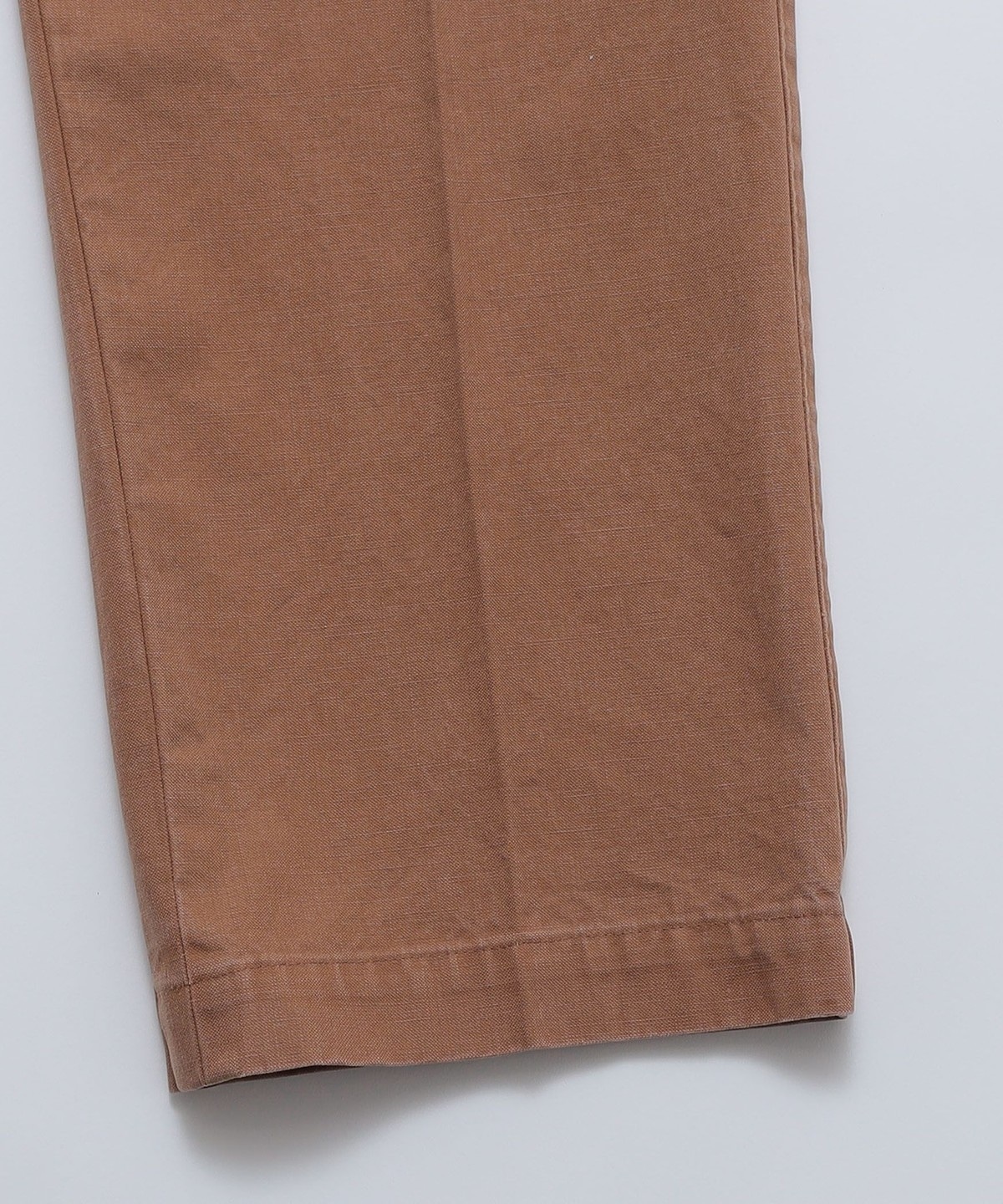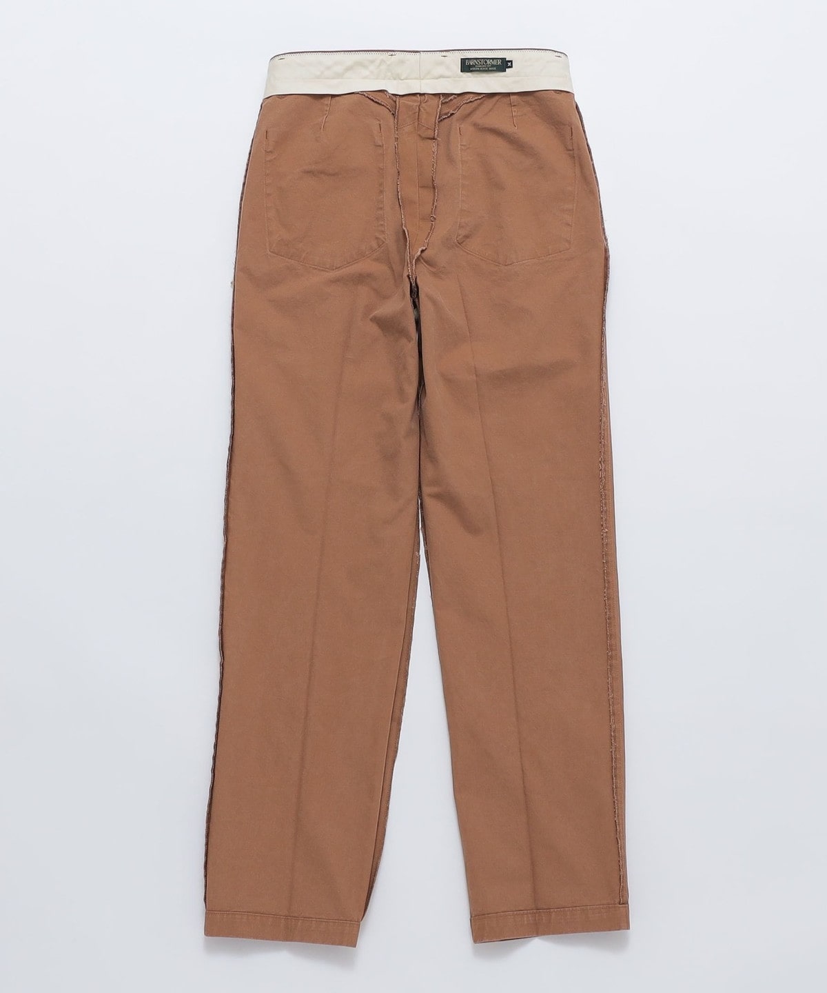 フロントは1プリーツのスラックスタイプで、バックはパッチポケットによりワークパンツのディテールになっています。