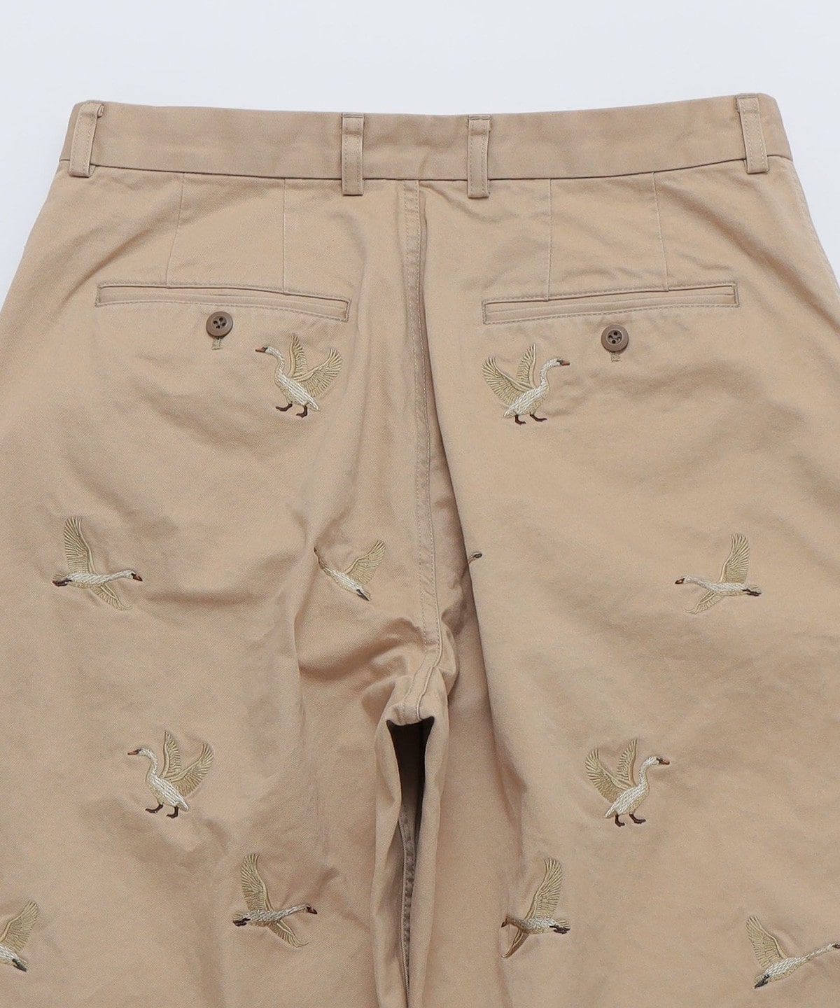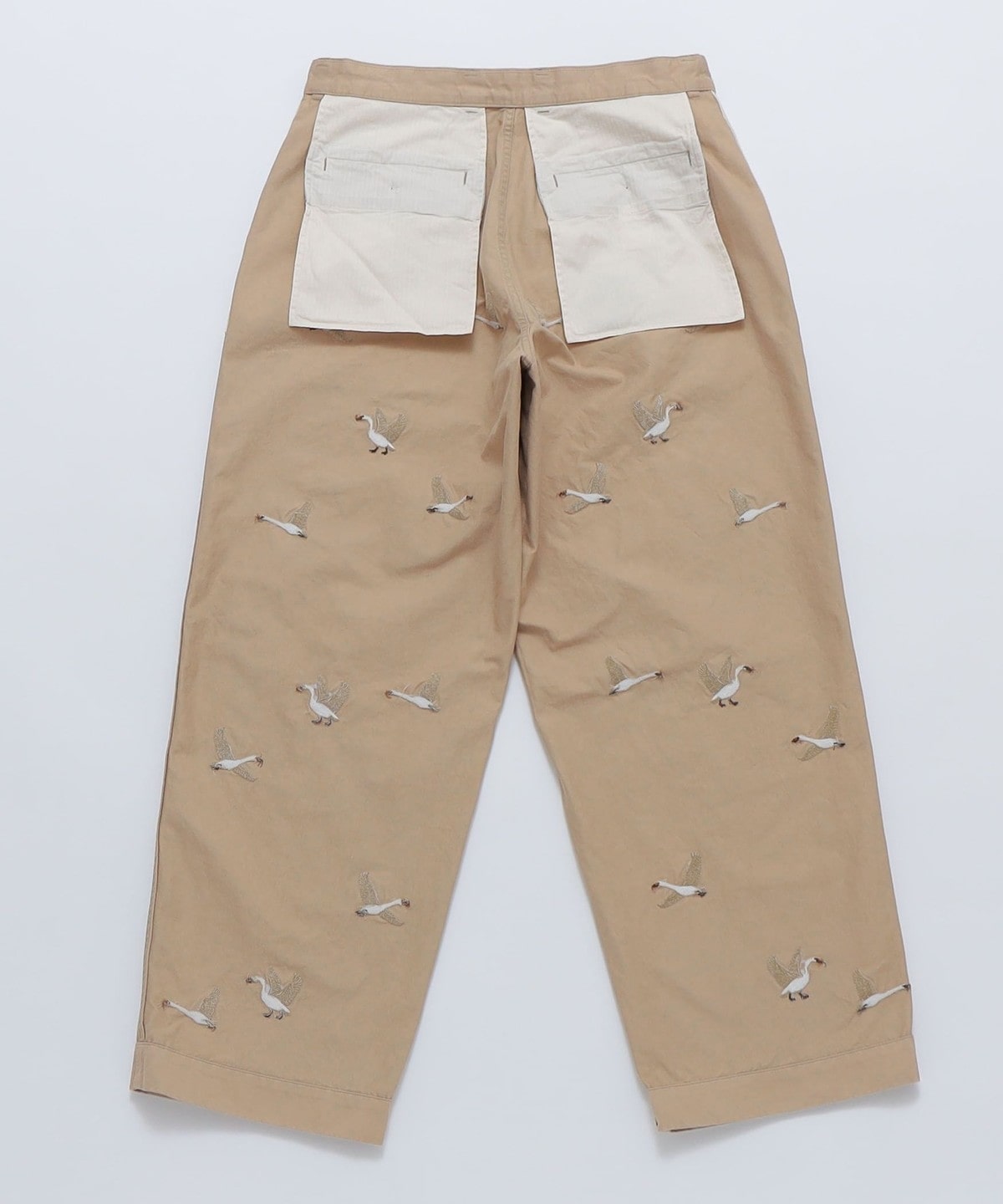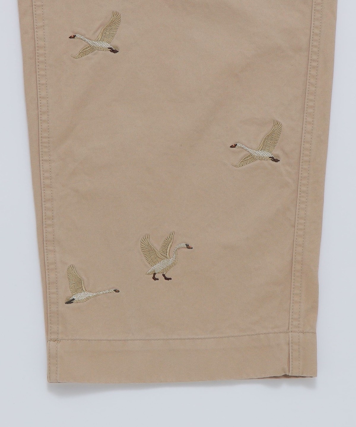 白鳥をモチーフにした刺繍は単調な並びではなく、生地の段階で製品のパンツになった時のバランスを考え配置しています。