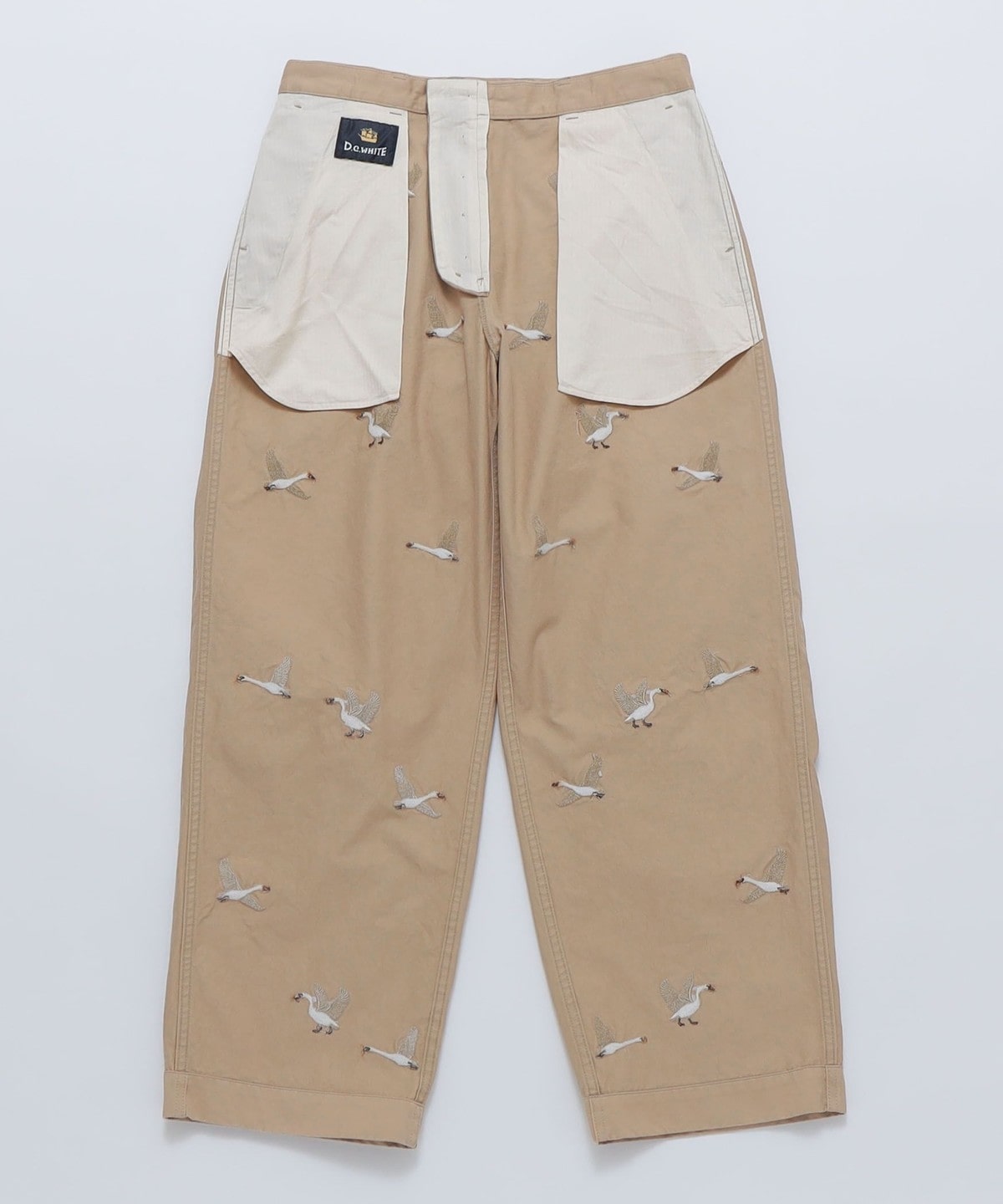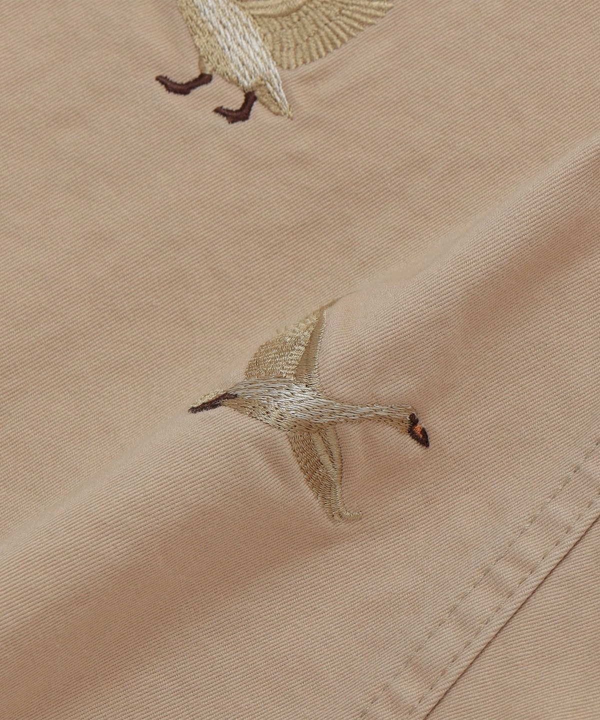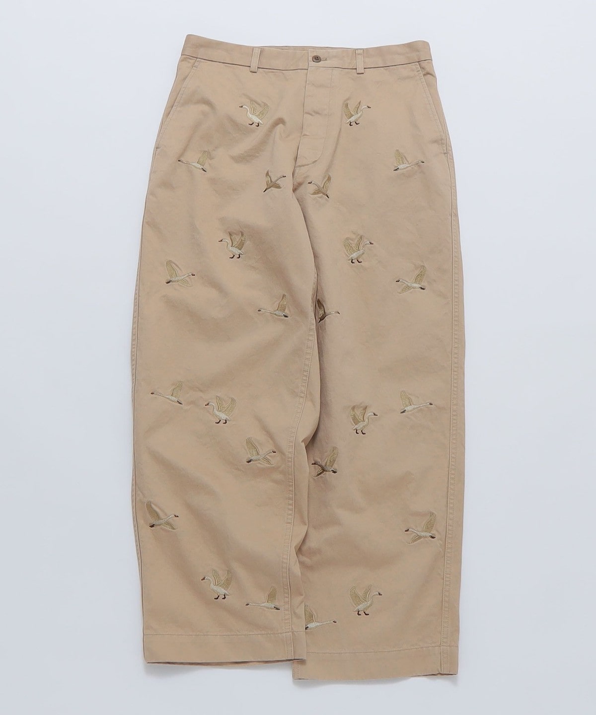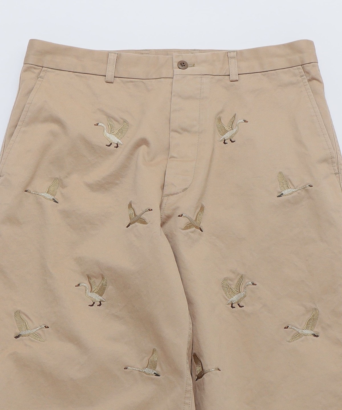 白鳥をモチーフにした刺繍は単調な並びではなく、生地の段階で製品のパンツになった時のバランスを考え配置しています。