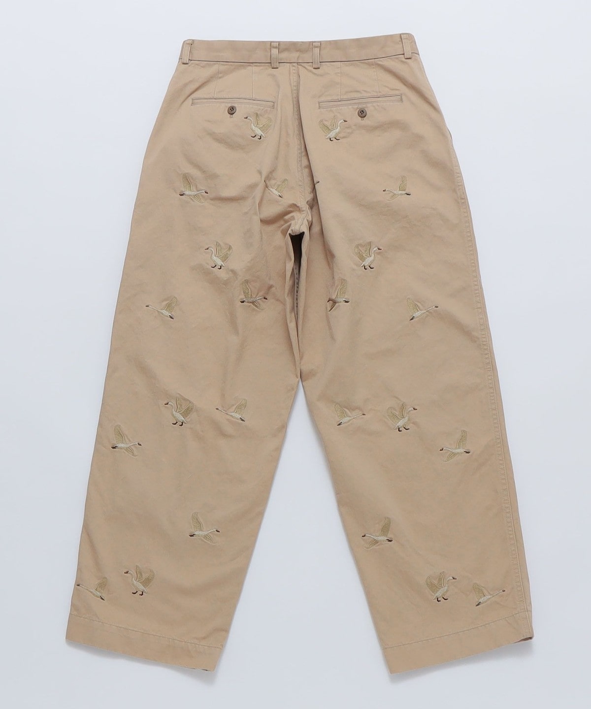 ウェストポイント素材を使用した、ほぼ絞りのないワイドなシルエットのチノ。
