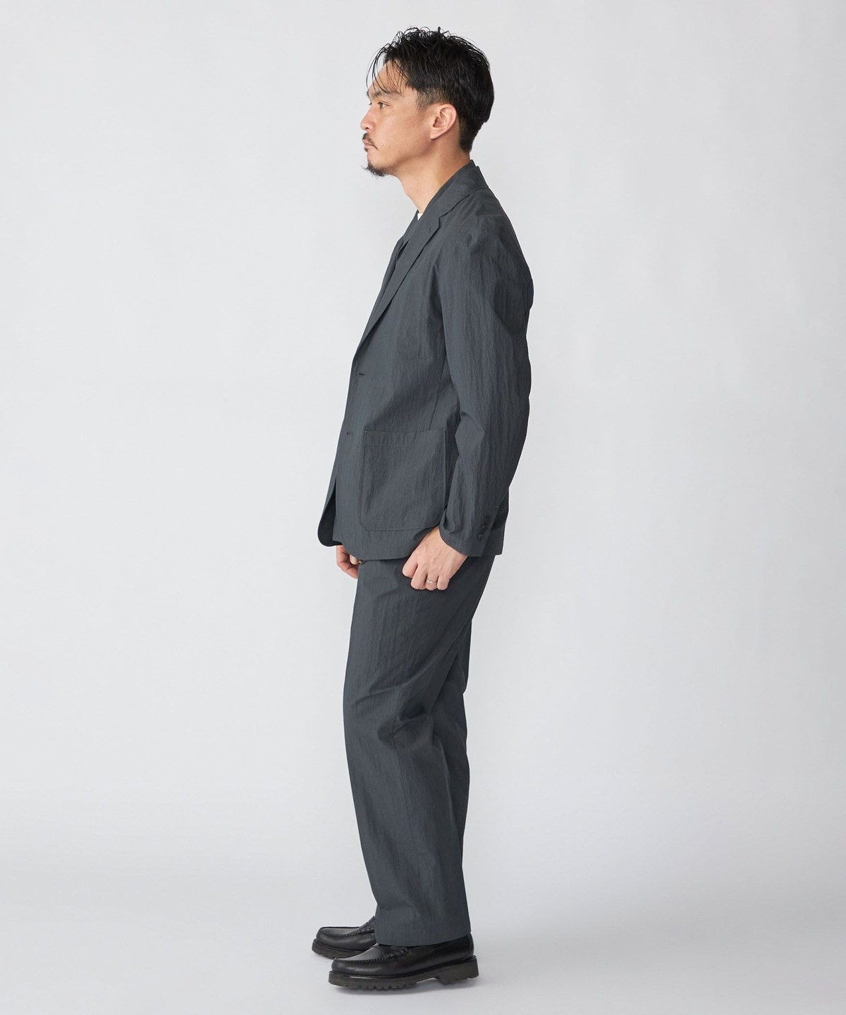 共生地のジャケットやシャツを使用したセットアップスタイルがおすすめです。