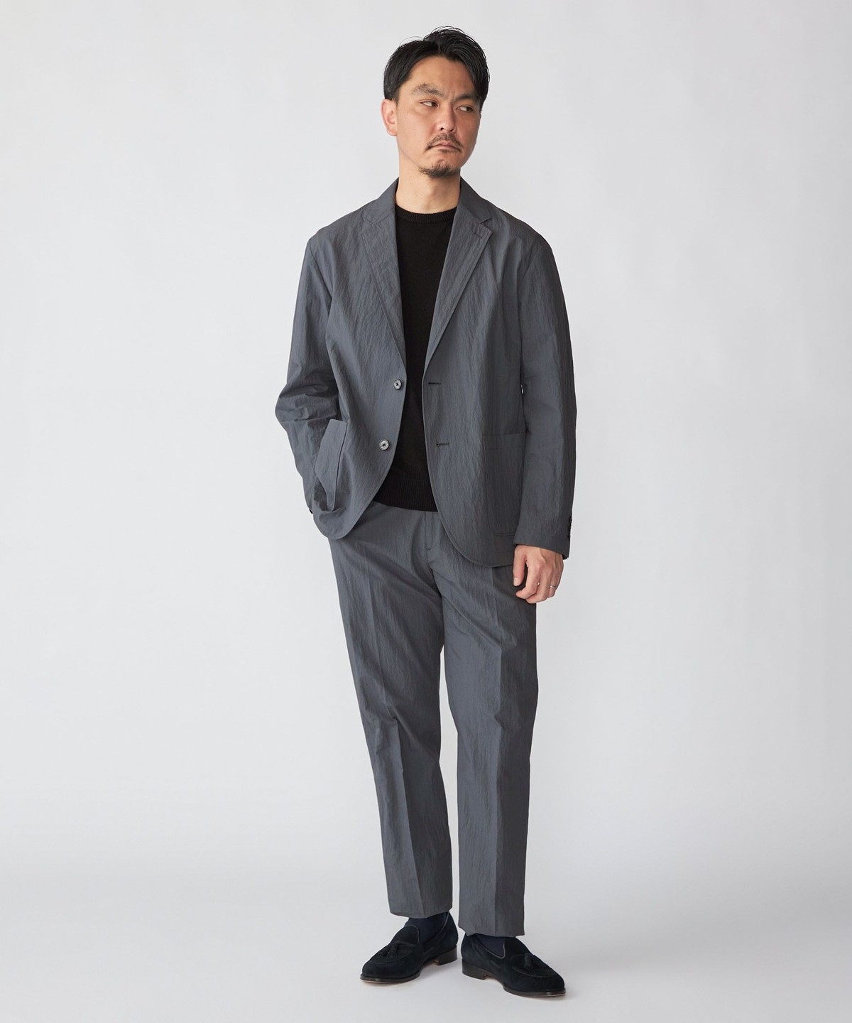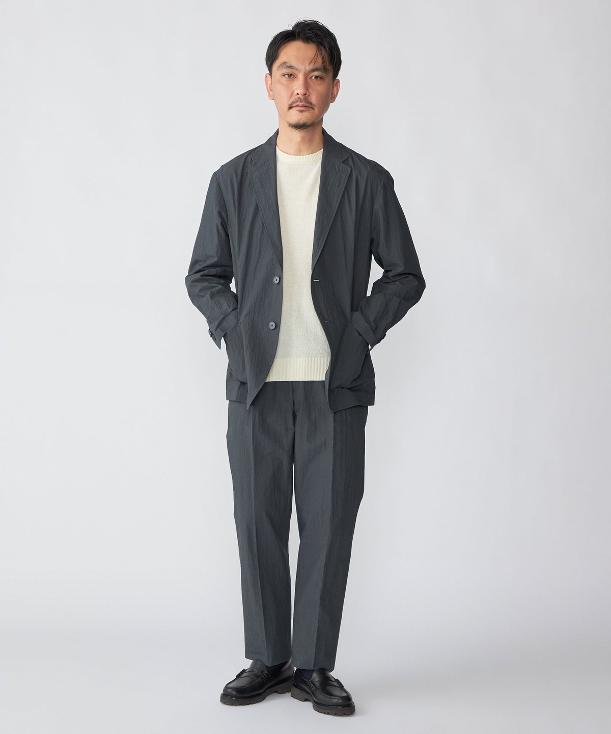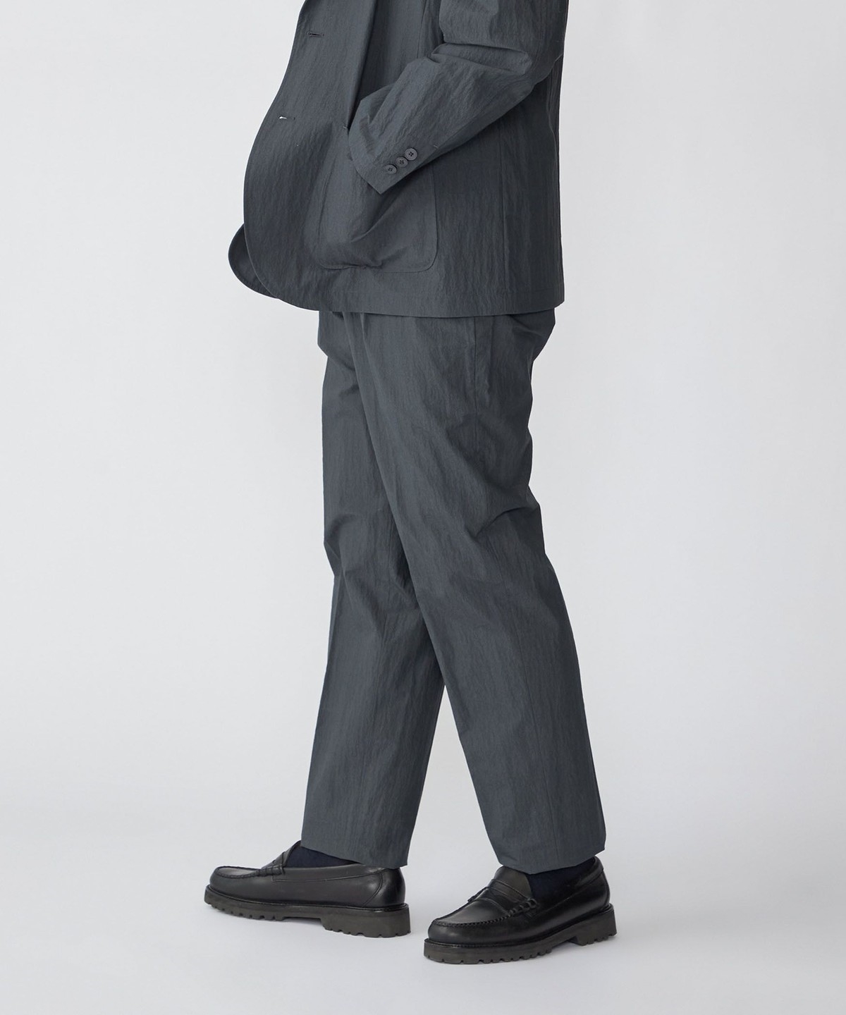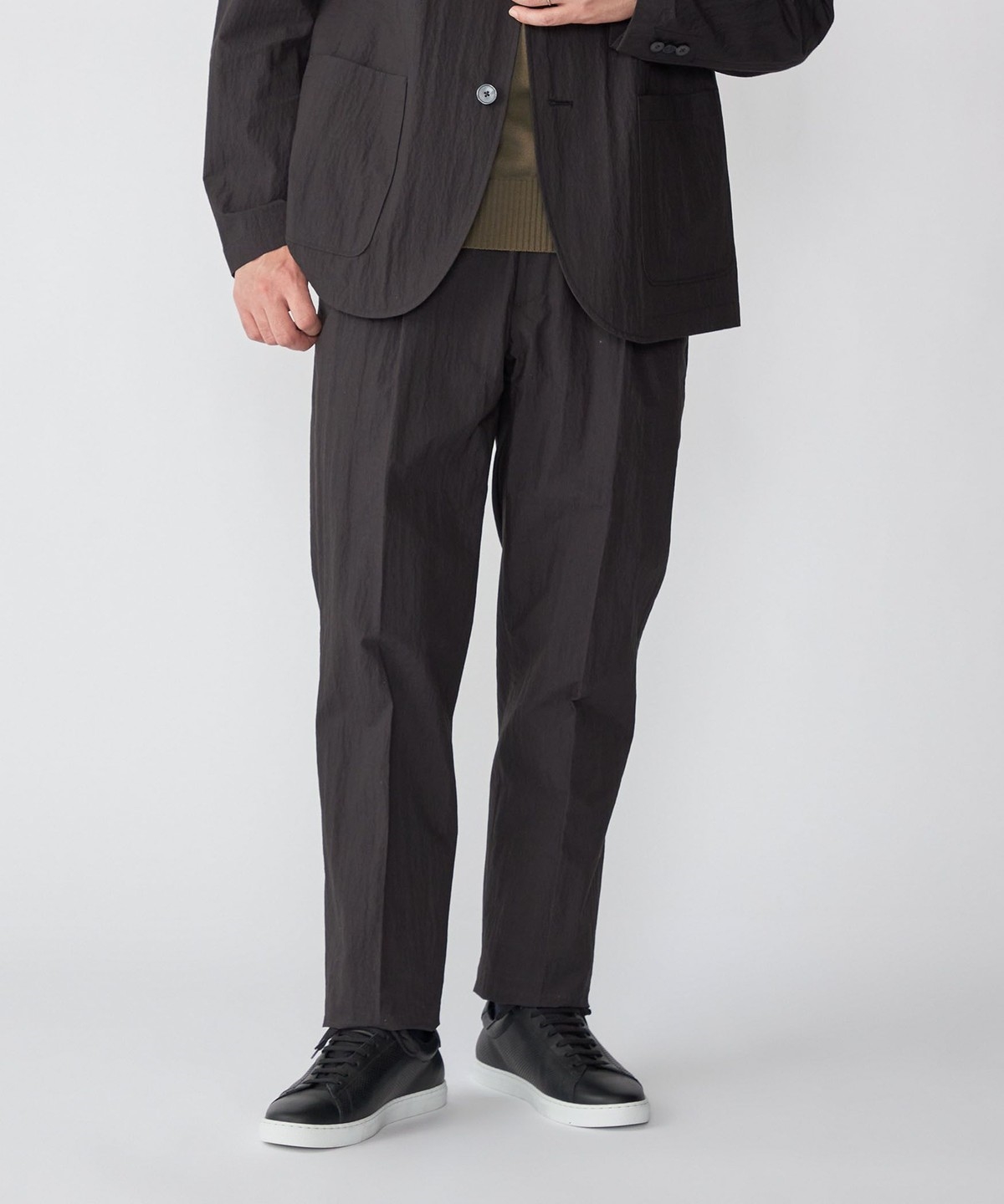 同素材でセットアップ着用可能なジャケット・シャツとシルエット違いのパンツを展開。