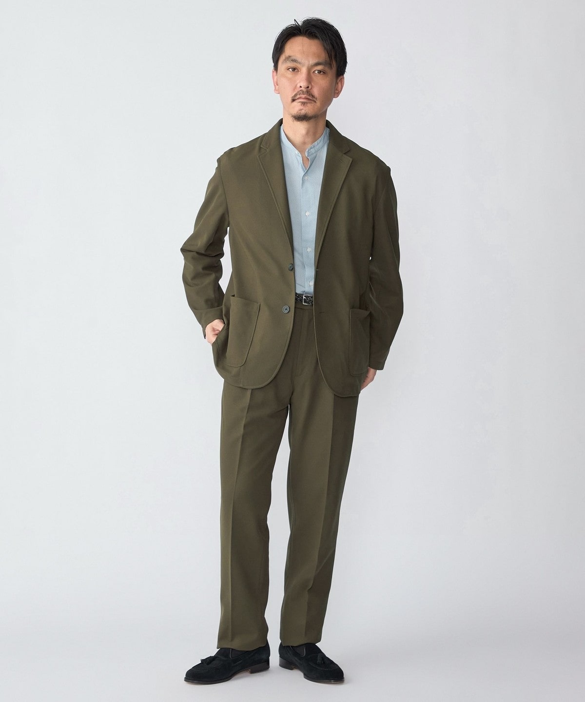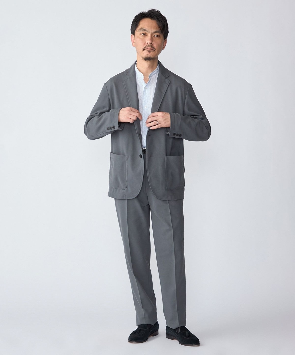 共生地のジャケットを使用したセットアップスタイルがおすすめです。