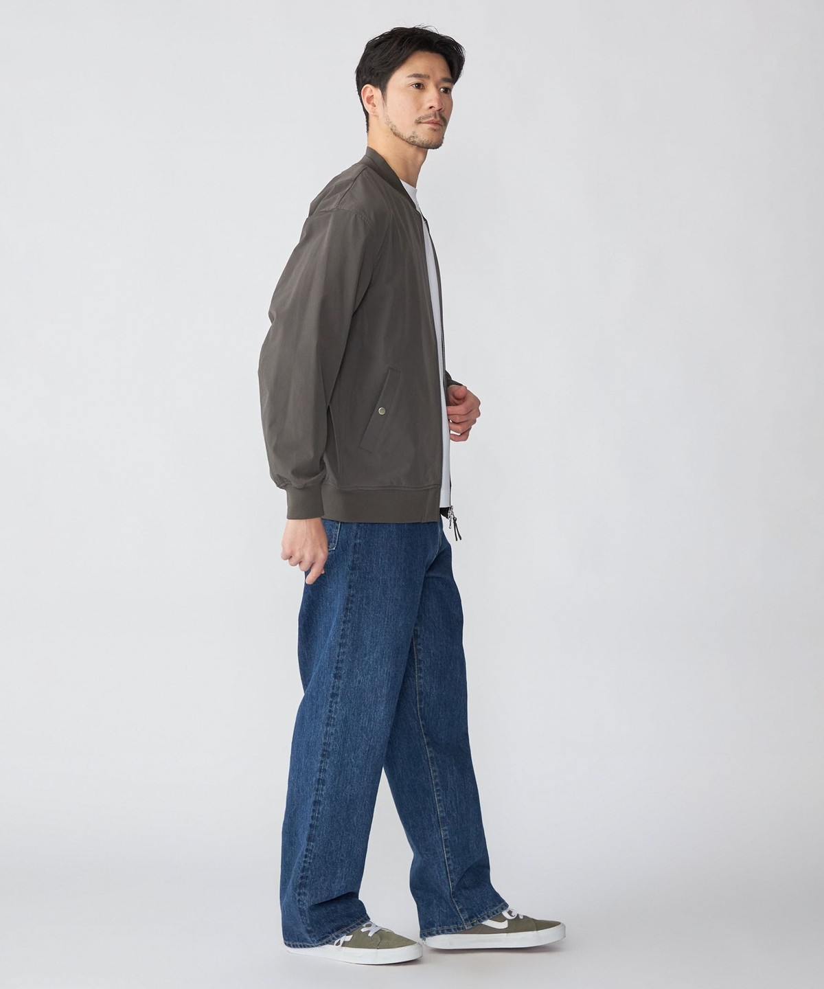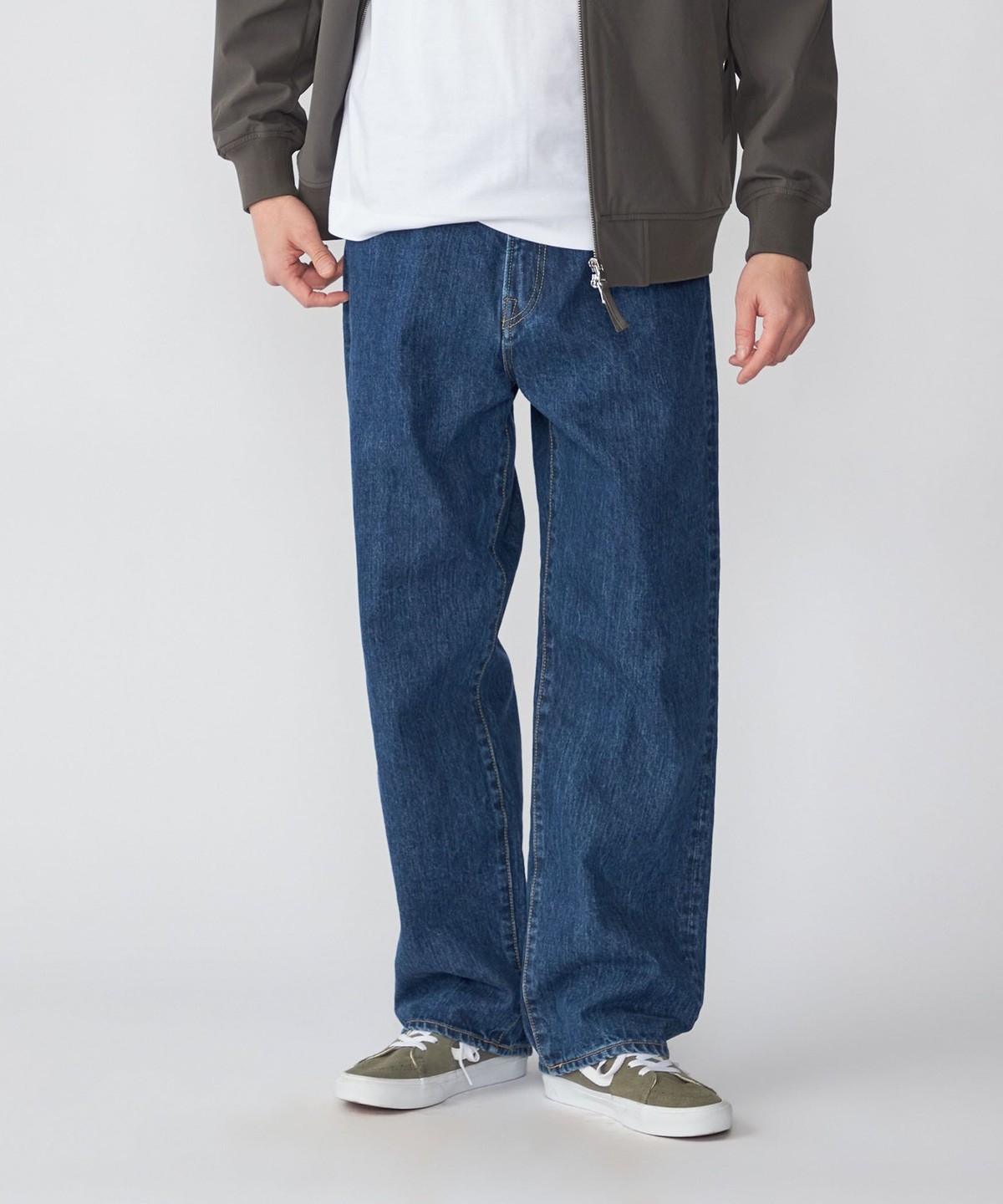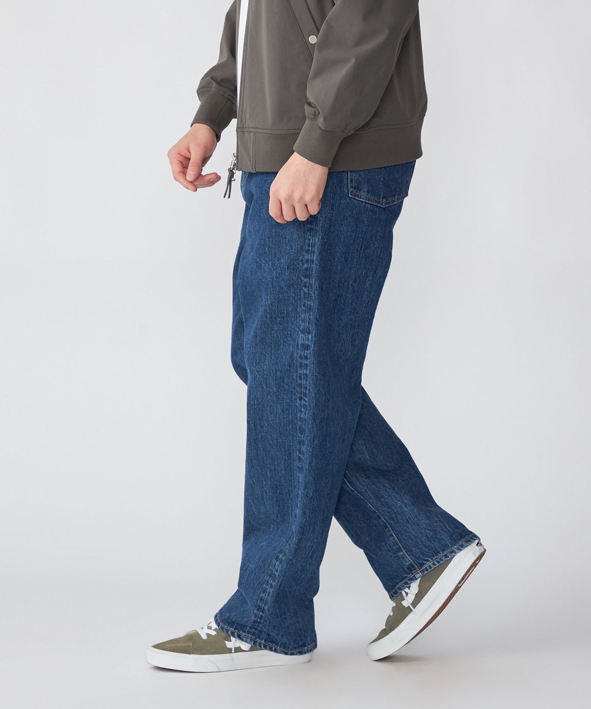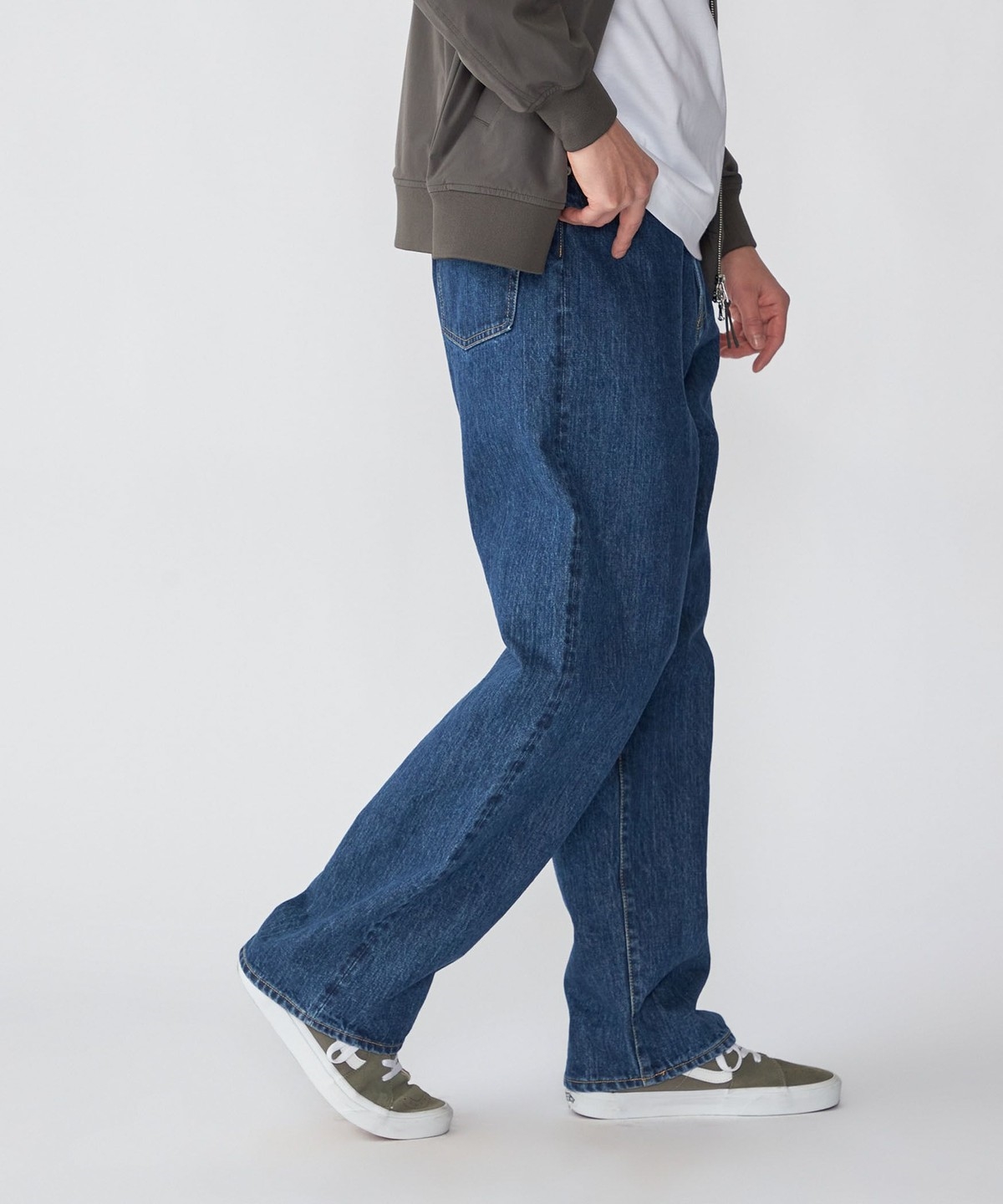 ヒップにゆとりを持たせ、ワタリから裾にかけて太さをキープしたワイド感と、ほど良いジャストレングスが特徴です。