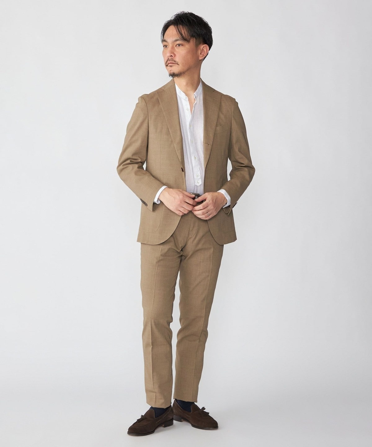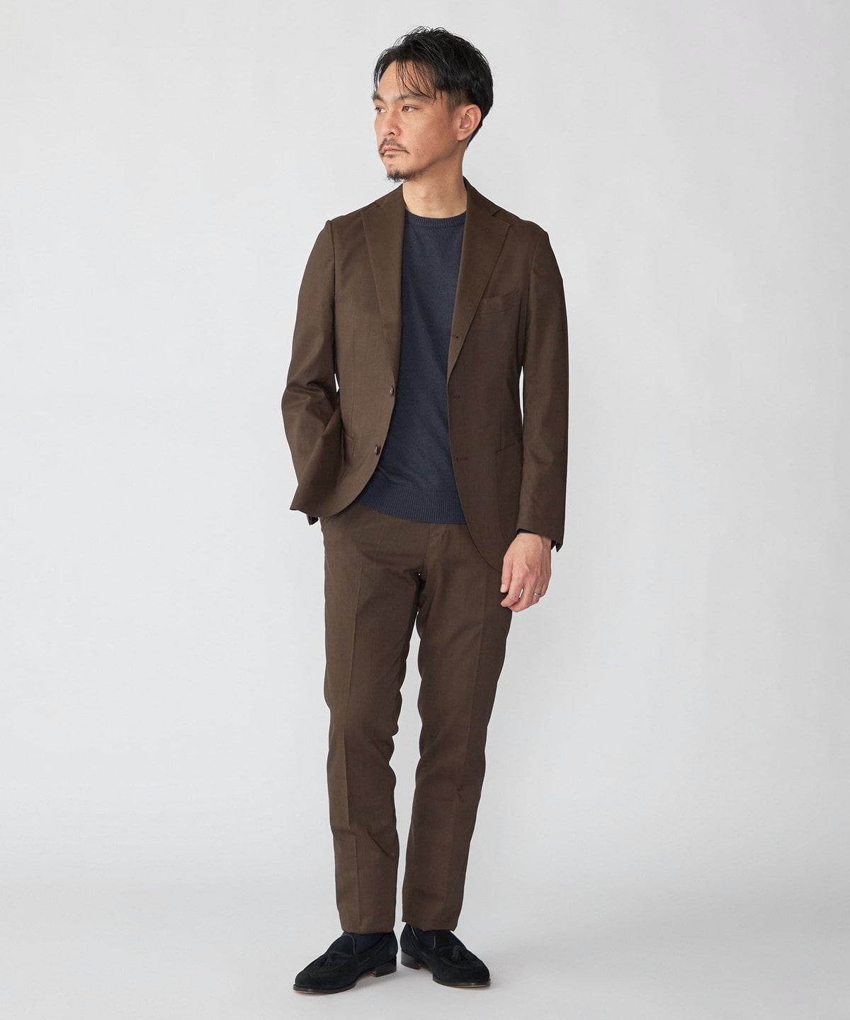 共地のジャケットと合わせてセットアップでの着用がおすすめです。
