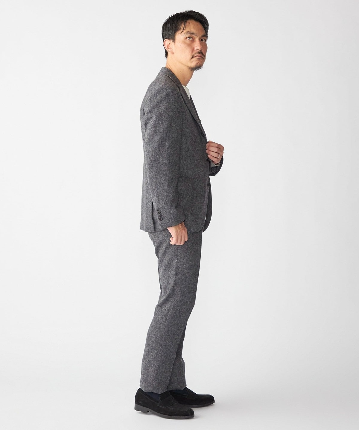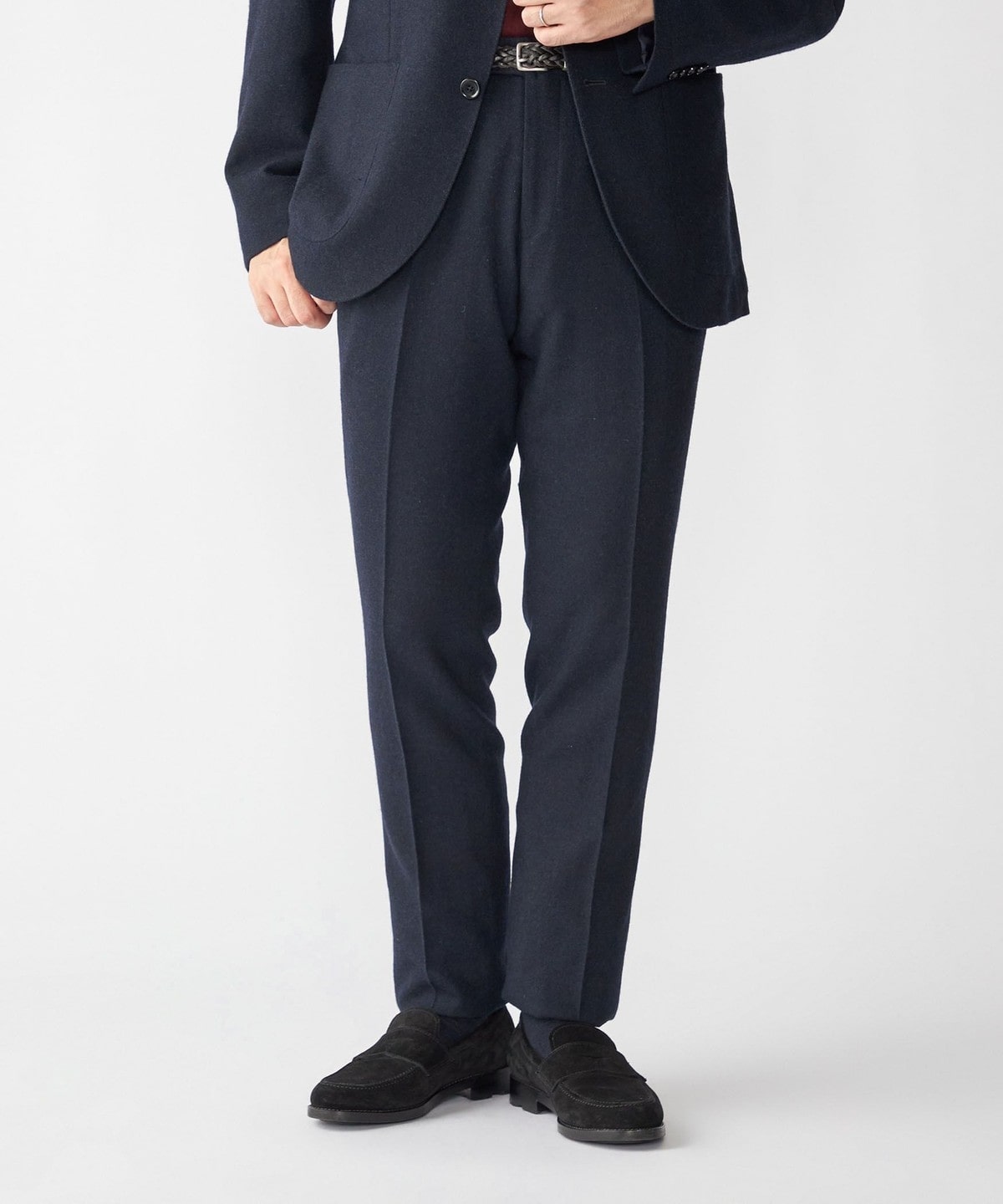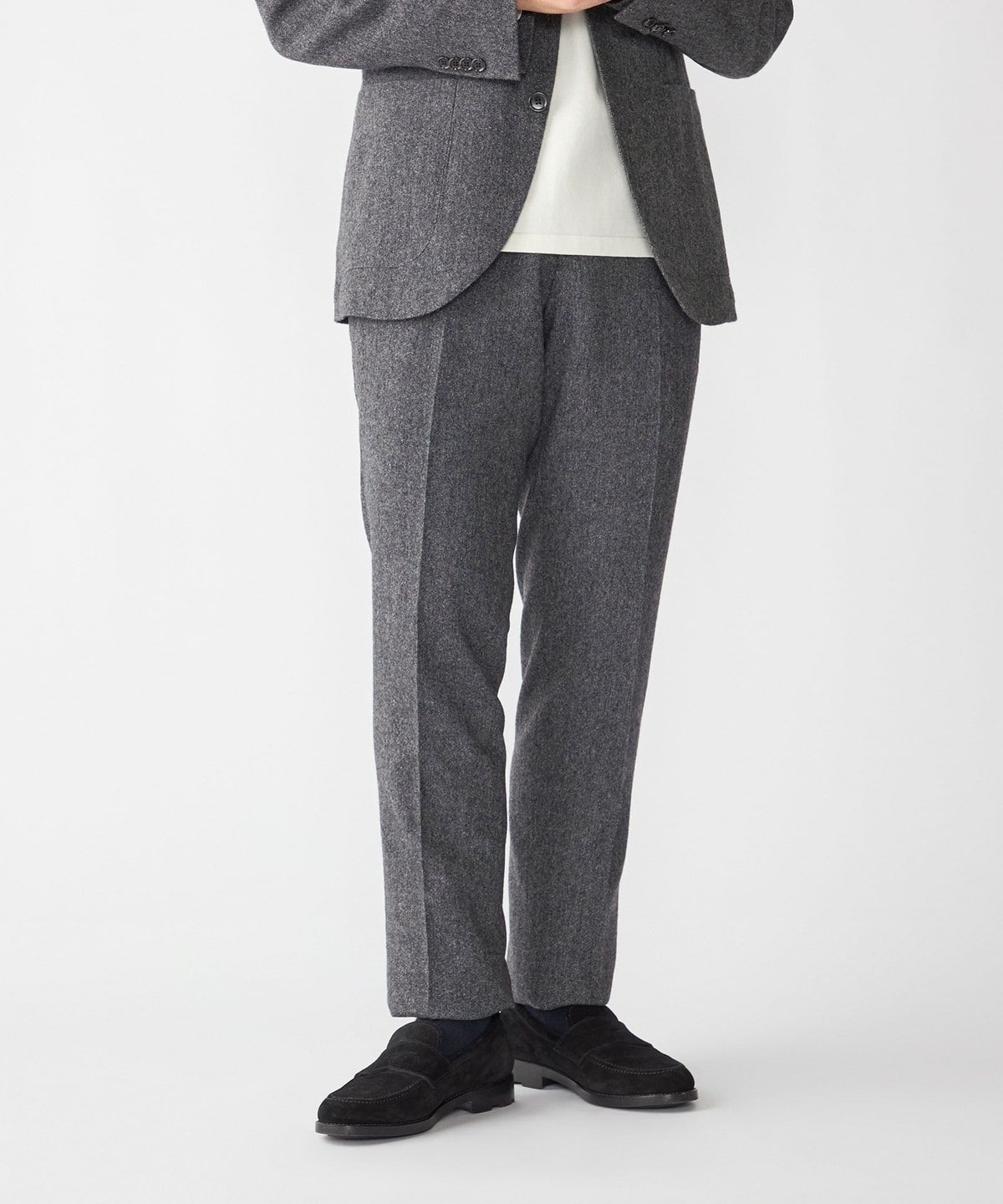 すっきりとした細身のスラックスなので、スラックス単品でも使っていただきやすい一着です。