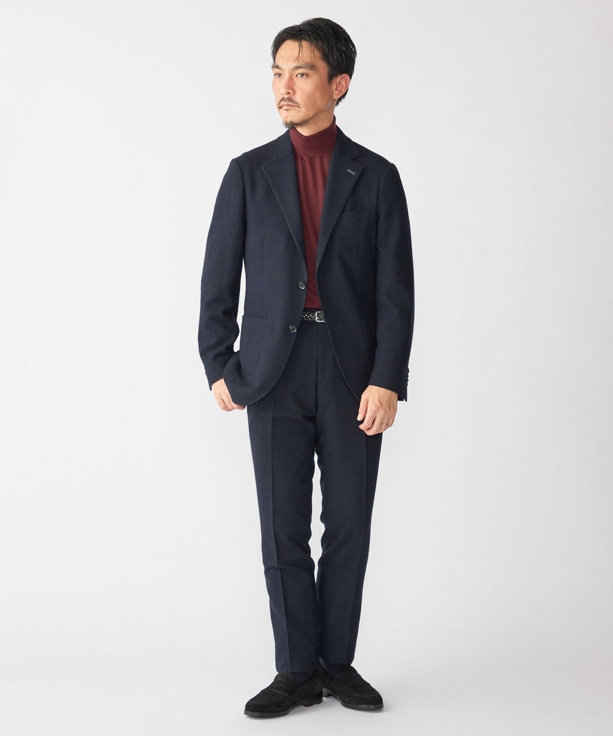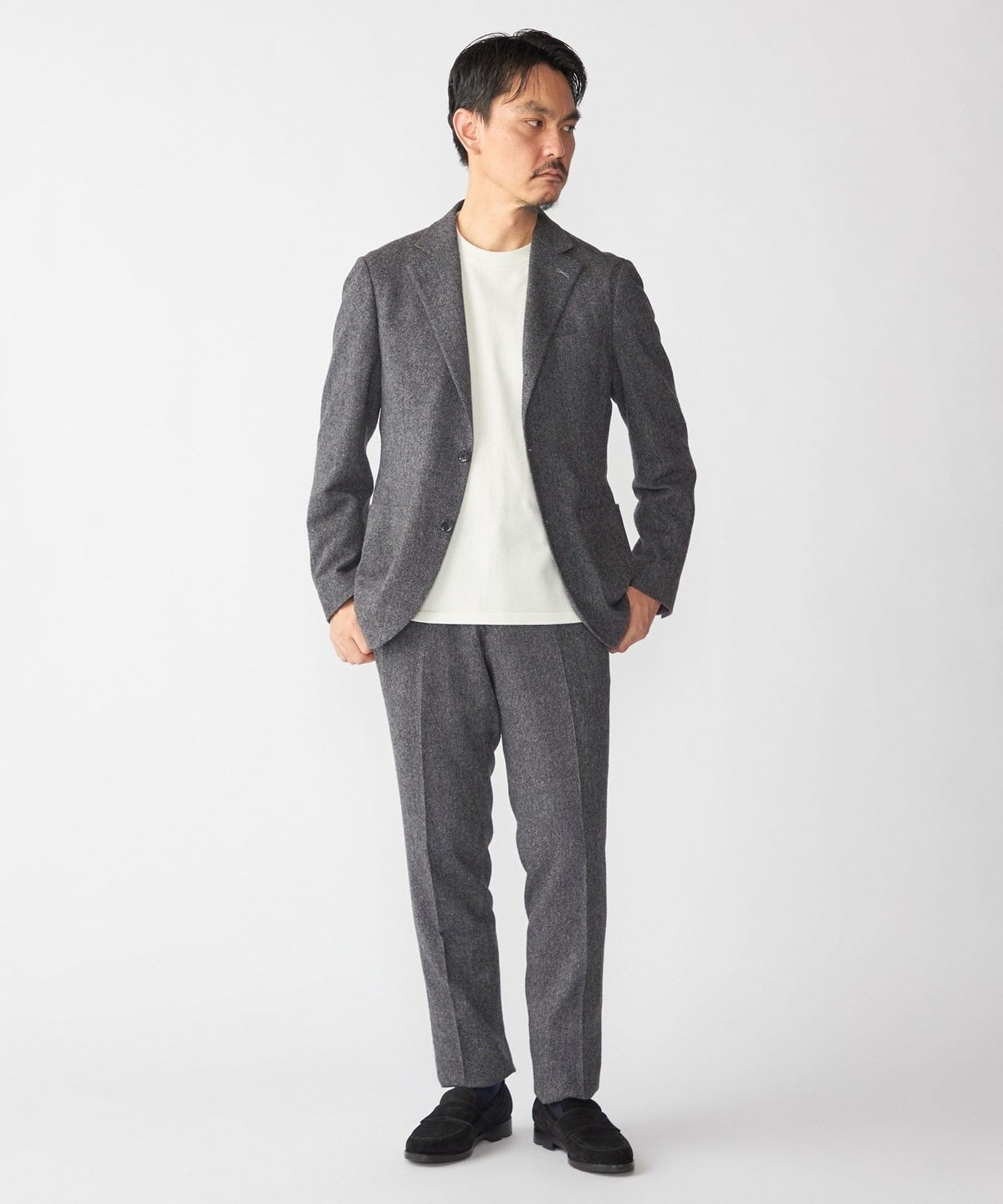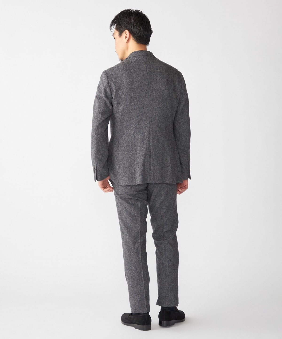 すっきりとした細身のスラックスなので、スラックス単品でも使っていただきやすい一着です。