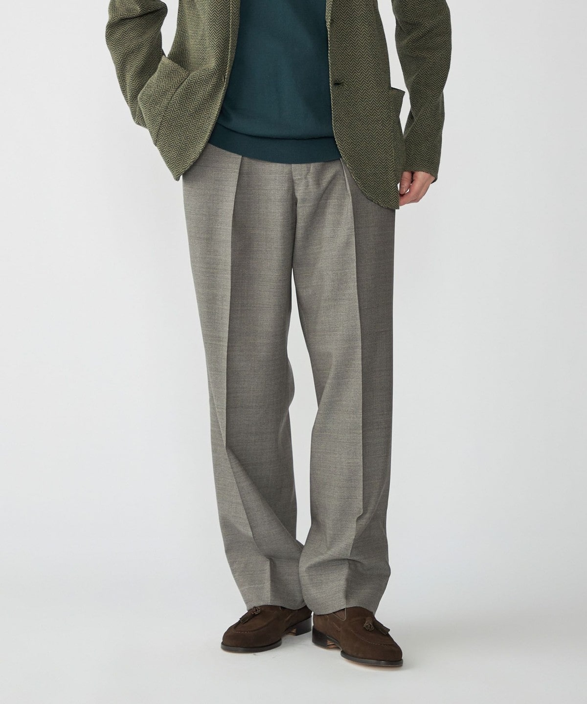 ワイドシルエットではあるもののジャケットに合わせても収まりの良いディテールとなっております。