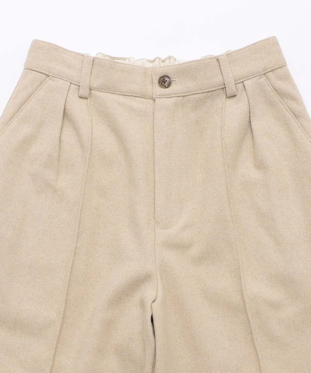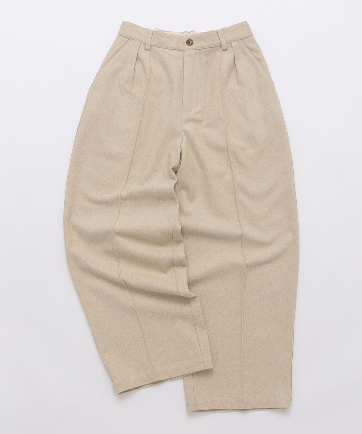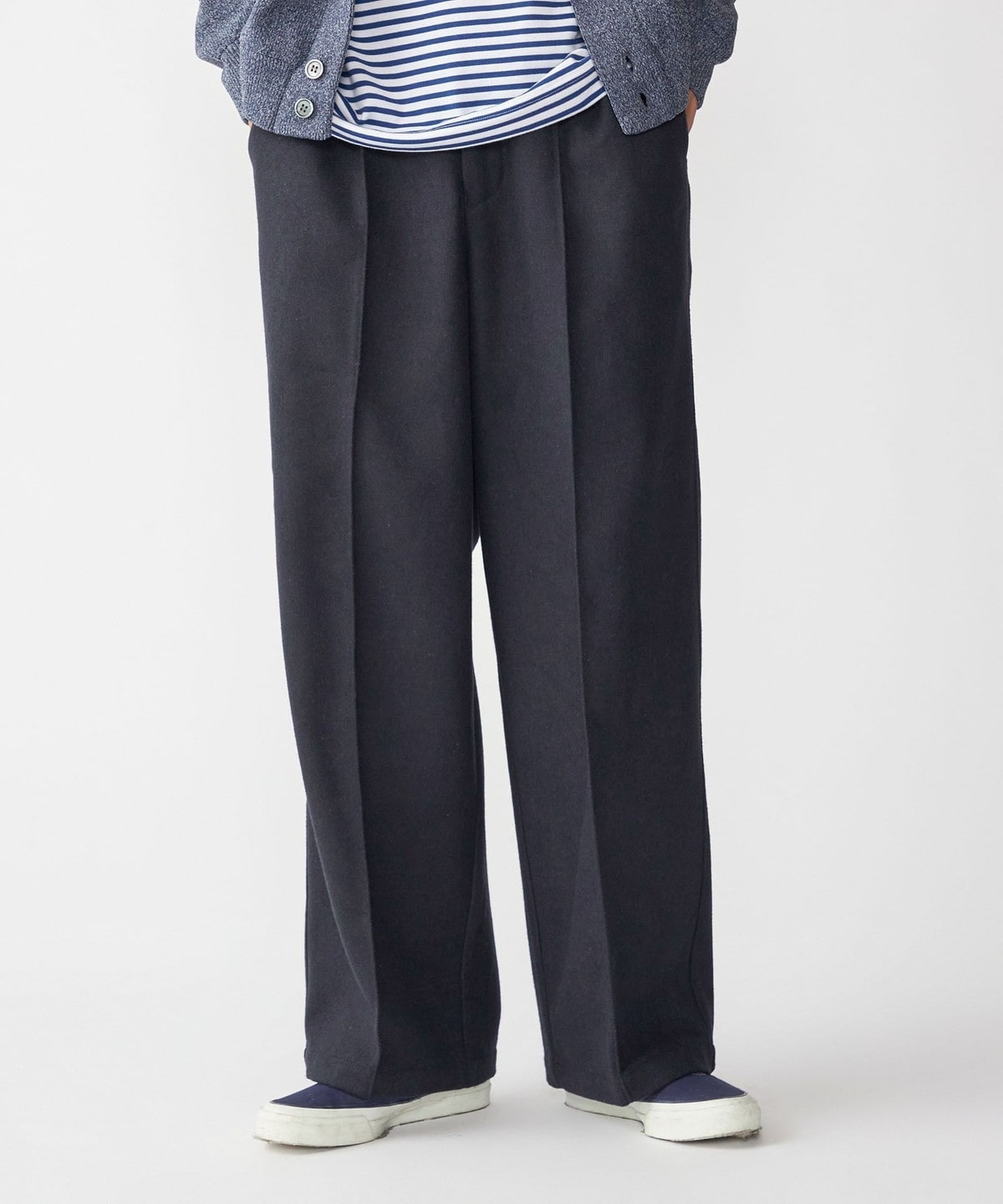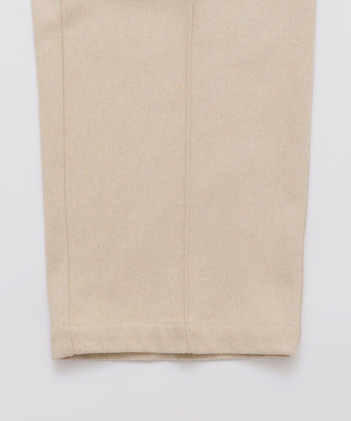 フロントにタックとセンタープレスを入れ脚のラインにすっきりとした印象をだし、ワイドながら様々な年齢層の方にお楽しみいただける一本に。