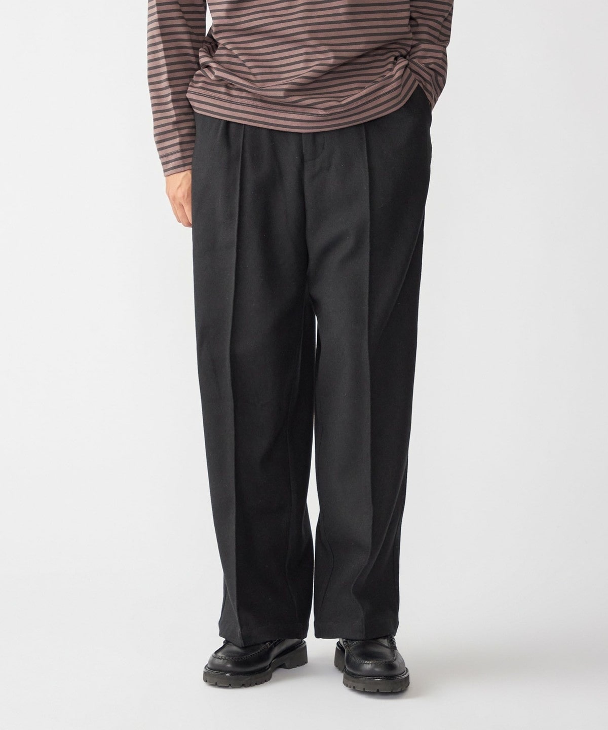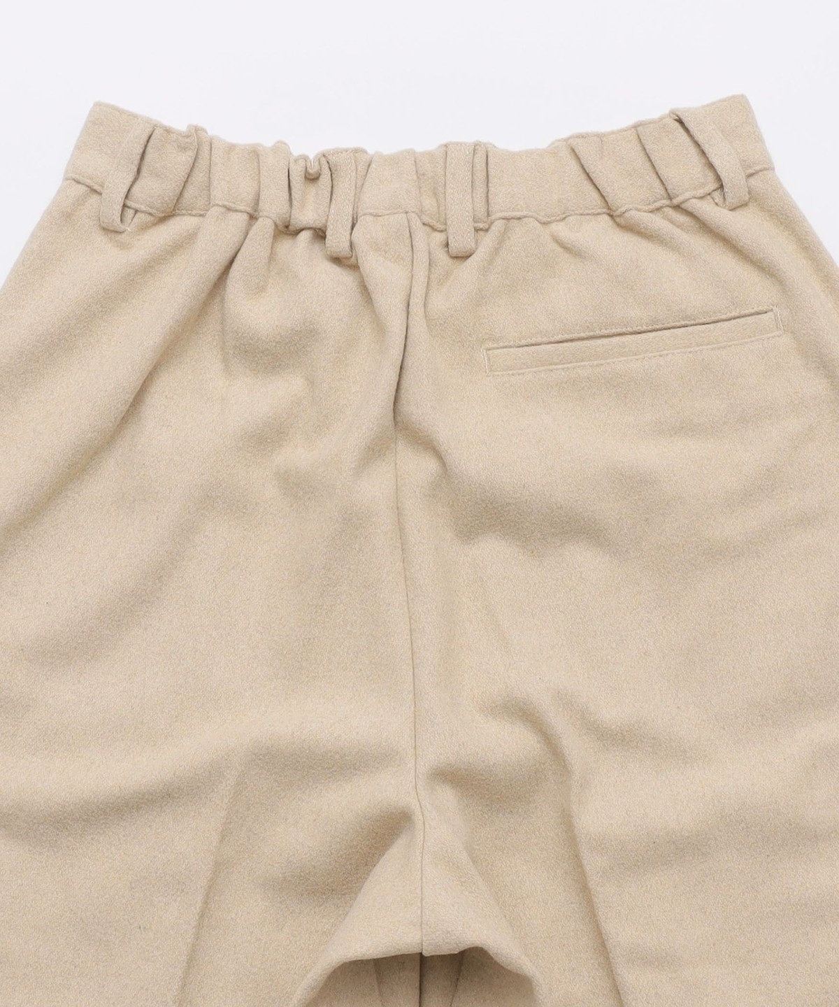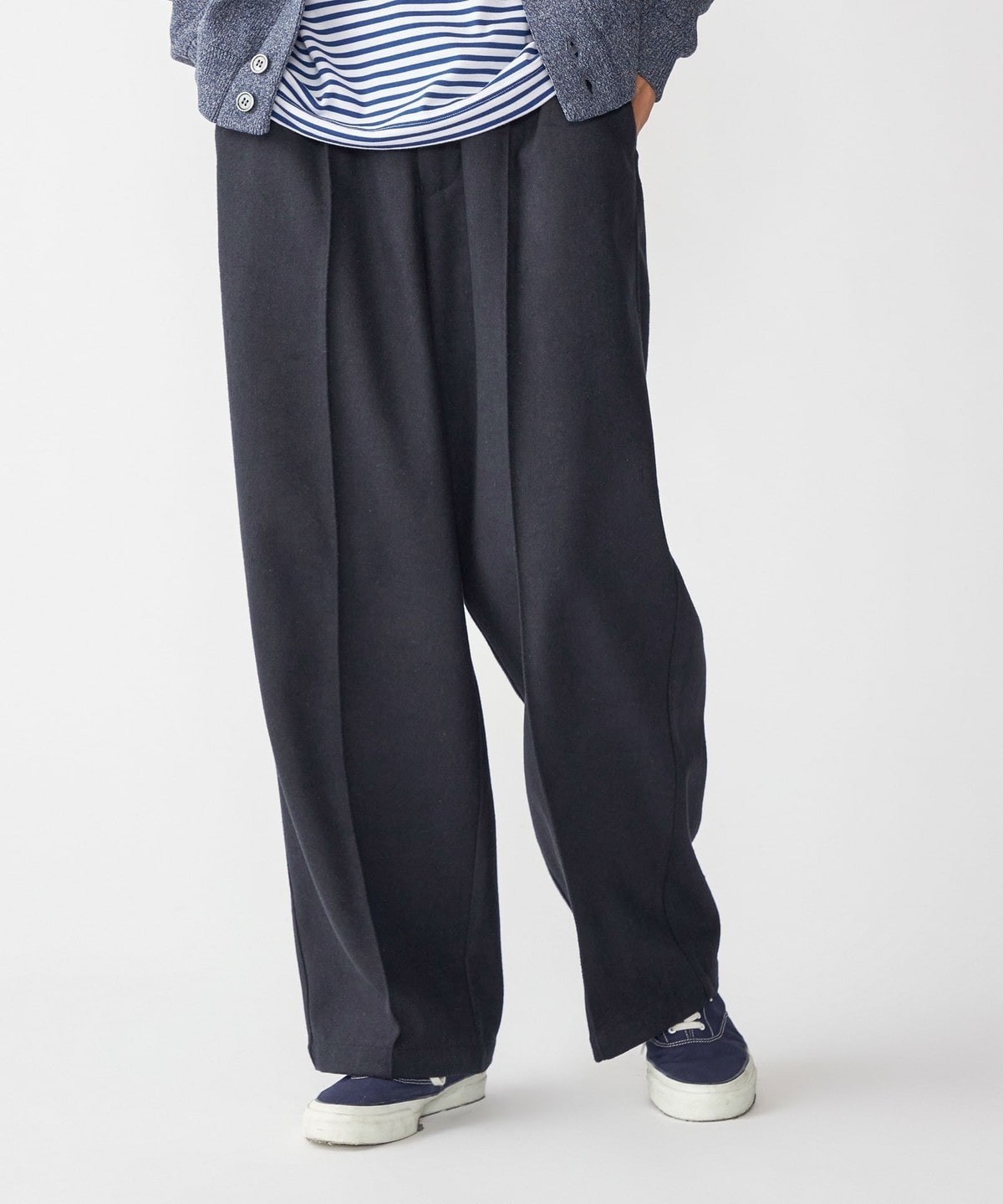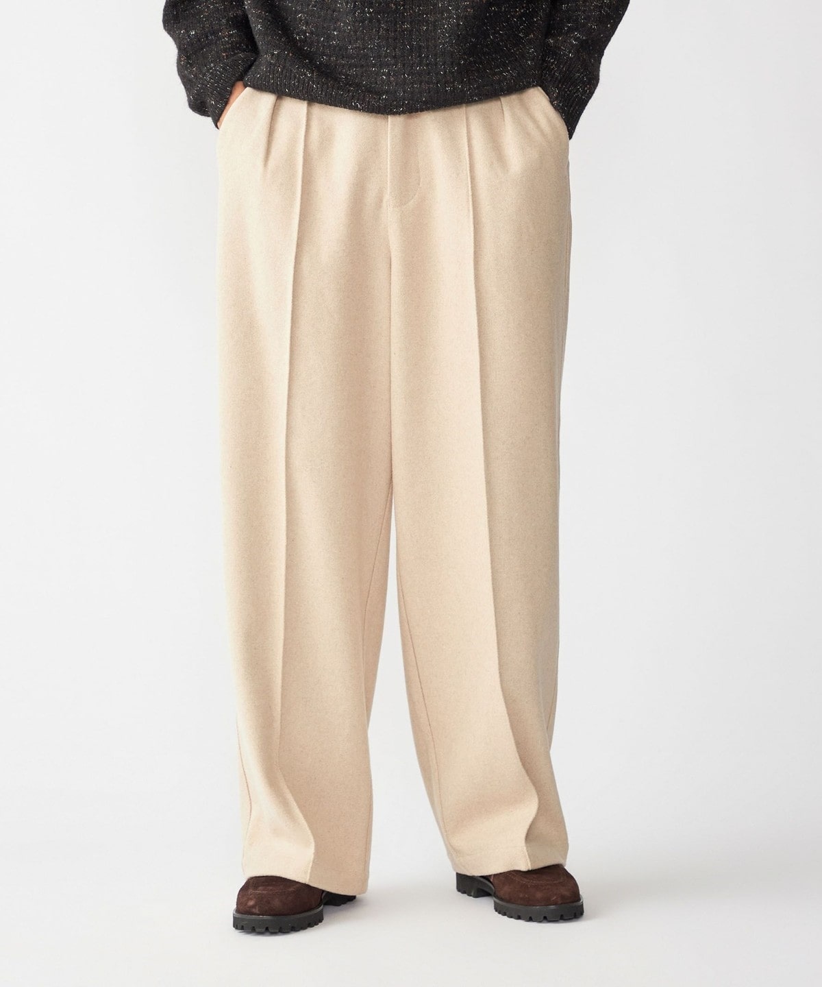 フロントにタックとセンタープレスを入れ脚のラインにすっきりとした印象をだし、ワイドながら様々な年齢層の方にお楽しみいただける一本に。