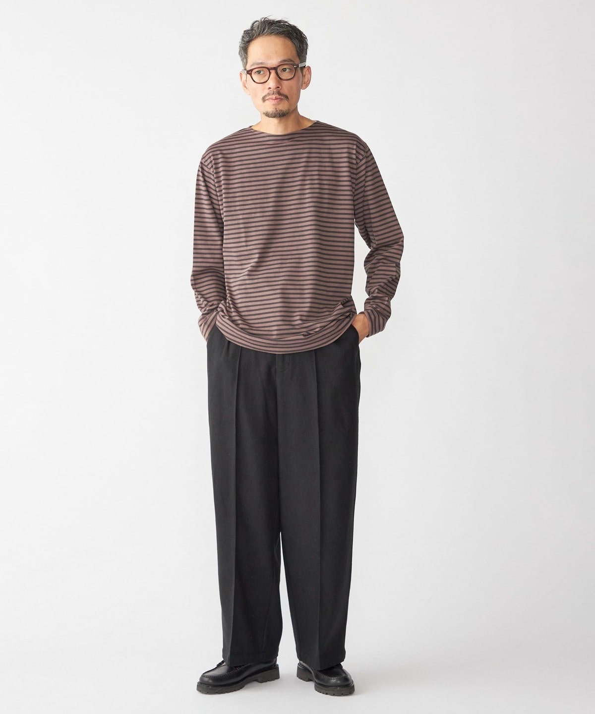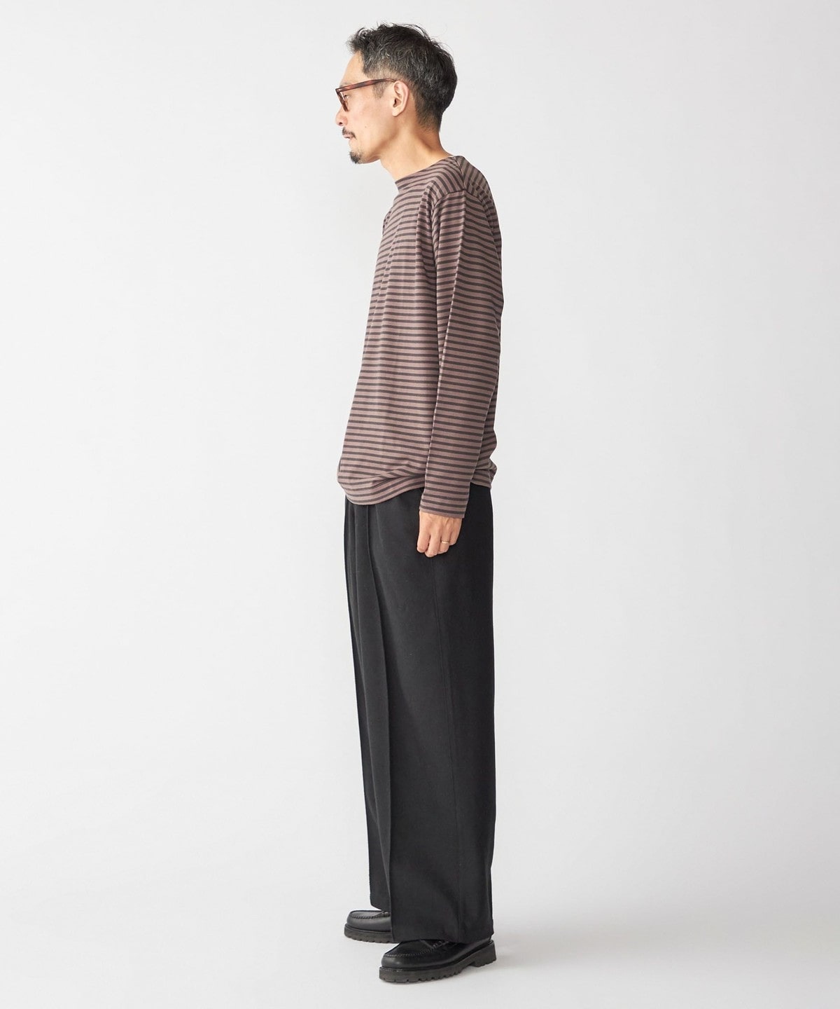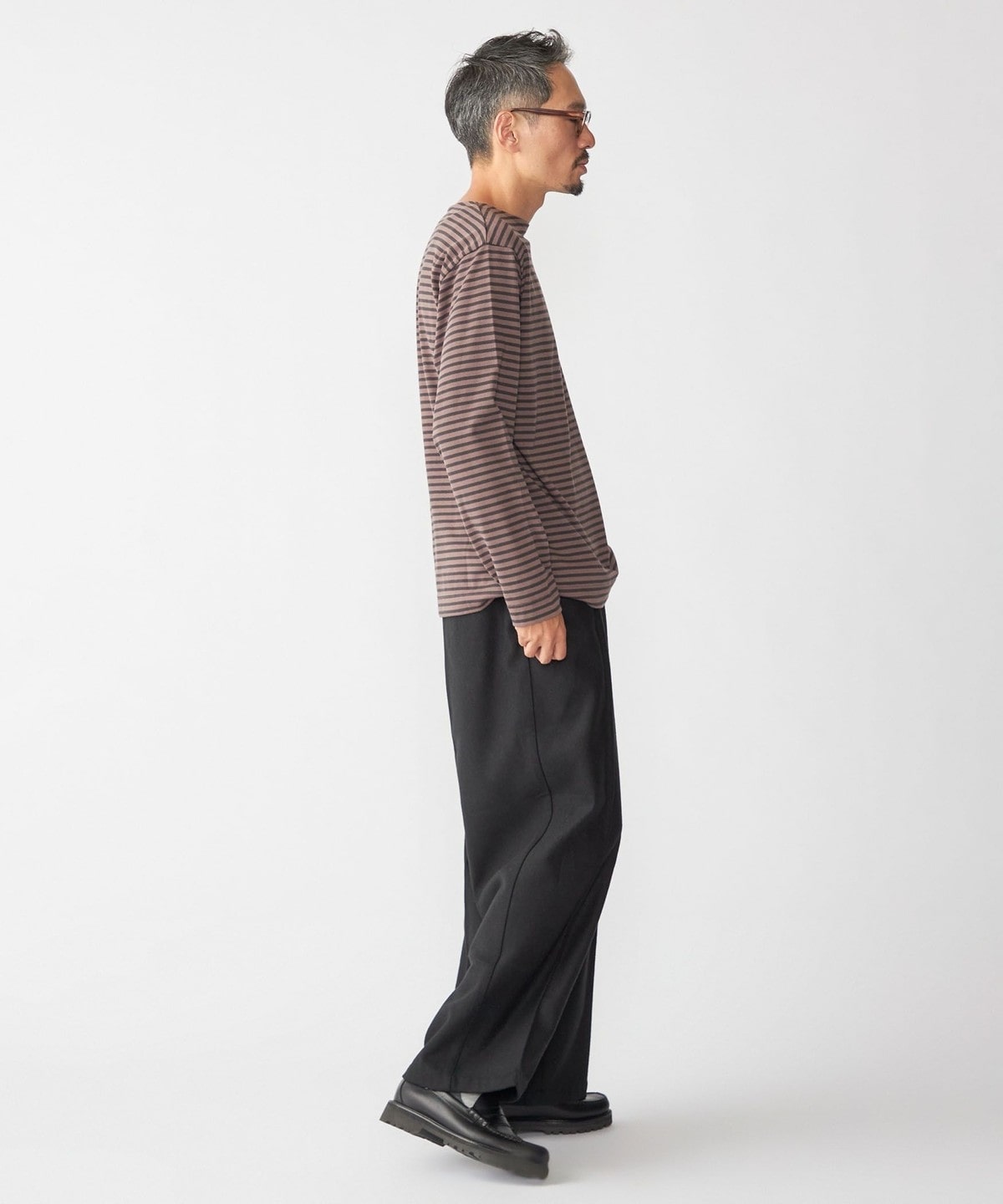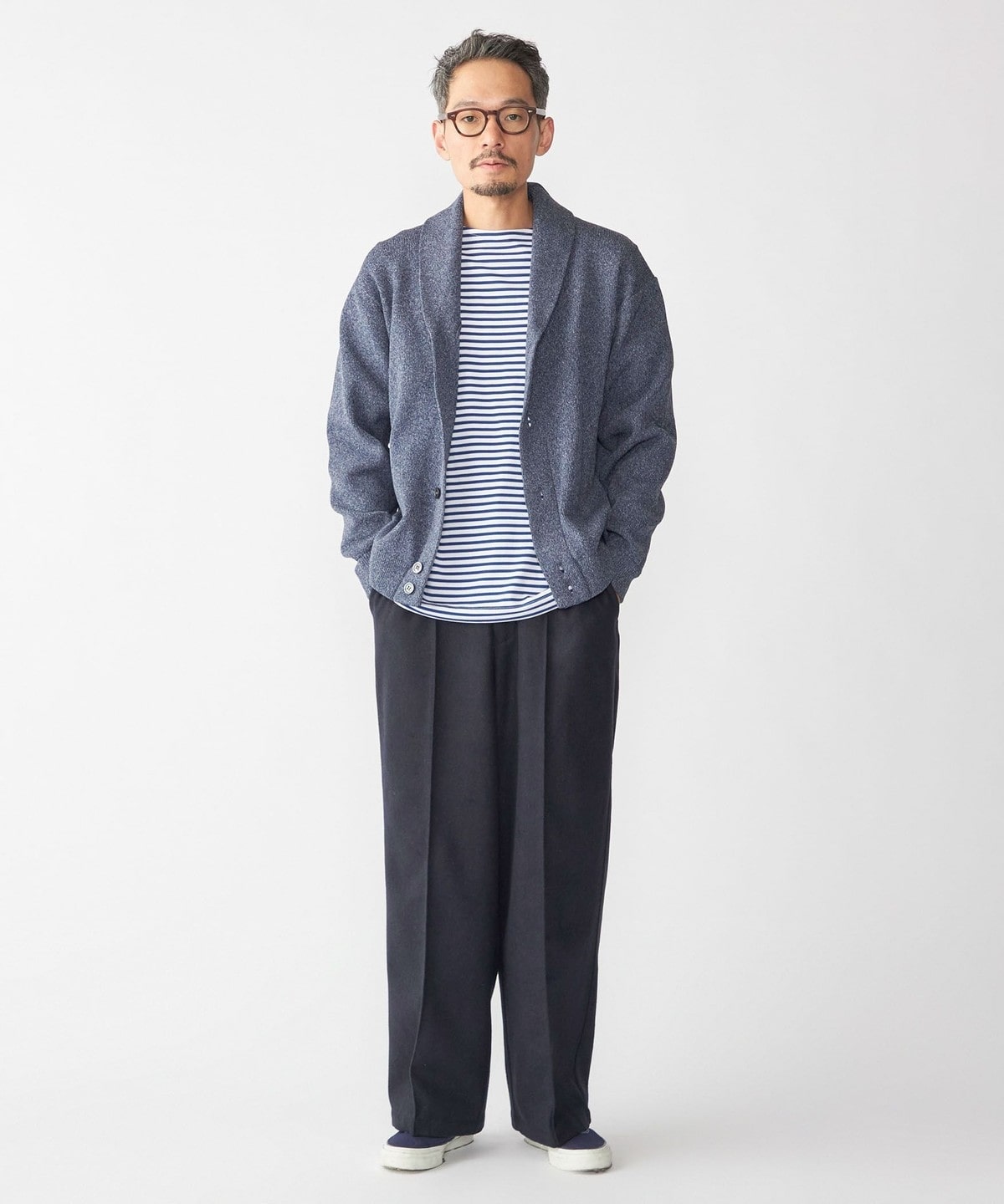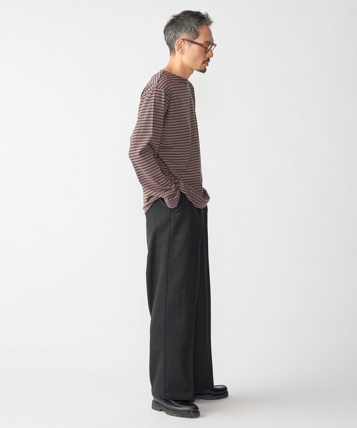 フロントにタックとセンタープレスを入れ脚のラインにすっきりとした印象をだし、ワイドながら様々な年齢層の方にお楽しみいただける一本に。