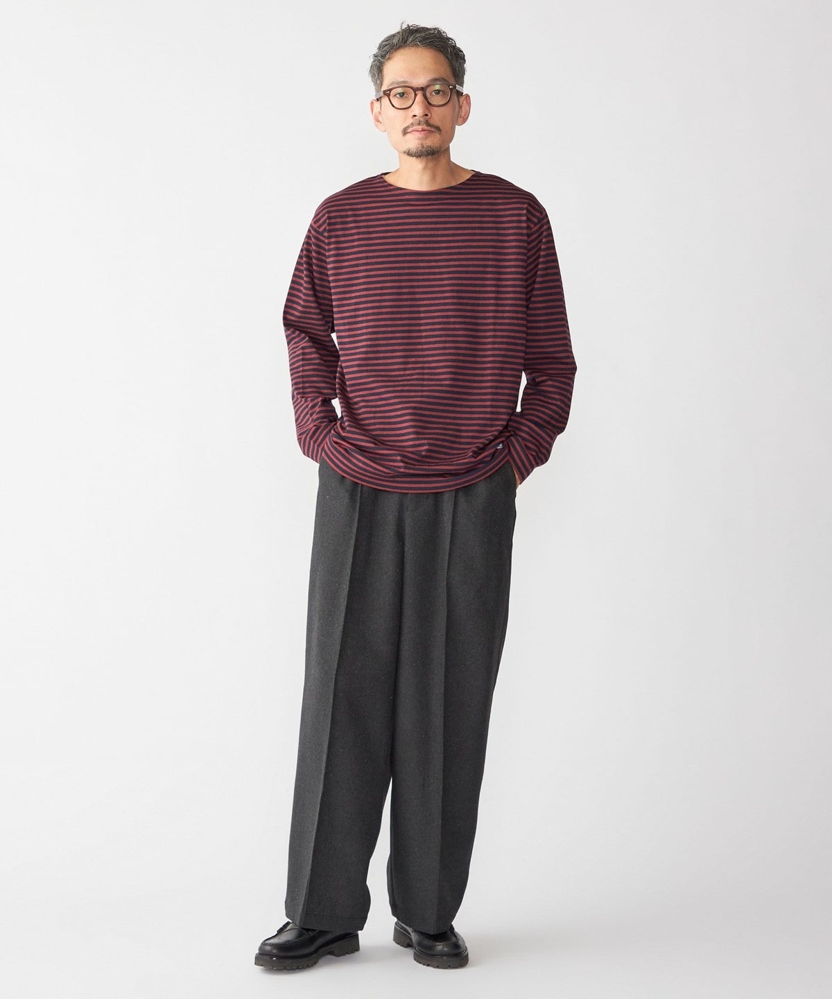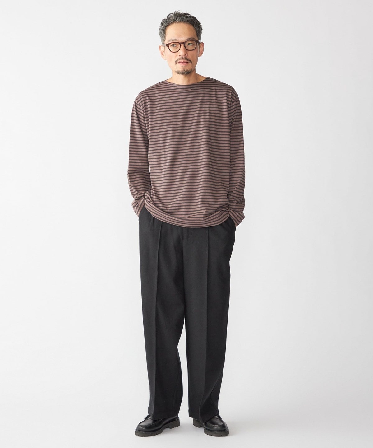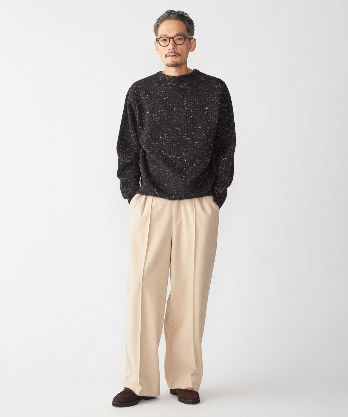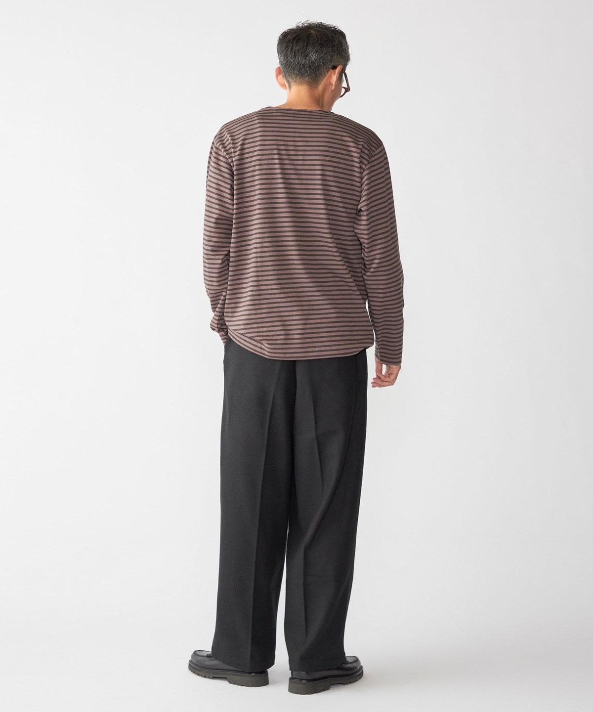 フロントにタックとセンタープレスを入れ脚のラインにすっきりとした印象をだし、ワイドながら様々な年齢層の方にお楽しみいただける一本に。