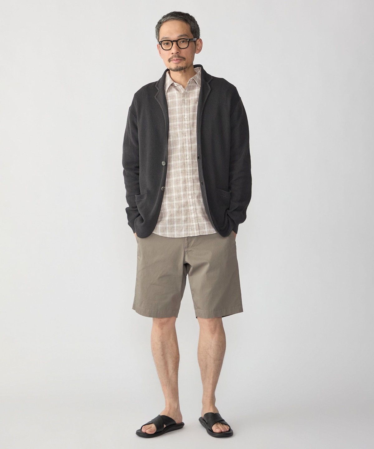 シューズもレザーサンダルにすることでコーディネートが締まります。