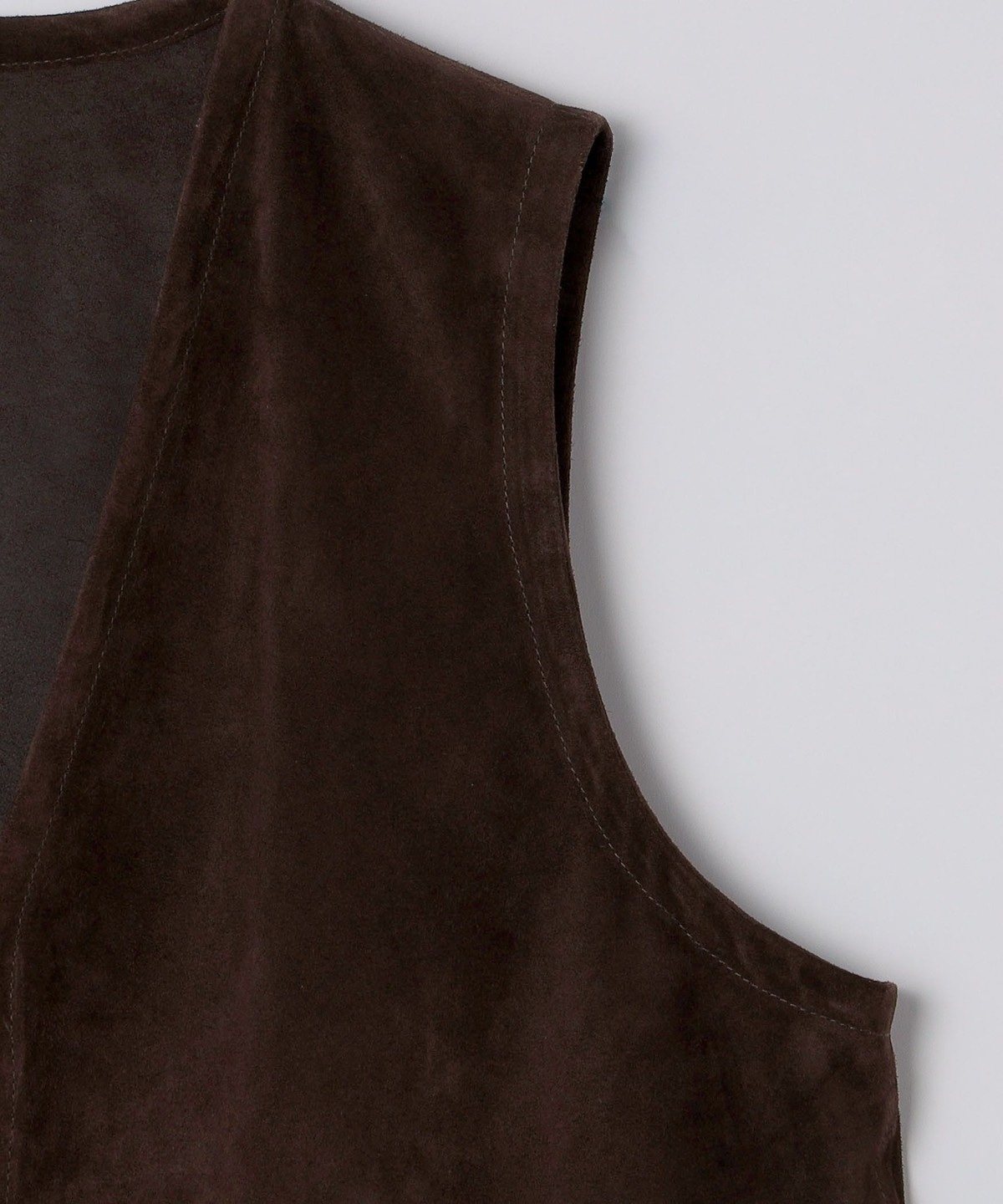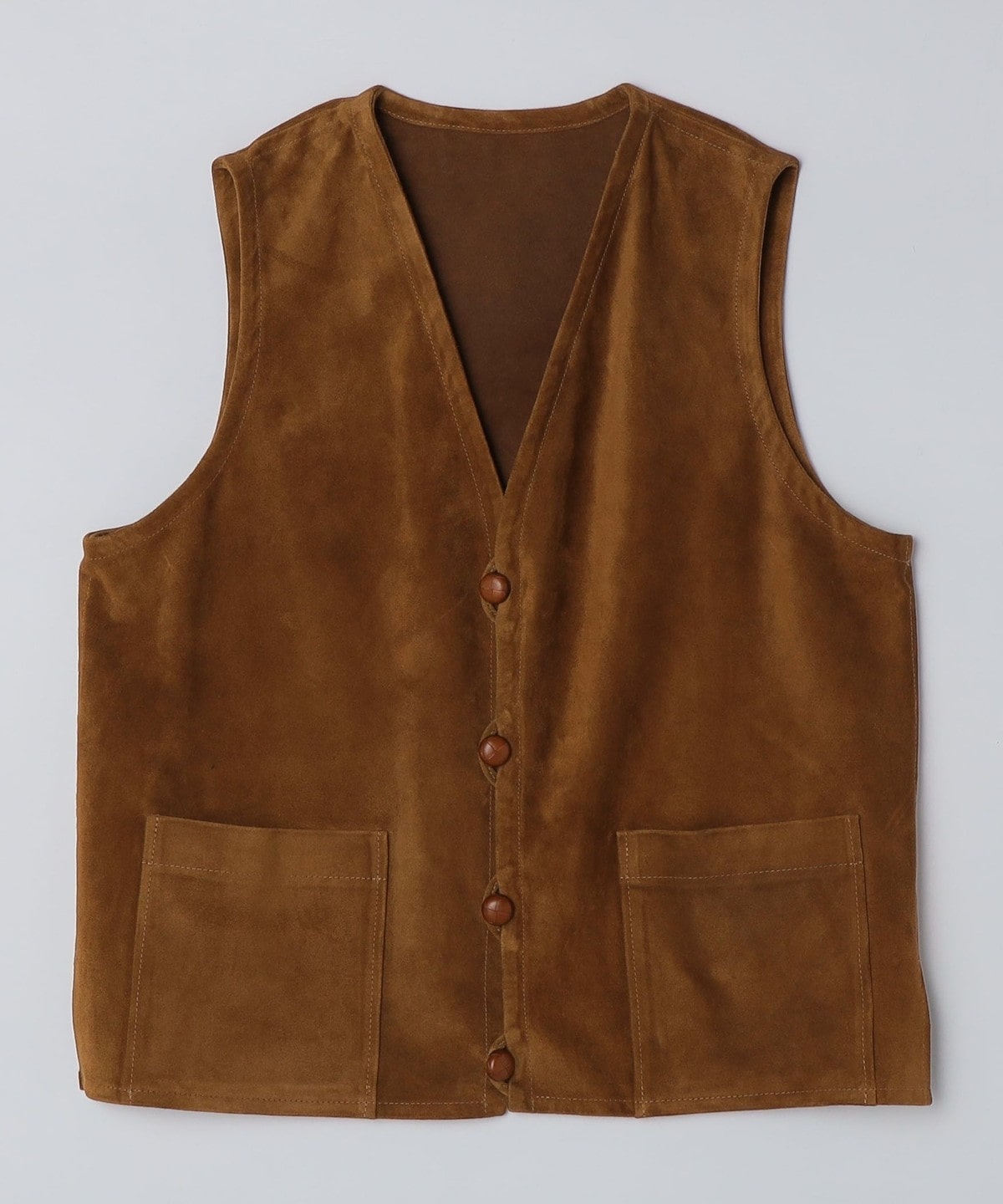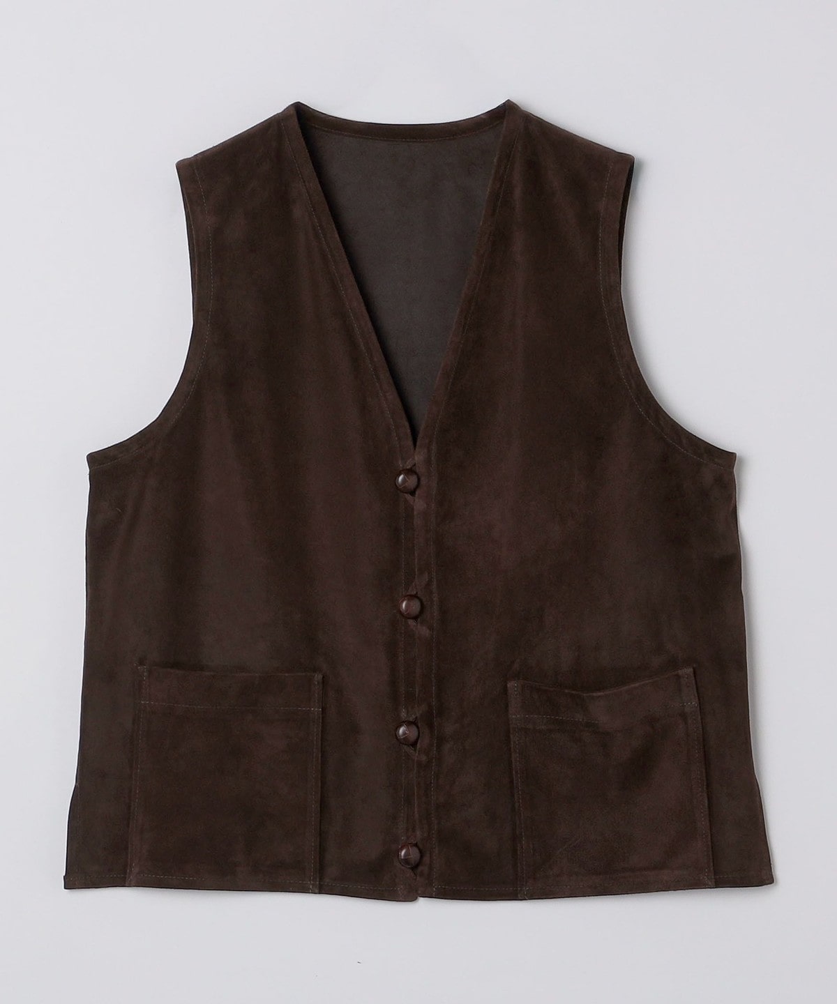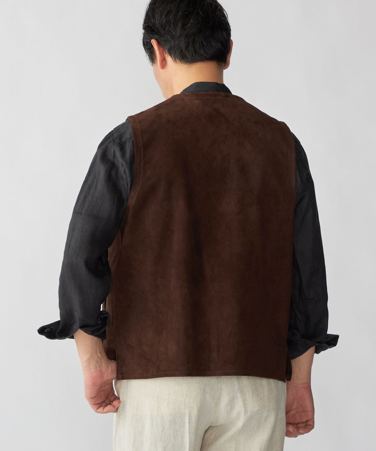 1枚仕立てのソフトな風合いのスエードベストはシャツやカットソーの上に合わせるだけでスタイリングを格上げします。
