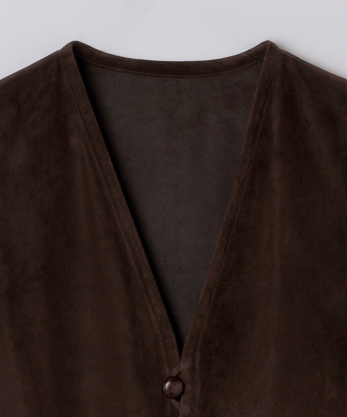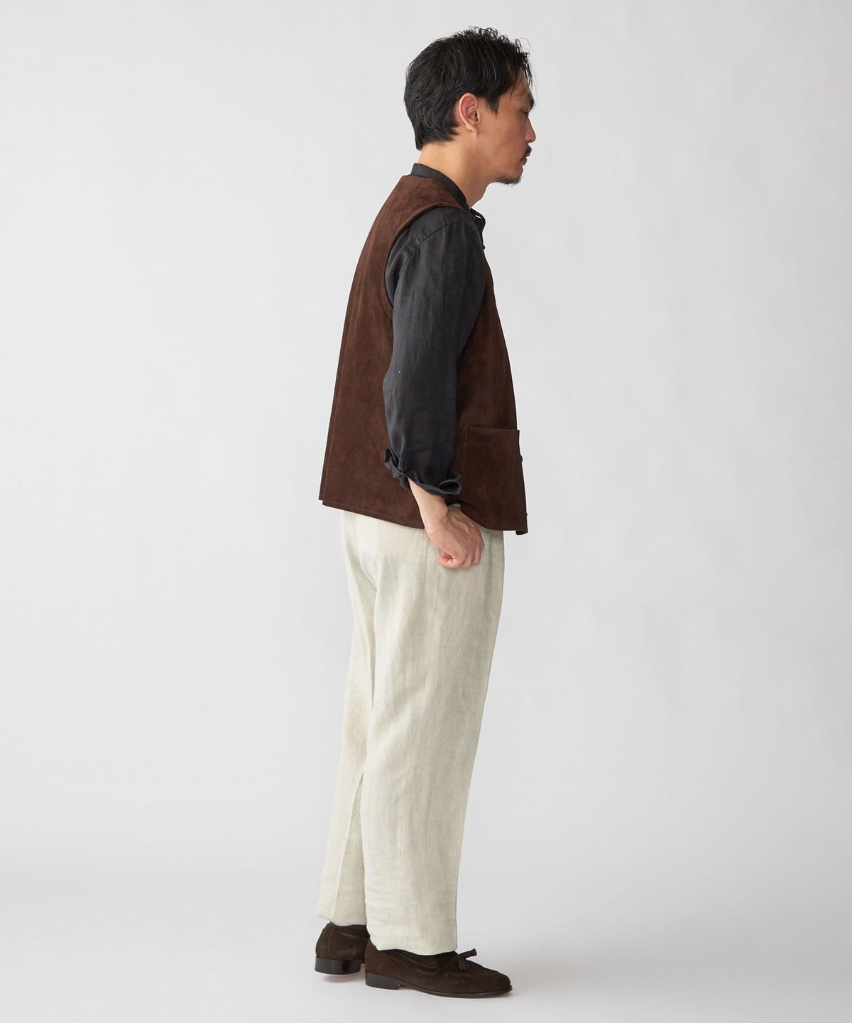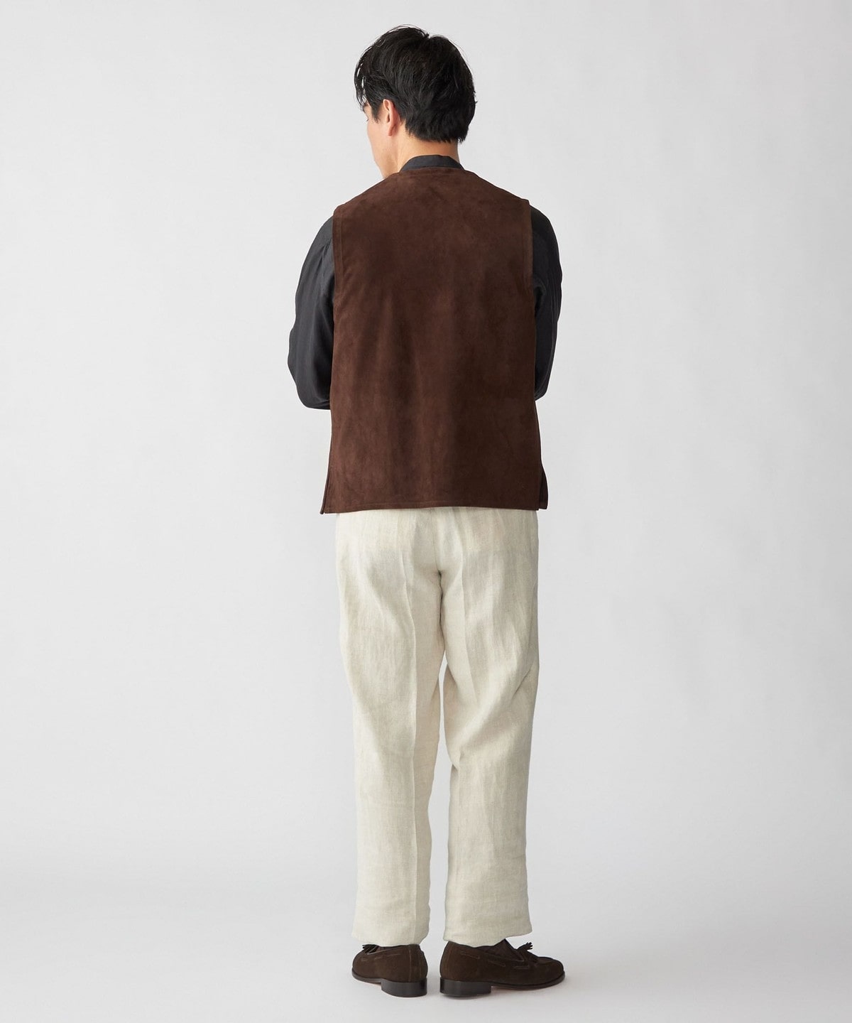1枚仕立てのソフトな風合いのスエードベストはシャツやカットソーの上に合わせるだけでスタイリングを格上げします。
