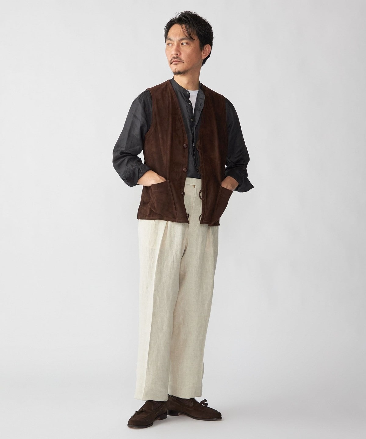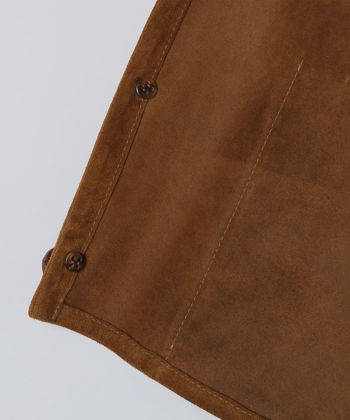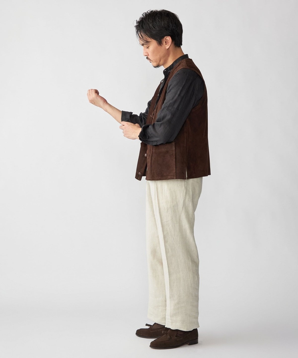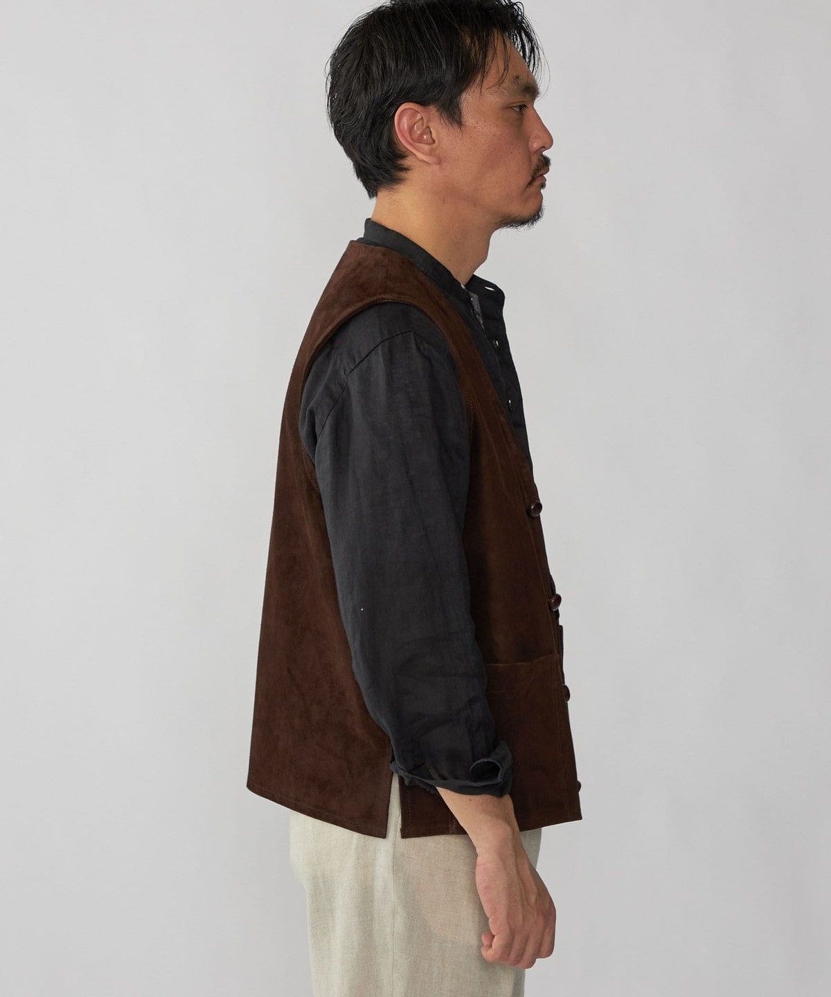 1枚仕立てのソフトな風合いのスエードベストはシャツやカットソーの上に合わせるだけでスタイリングを格上げします。