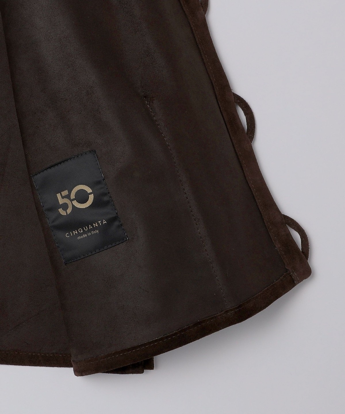 一般的には手織りのウール素材が使用されるチマヨベストですが、スエードを使用することでCINQUANTAらしい上品さと無骨さを兼ね備えた一着に仕上がっております。