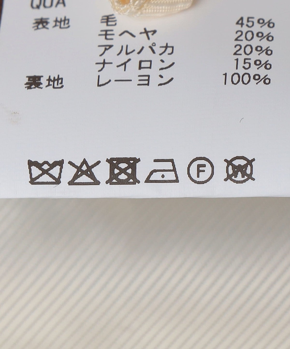 素材:表地: 毛45%, モヘヤ20%, アルパカ20%, ナイロン15%, 裏地: レーヨン100%
